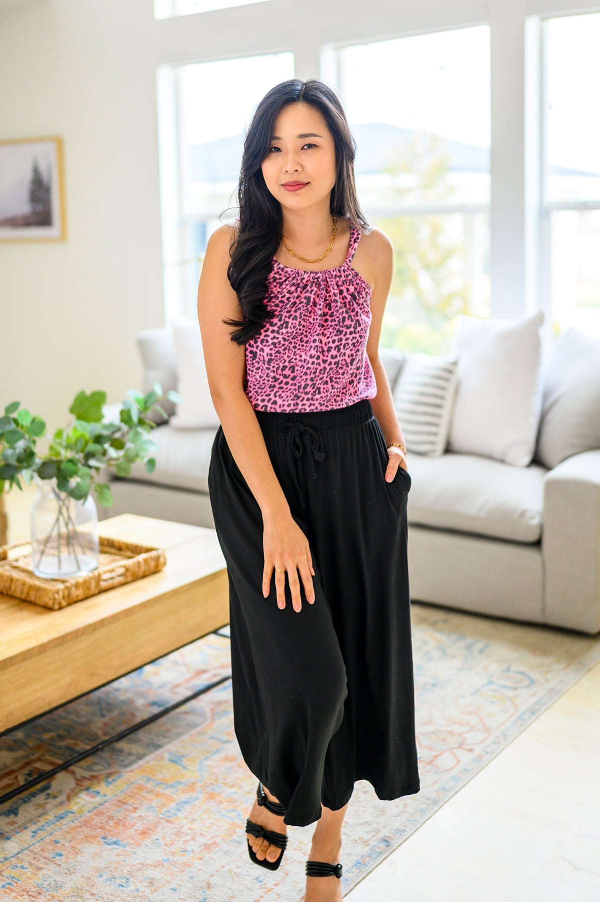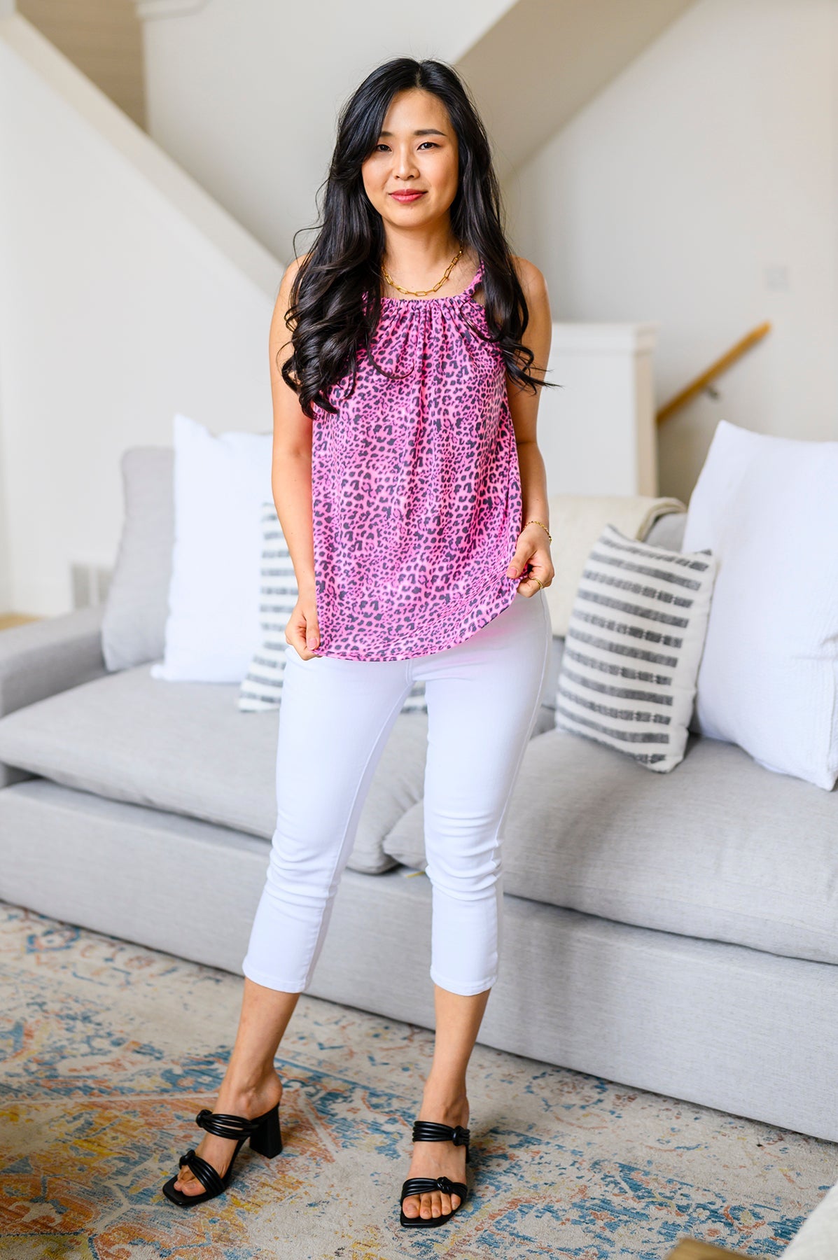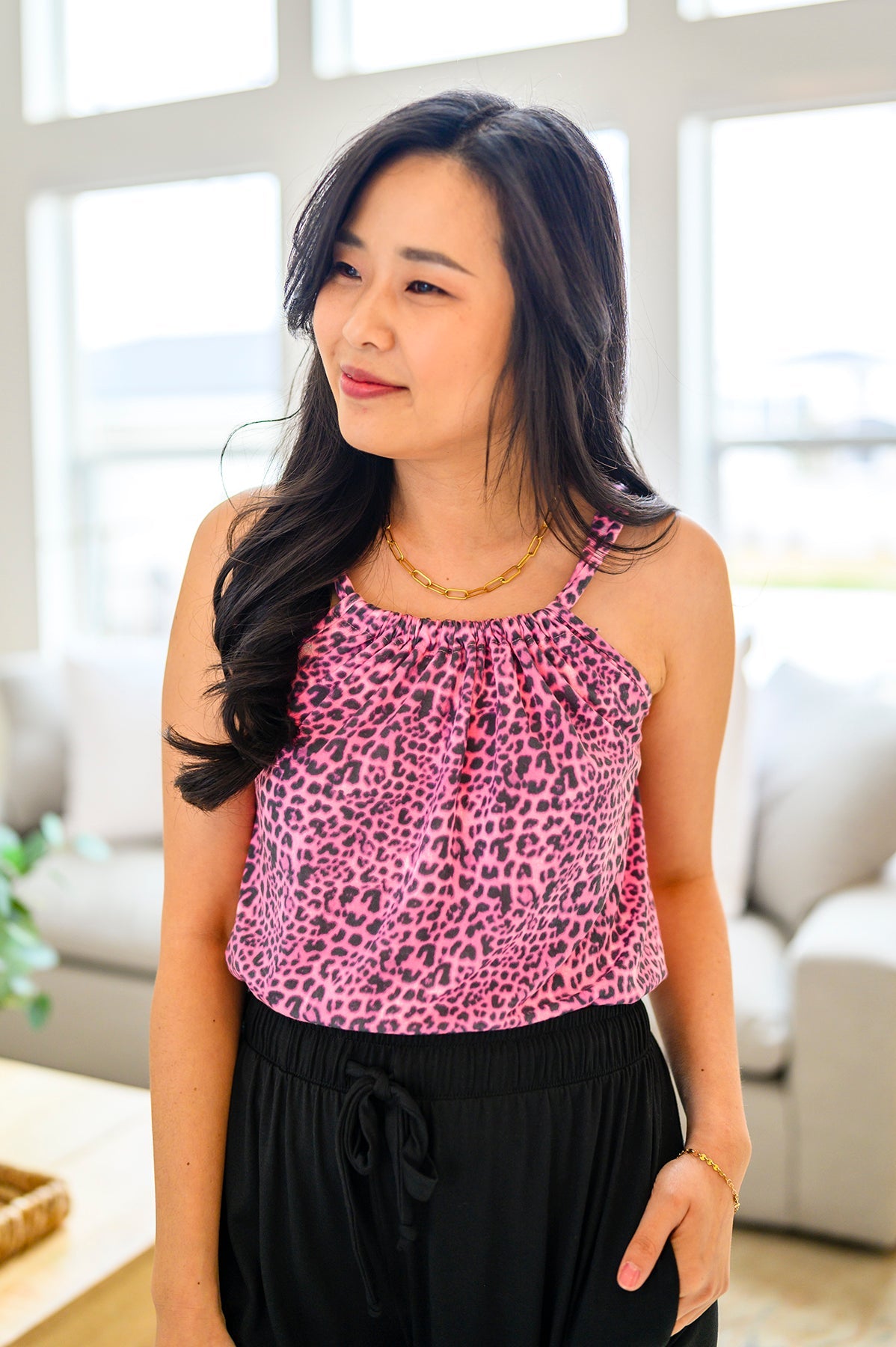 Ready to give 'em something to talk about? The A Little Chit Chat Tank is just the thing! Featuring a gathered halter neckline, an adjustable tie closure at the back, and a fun pink animal print, this flirty tank will make heads turn! Get ready for a little extra attention.