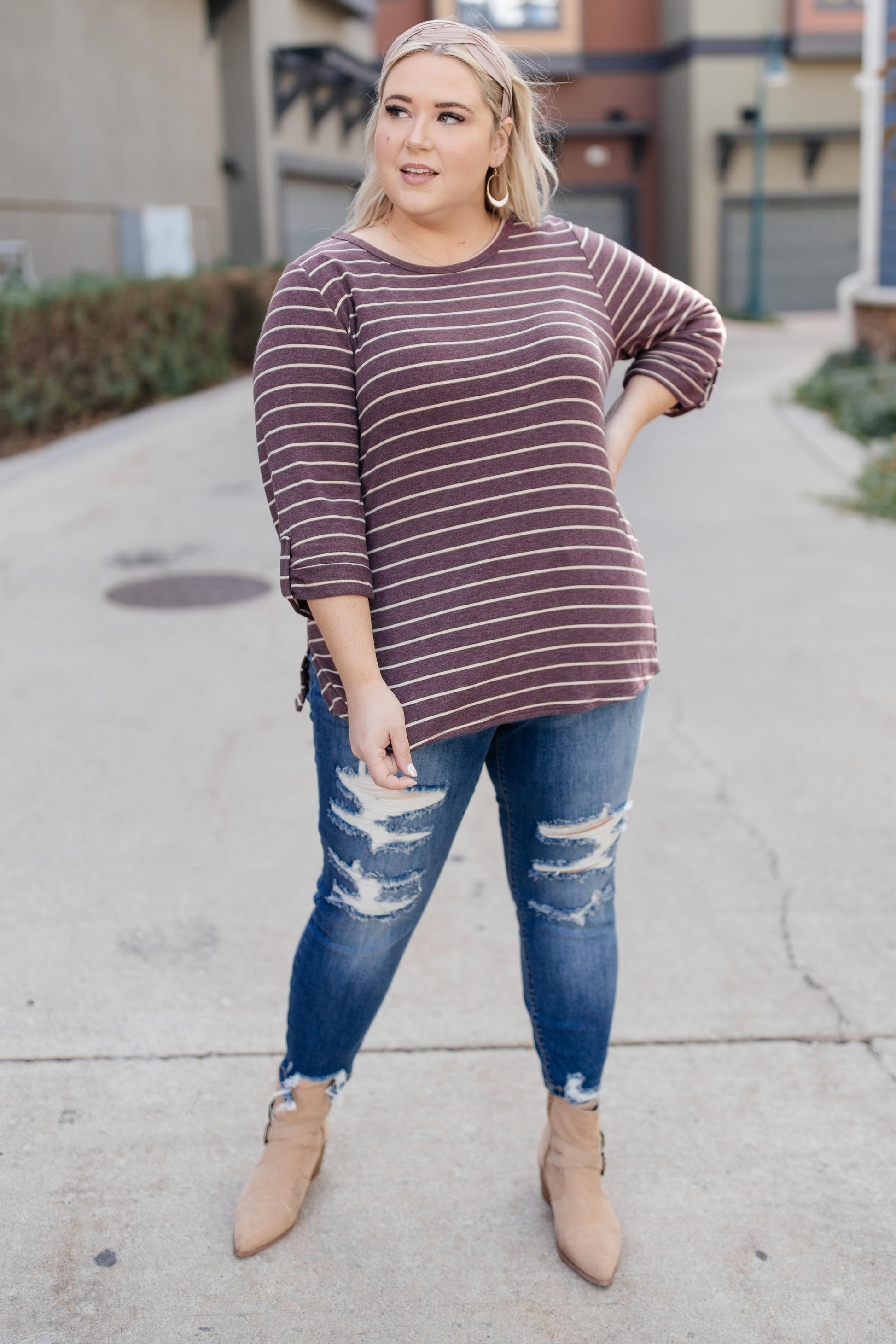 This simple striped tee shirt is a basic staple that belongs in your closet year-round! It's a beautiful sort-of plum color with cream-colored stripe accents. It features rolled cuffs on the sleeves that are sewn so that they cannot be undone. But why you want to undo them?! They look so fabulous as is. That cropped length is modern and very on-trend. You'll adore discovering the millions of ways to style this top.