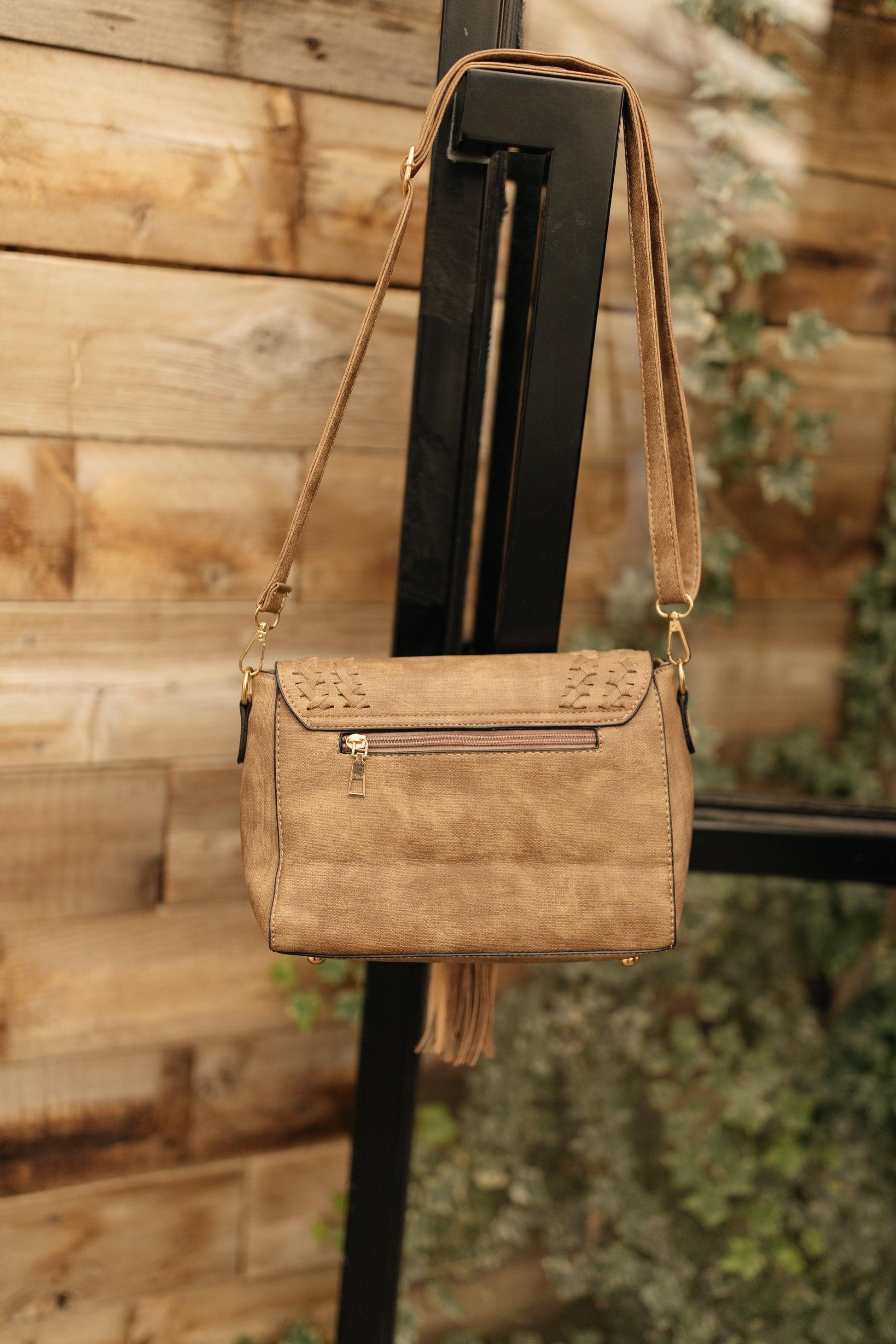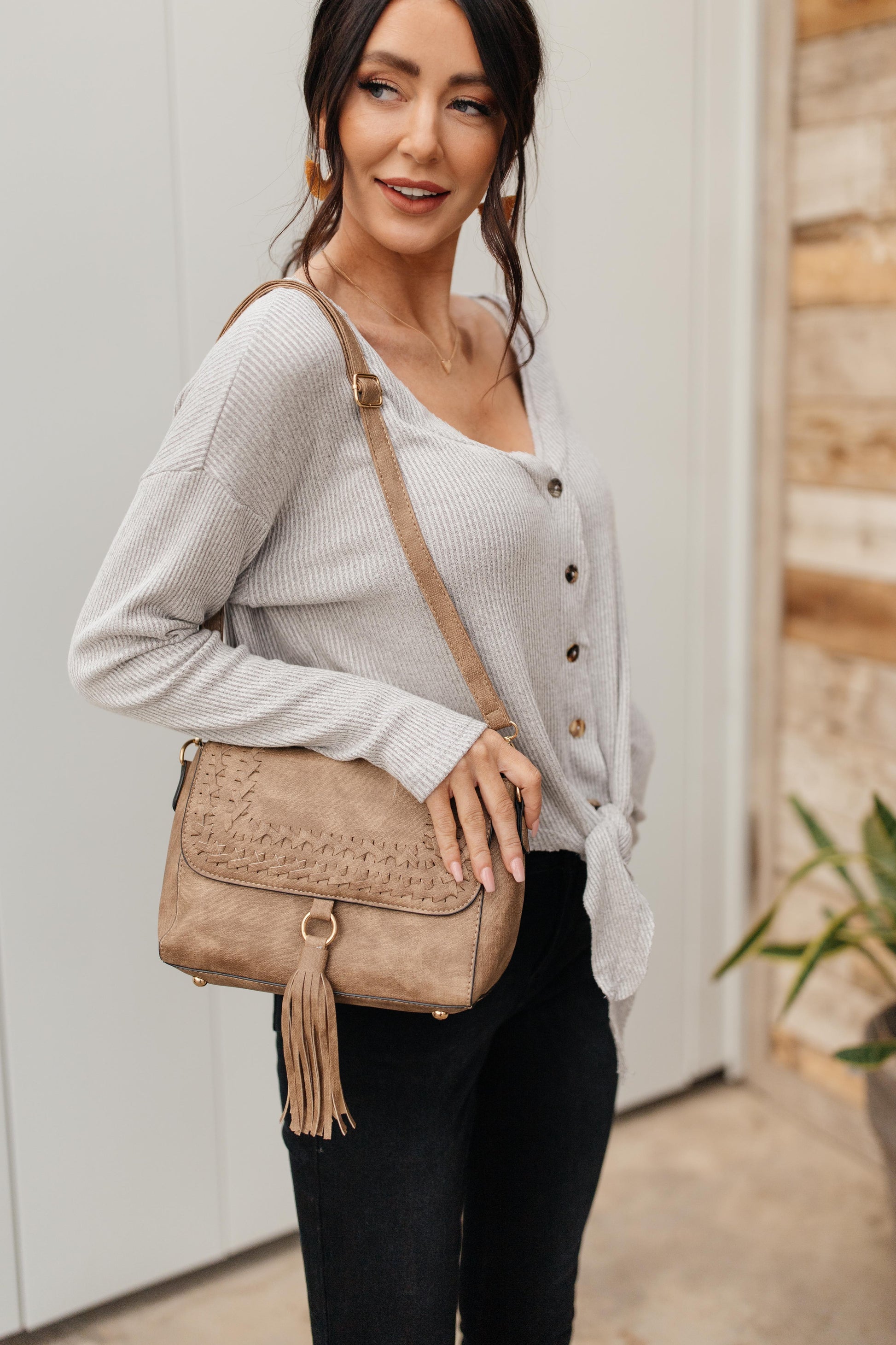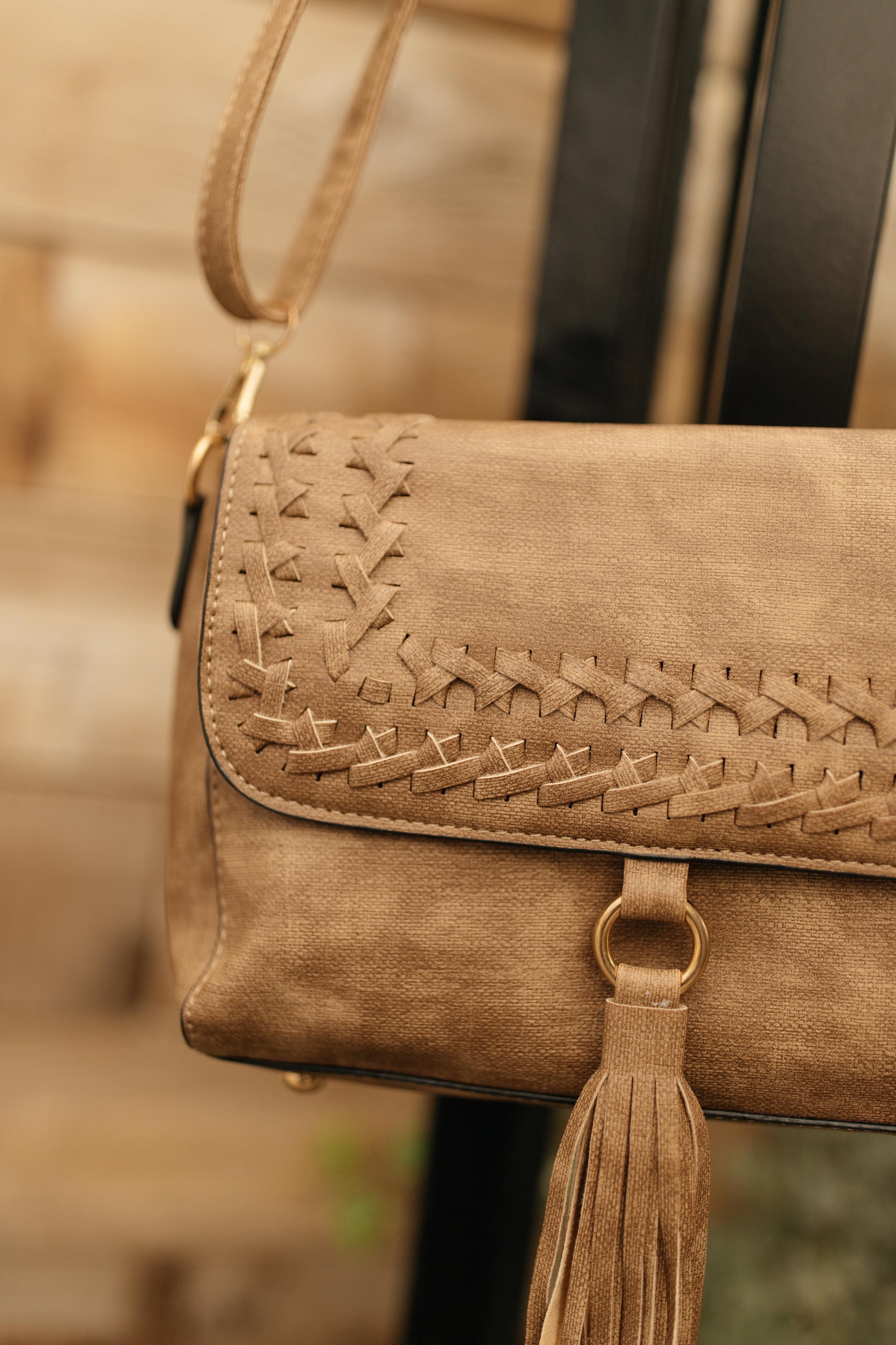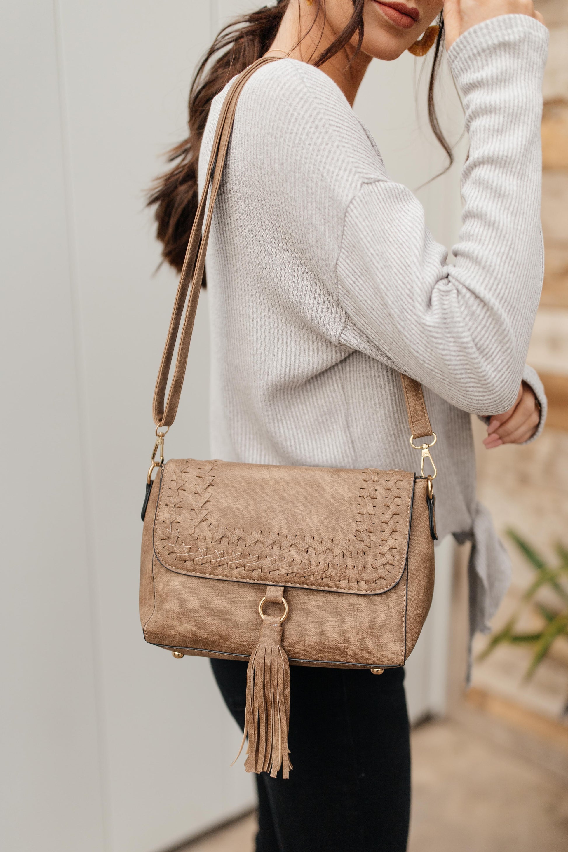 This small transitional bag is so stylish! It features a magnetic clasp closure with a free-hanging tassel detail. You'll also find boho style braided details on the flap. It's a beautiful muted and heathered mocha color and has an adjustable and removable side strap.