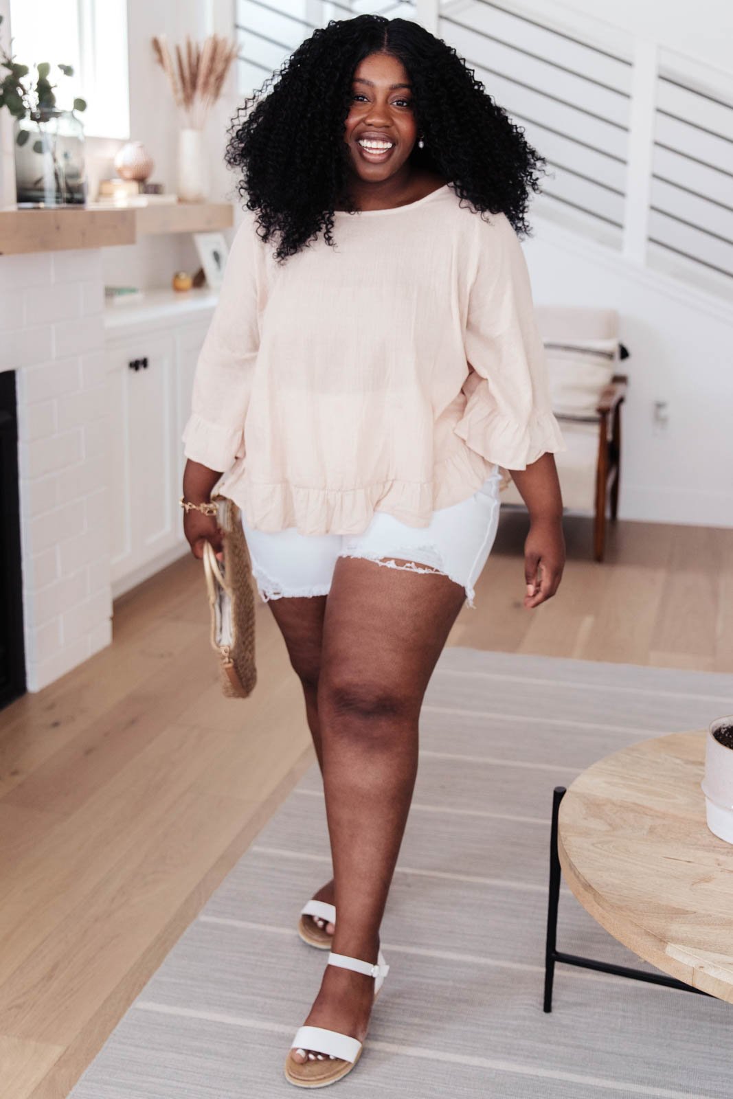The Cascading Ruffles Top offers a unique silhouette in a classic neutral color. With a high neckline and dramatic sleeves, this poncho style shirt is lightweight and breezy. Wear this top with slim fit denim and pair it with gold jewelry for a classy outfit.