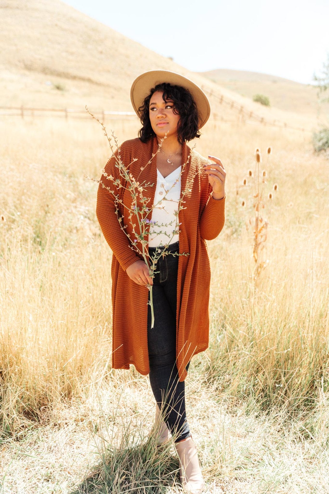 The Catch Me Cardigan is the perfect burnt orange color to add to your closet! This stunning cardigan is lightweight and soft and the long length creates beautiful movement. This gorgeous layering piece is perfect to throw over a blouse or bodysuit for an afternoon out in the fresh air!