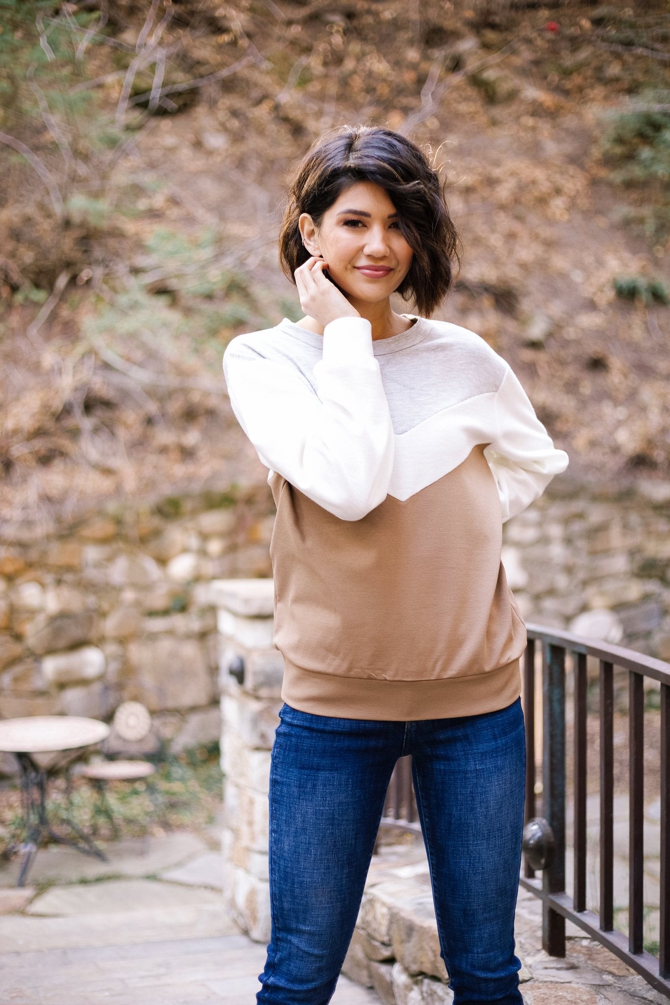 There I go again, waxing poetic about clothes, but sometimes I can't help it. This soft pullover is made for two kinds of knit: heather gray and white are lightweight, but the khaki is heavy and weighted so the chevron maintains it's nice crisp shape!