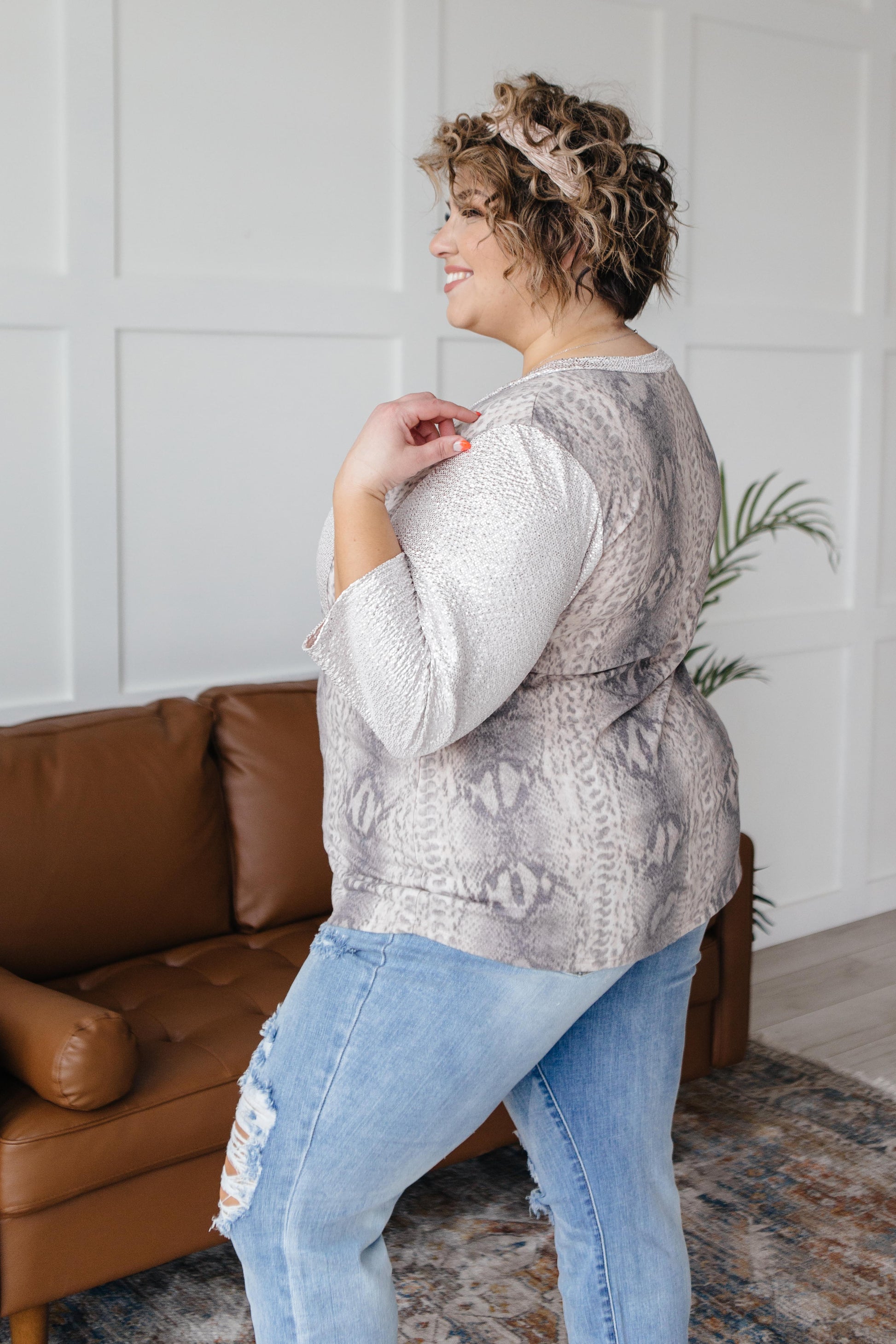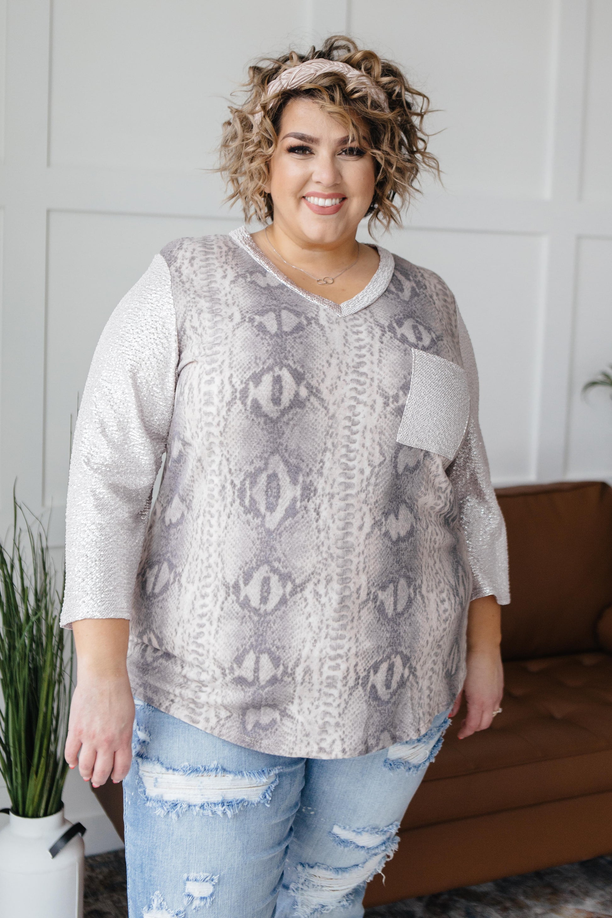This snakeskin top is extra bold and fashion-forward! It features shimmery glitter fabric on the three-quarter length sleeves, lining the v-neckline, and on the functional pocket detail. It's also lightweight and stretchy. You'll feel comfortable and confident all day!