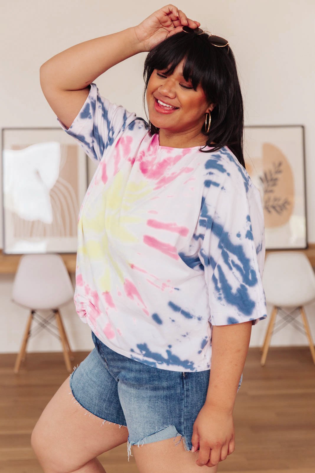 This tye-die tunic will be the top you reach for on your way out your door this summer. It's relaxed fit, darling scrunch feature on the front and it's on-trend pattern will leave you comfortable to do all of your favorite summer activities, and look on-point while doing them. Pair it with your favorite denim and sneakers to take on the summer sun.