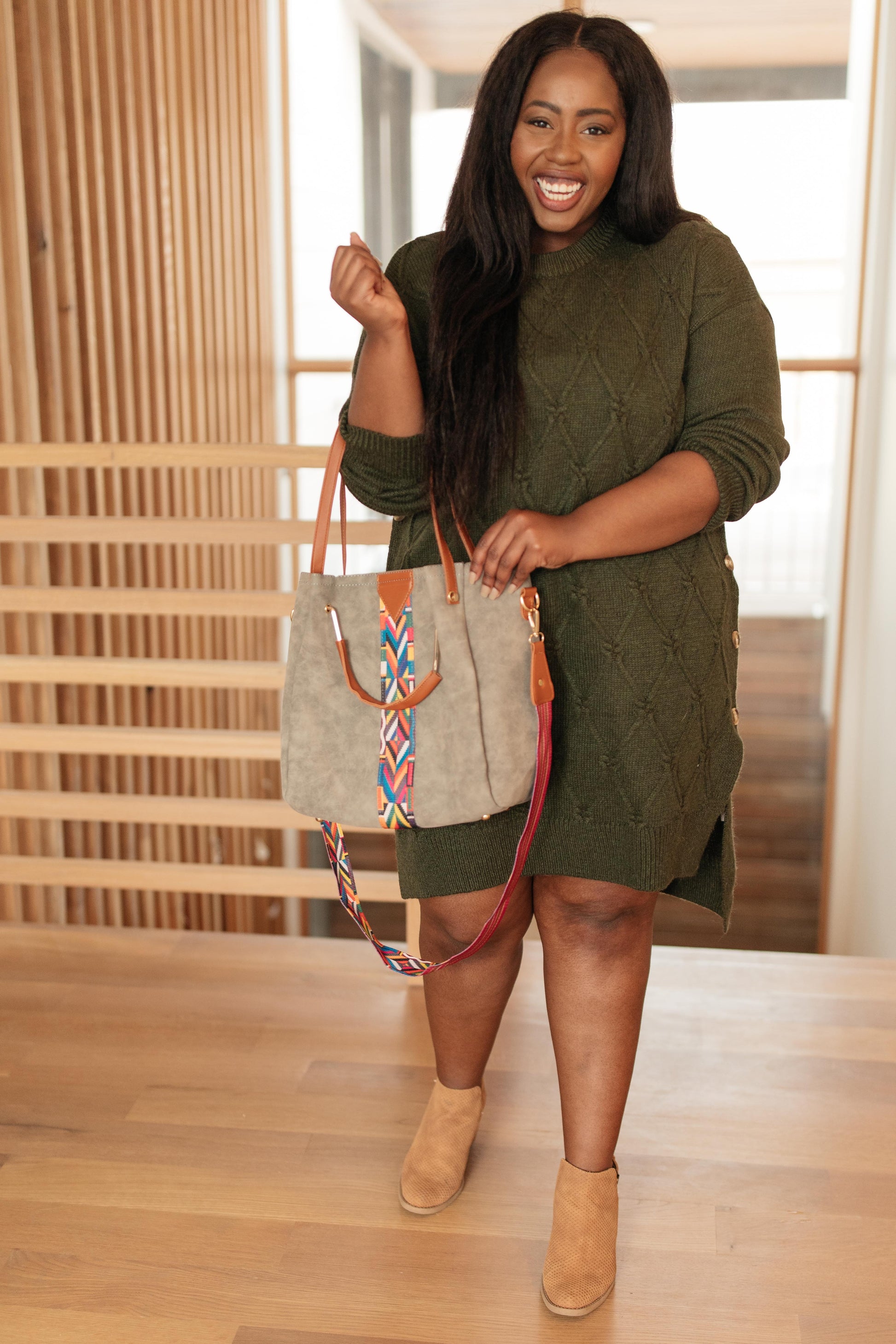 This tote bag is not only the perfect size, but it's also the perfect color! It's a beautiful shade of gray that is neutral enough to match all of your outfits, but also will be that pop of color you needed! It's made from faux leather, it features tan straps, and it has a contrasting strip of design and color running down the front. This tote is sure to meet all your bag needs!