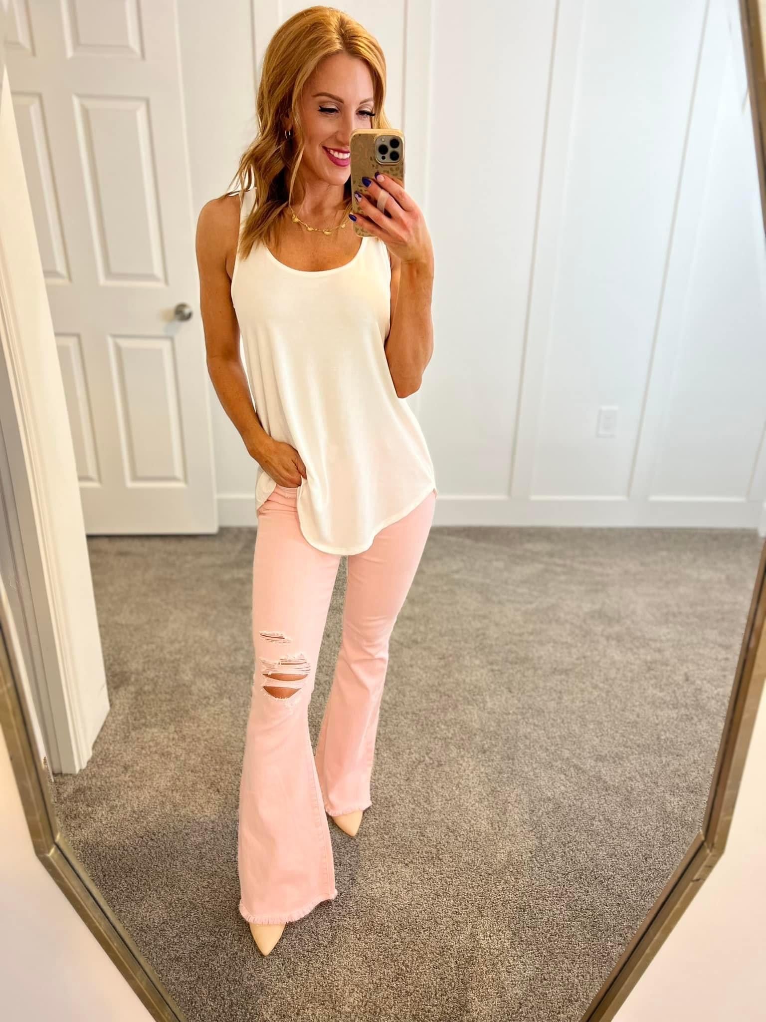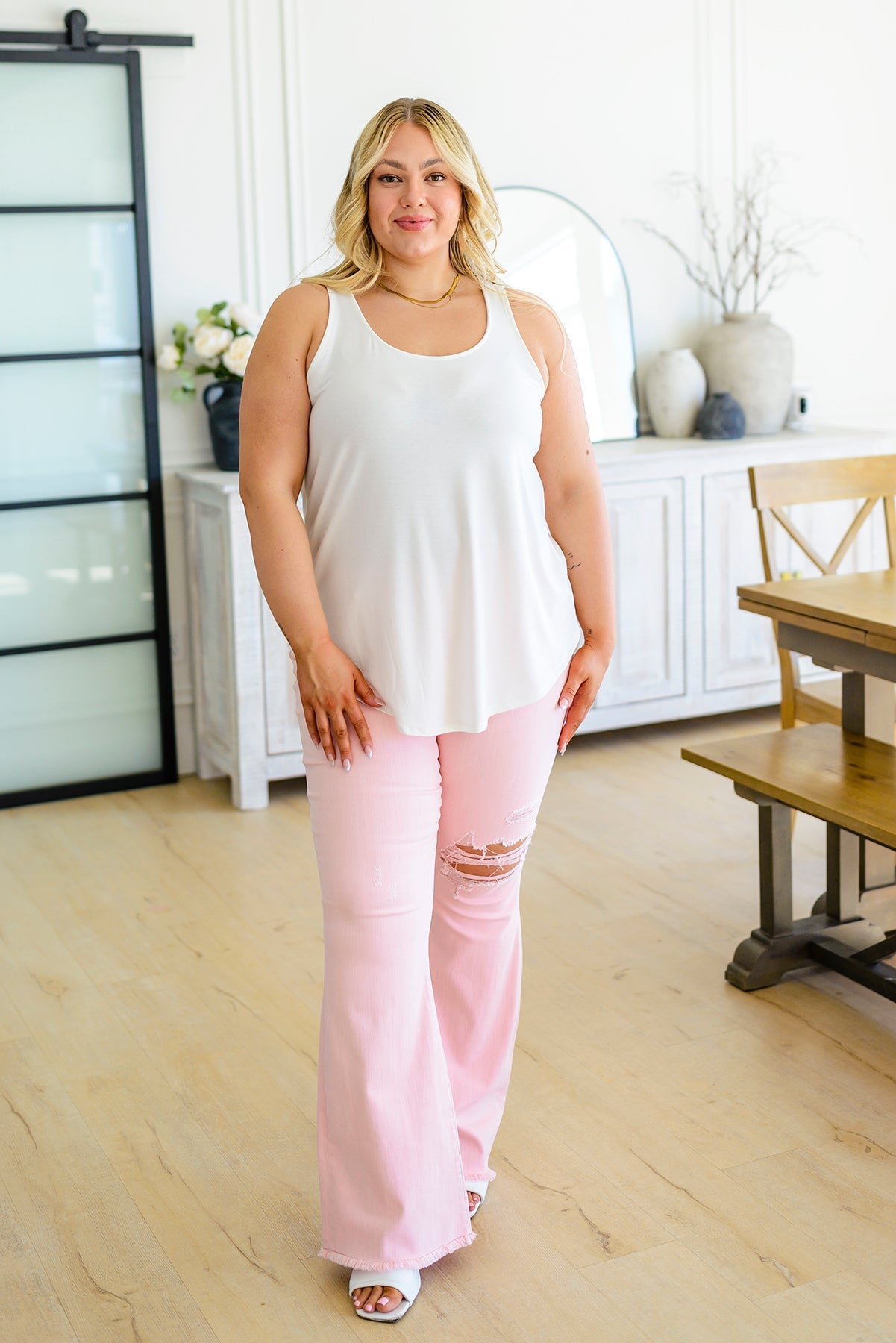 Feminine Flair Mid Rise Distressed Flares in Pastel Pink