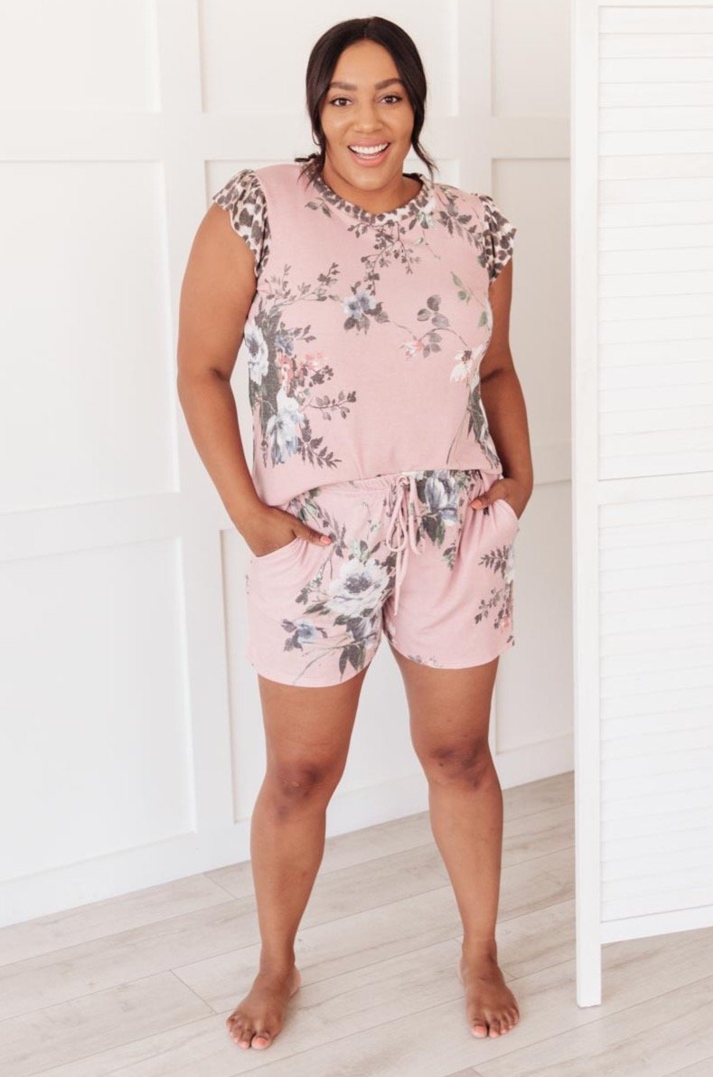 Floral and animal print details come together perfectly in the Floral Wild Side Lounge Bottoms In Mauve. The elastic waist and soft fabric make these the perfect lounge shorts. Pair them with the matching top, or your favorite classic white tee for a cute and casual outfit.