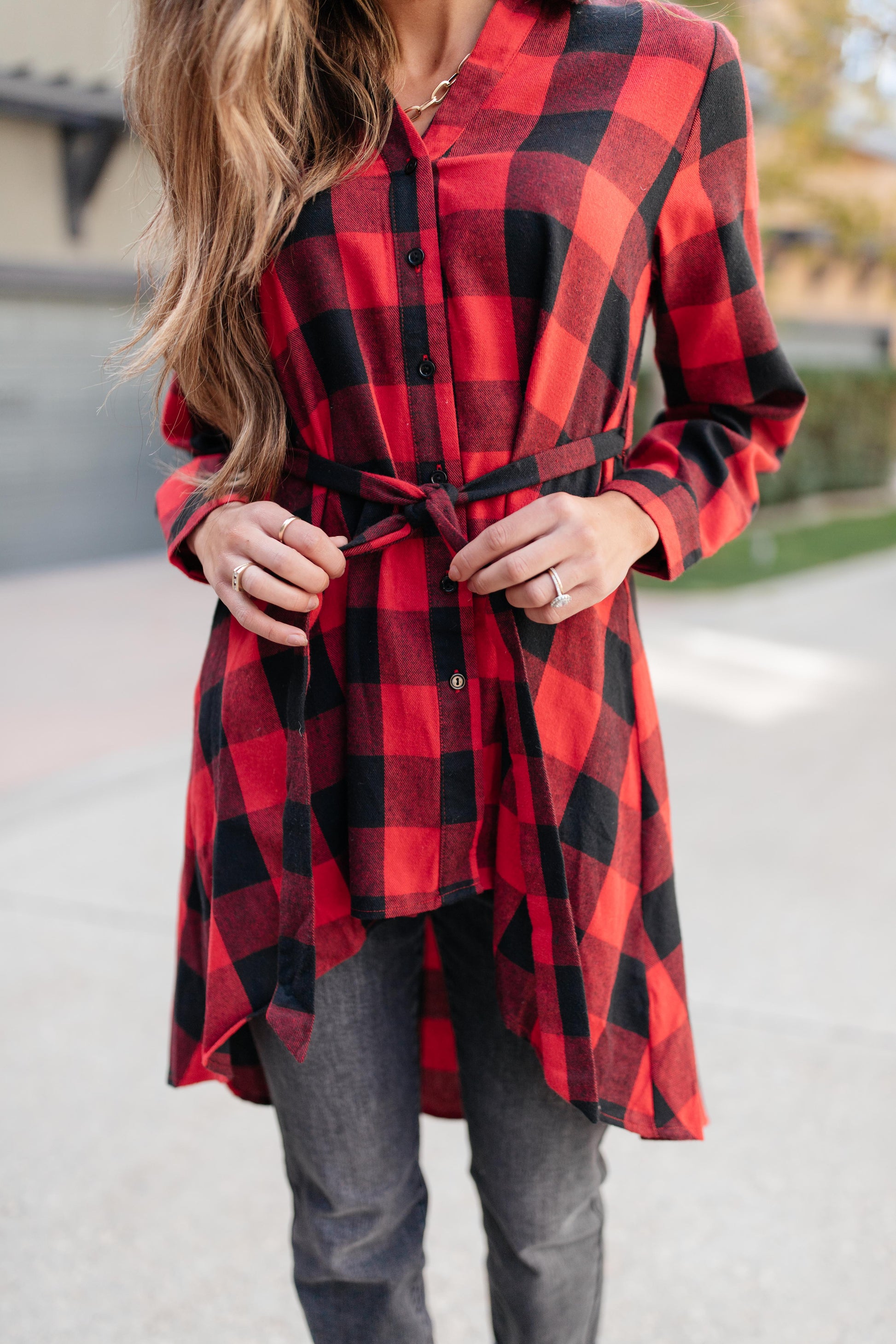 Everyone love's a buffalo plaid button-up top during the fall and winter months. How can you not? It's a classic! But, this top has a unique twist to it. It acts as a middle ground for shirts and tunics! It features a notable high-low hem and an adjustable waist tie detail! It's so cute and such a modern take on a classic piece!