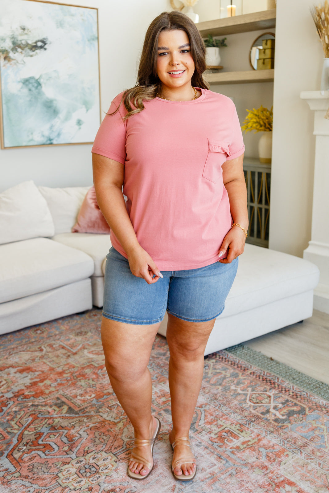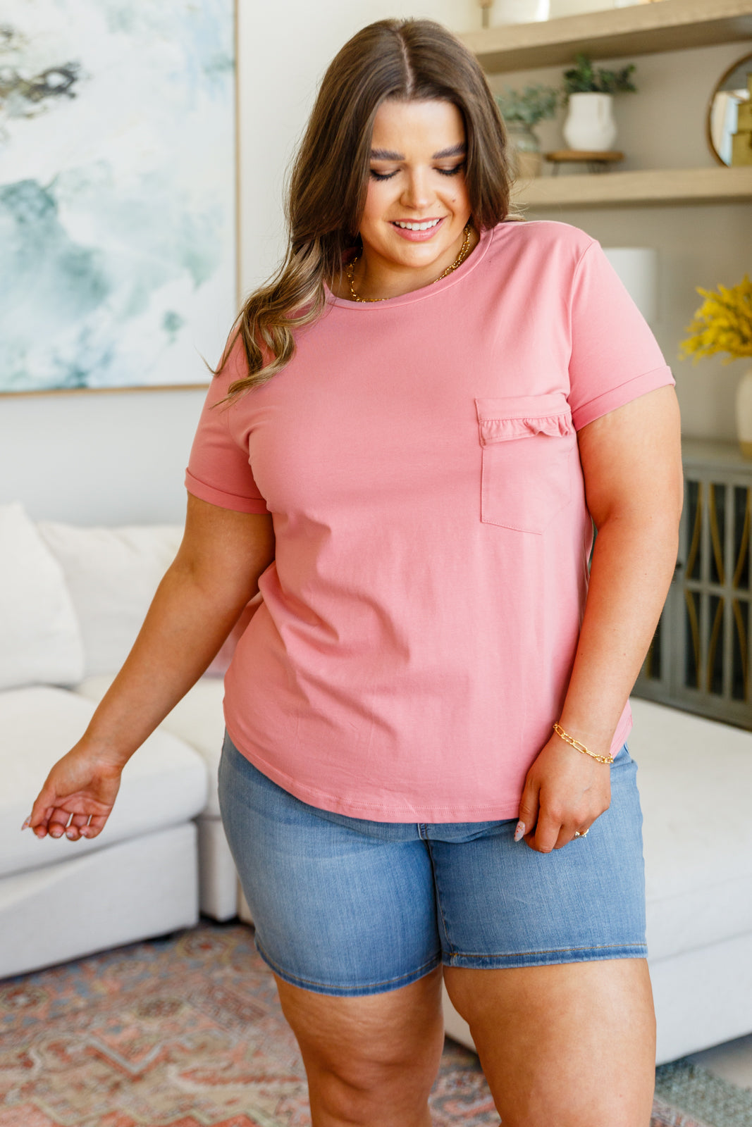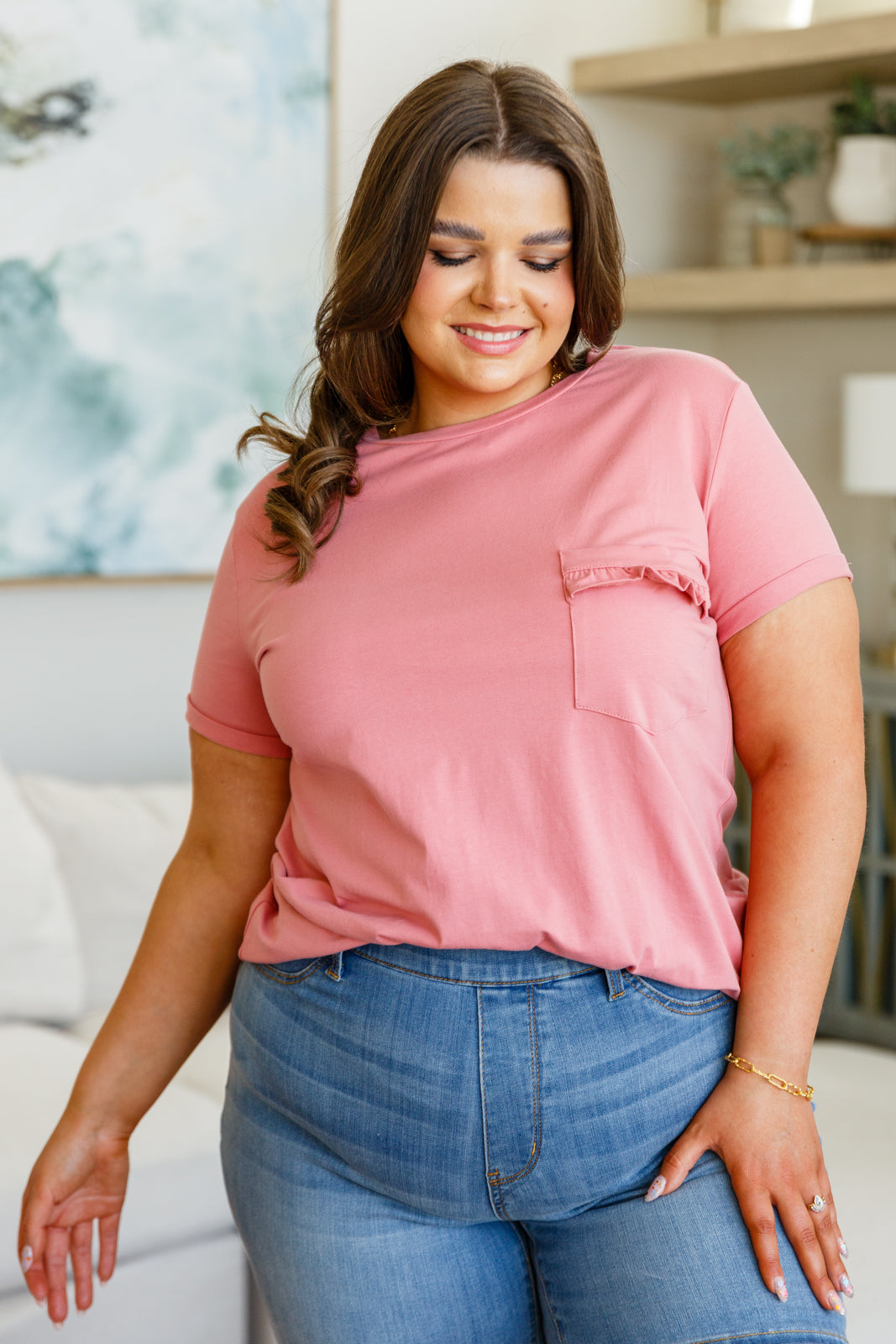 The Here For Fun Ruffle Front Pocket Tee is perfect for any summer occasion! Soft and comfortable, it has everything you need for a day in the sun: cute whimsical updates like a ruffled front pocket and cuffed sleeves make this classic T-shirt come alive! Enjoy the perfect summertime look!