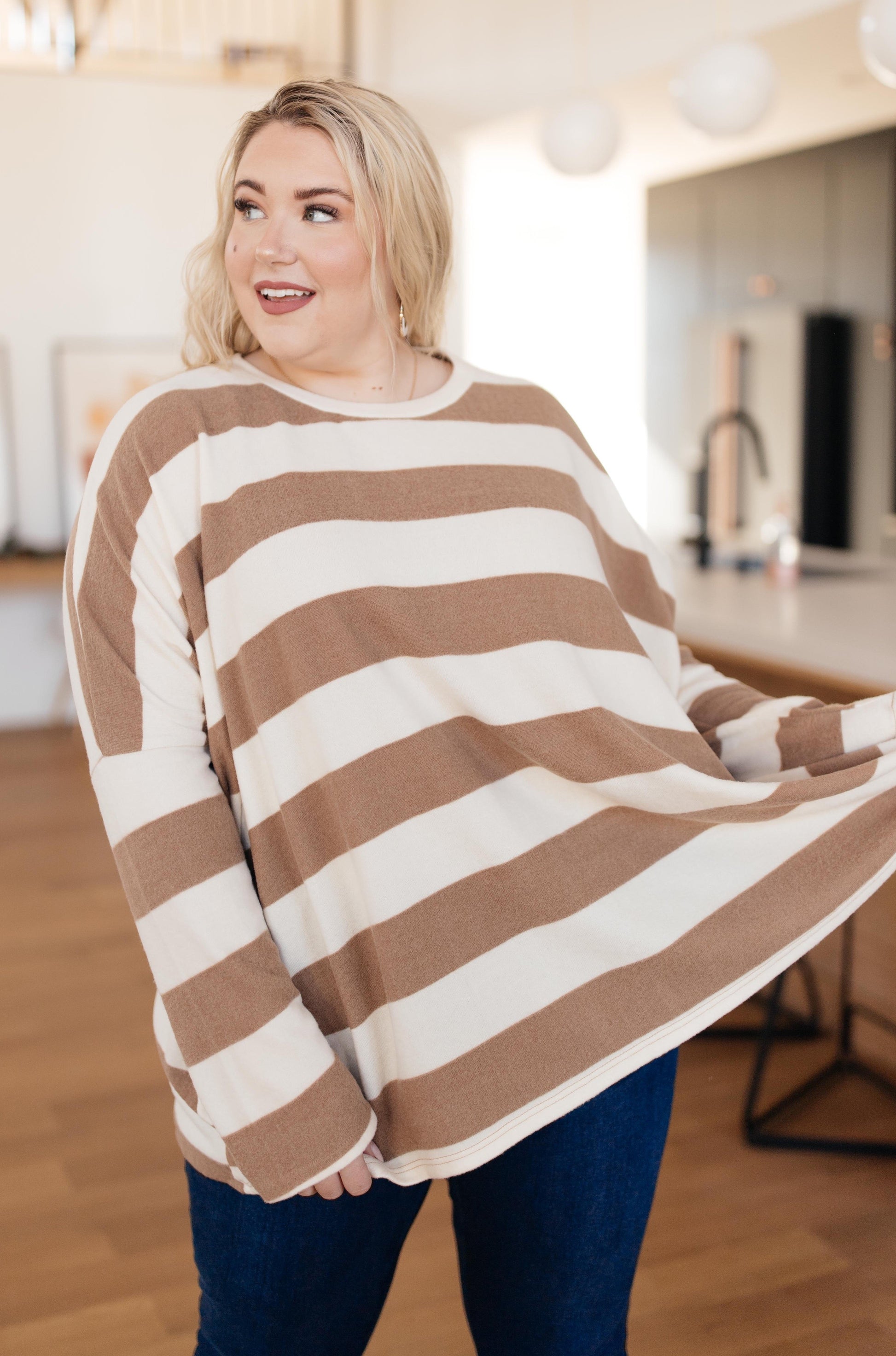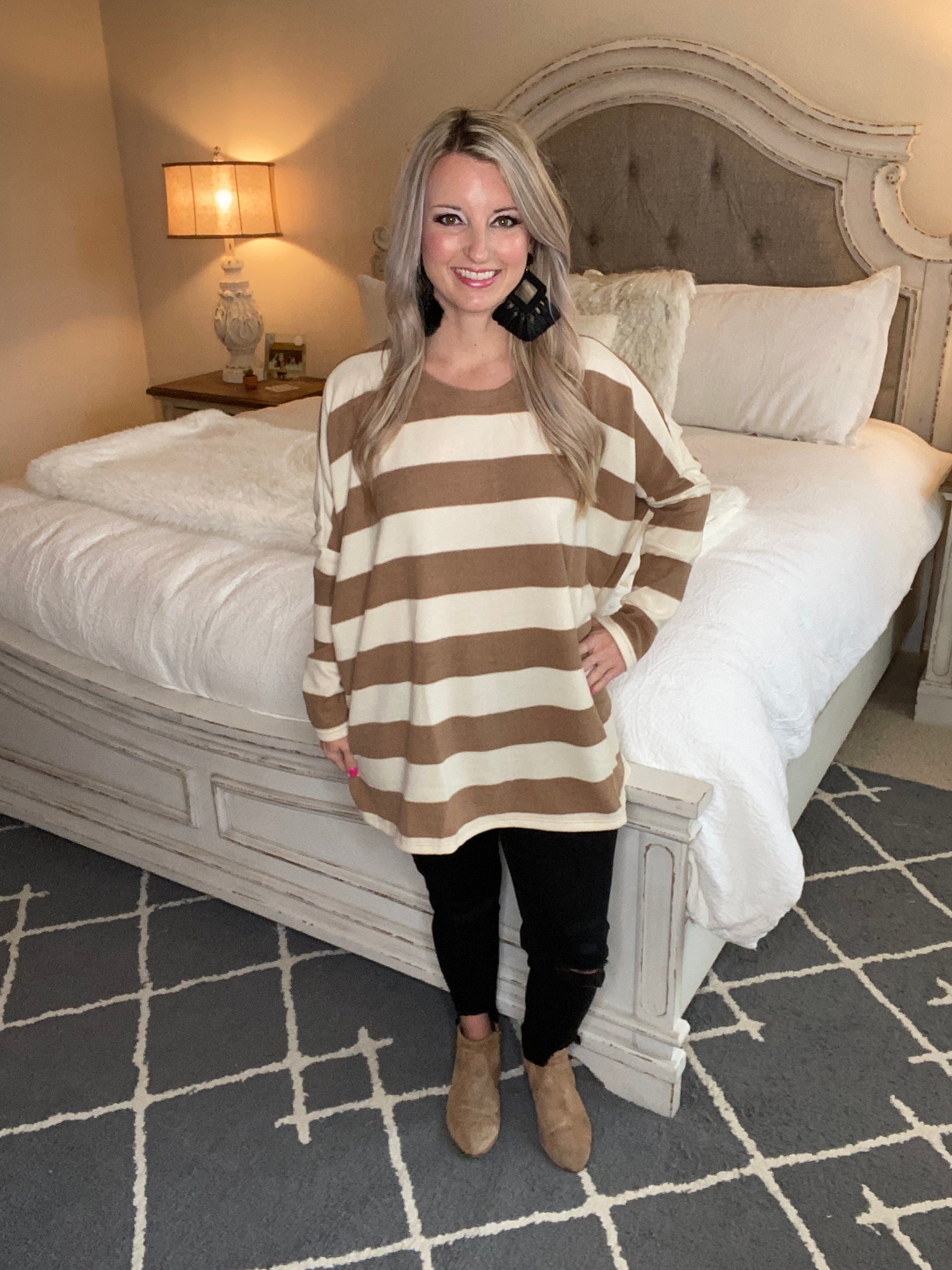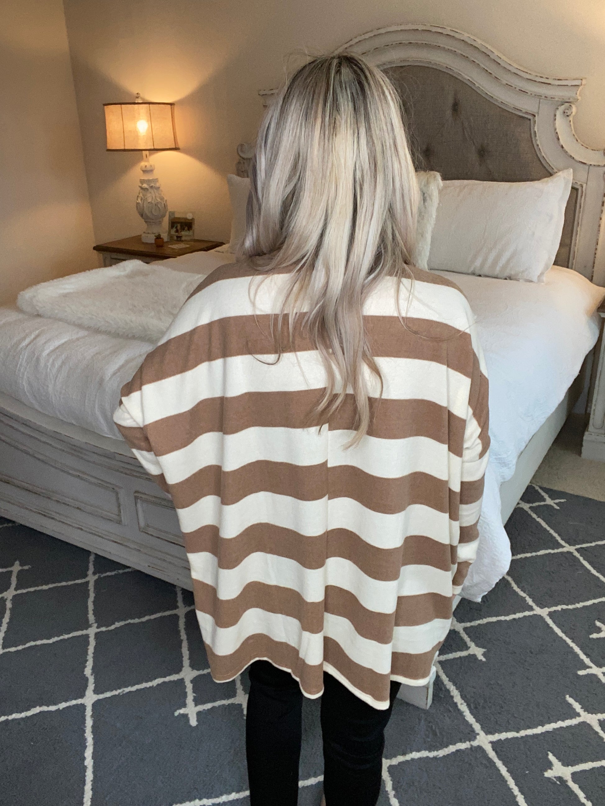 Horizontal lines are bold and powerful. They make a statement! This top is oversized and so comfortable! It features loose dolman sleeves and a rounded neckline. This top looks so cute paired with your favorite pair of jeans and a variety of shoes!