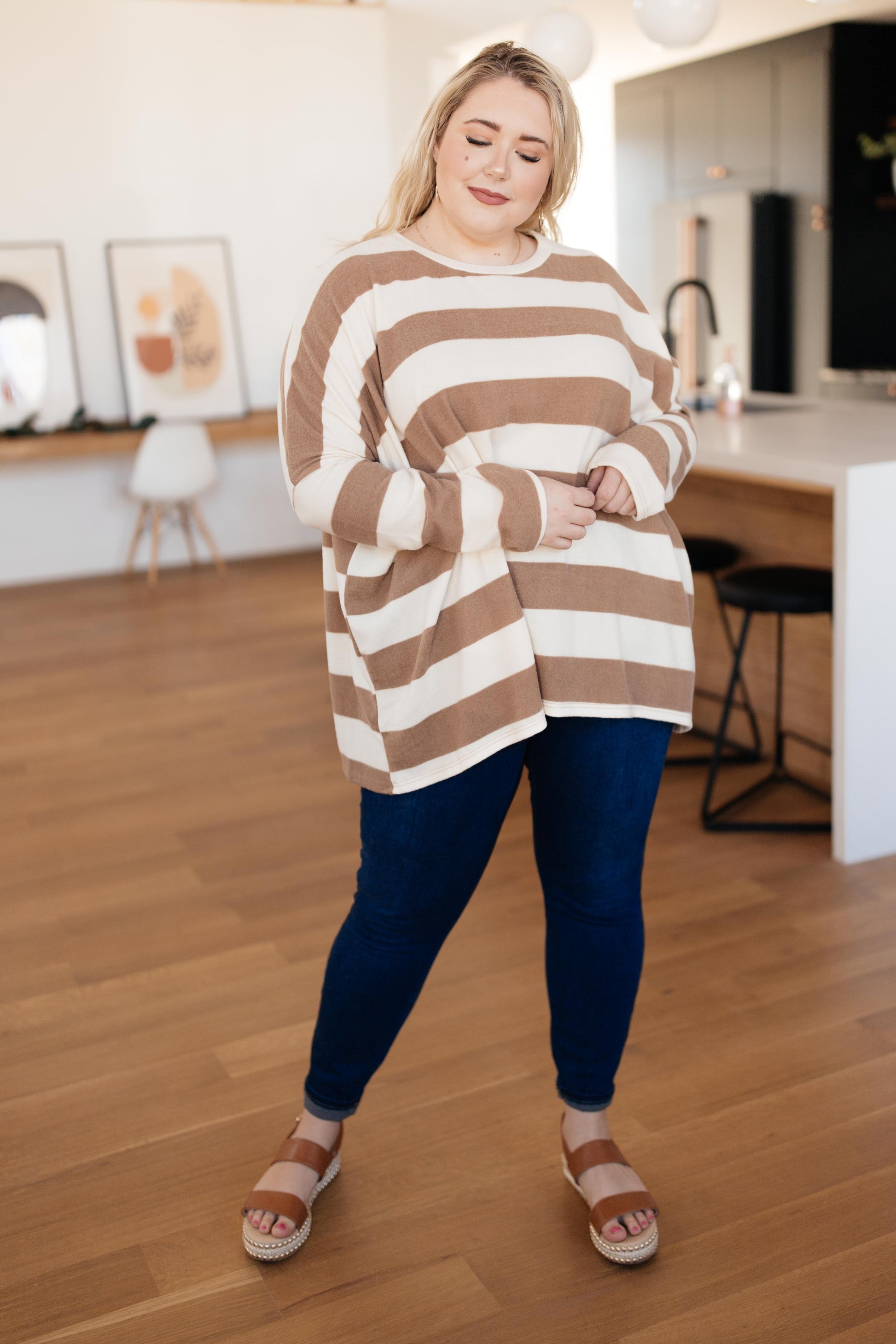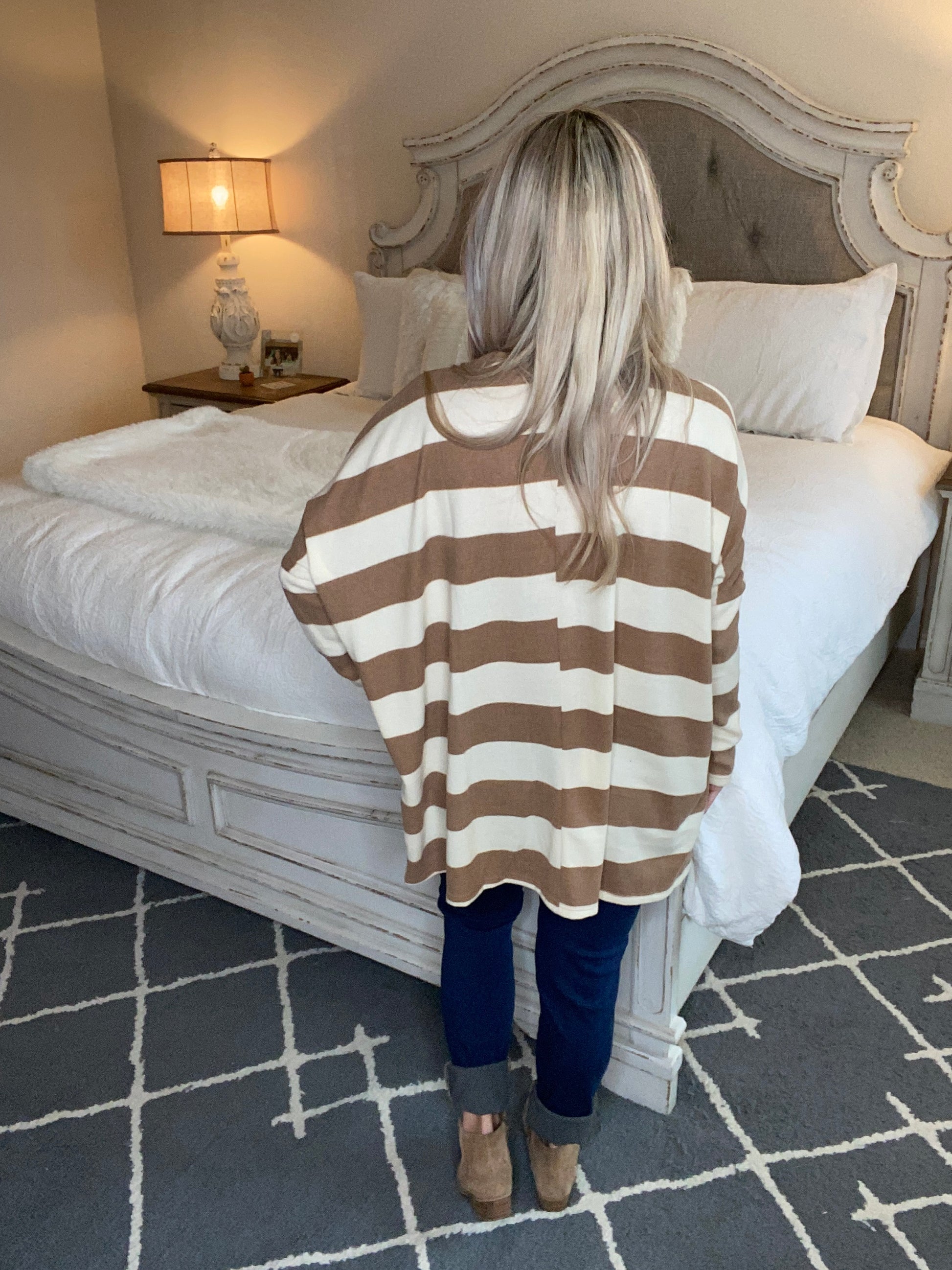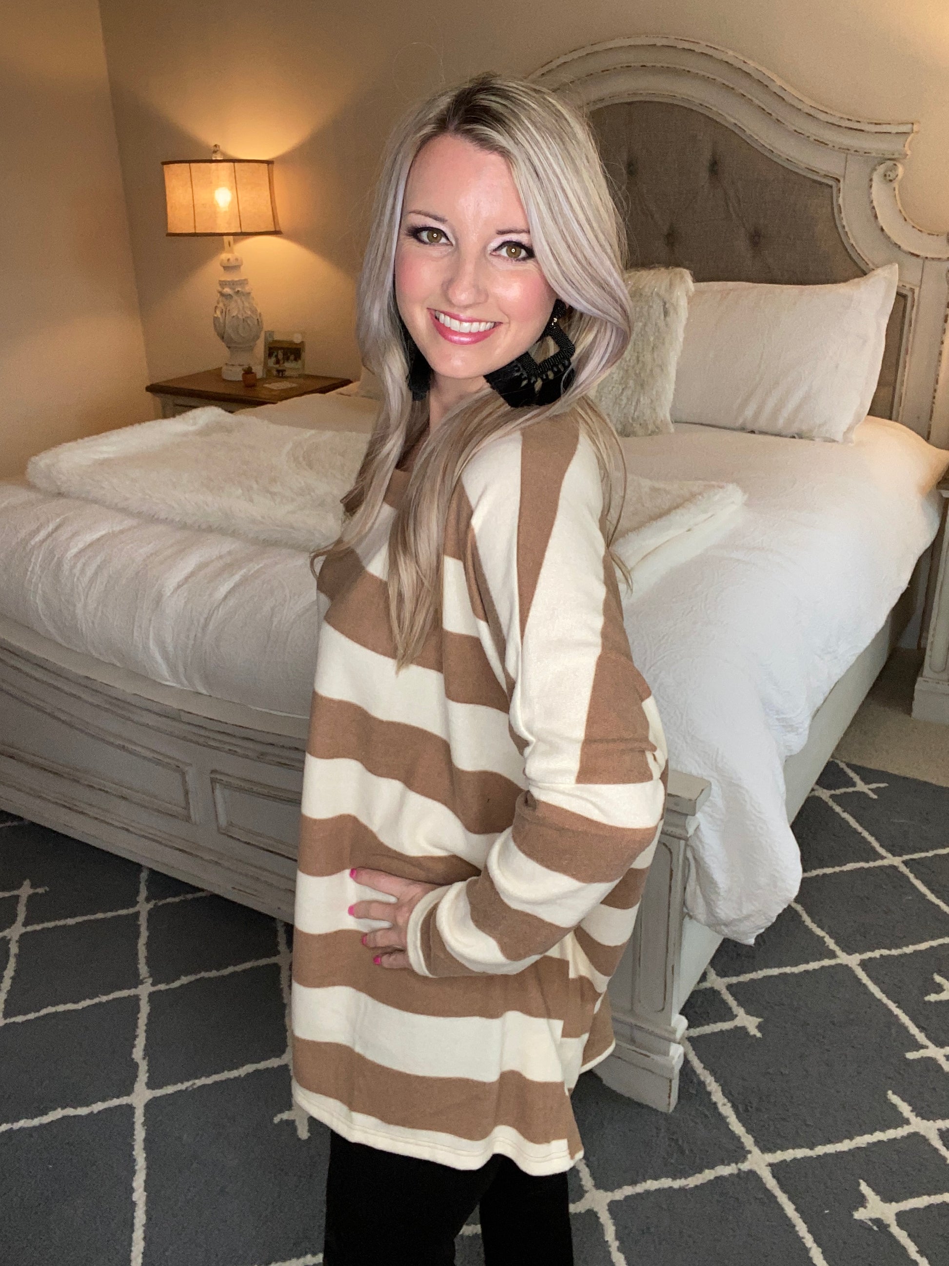 Horizontal lines are bold and powerful. They make a statement! This top is oversized and so comfortable! It features loose dolman sleeves and a rounded neckline. This top looks so cute paired with your favorite pair of jeans and a variety of shoes!