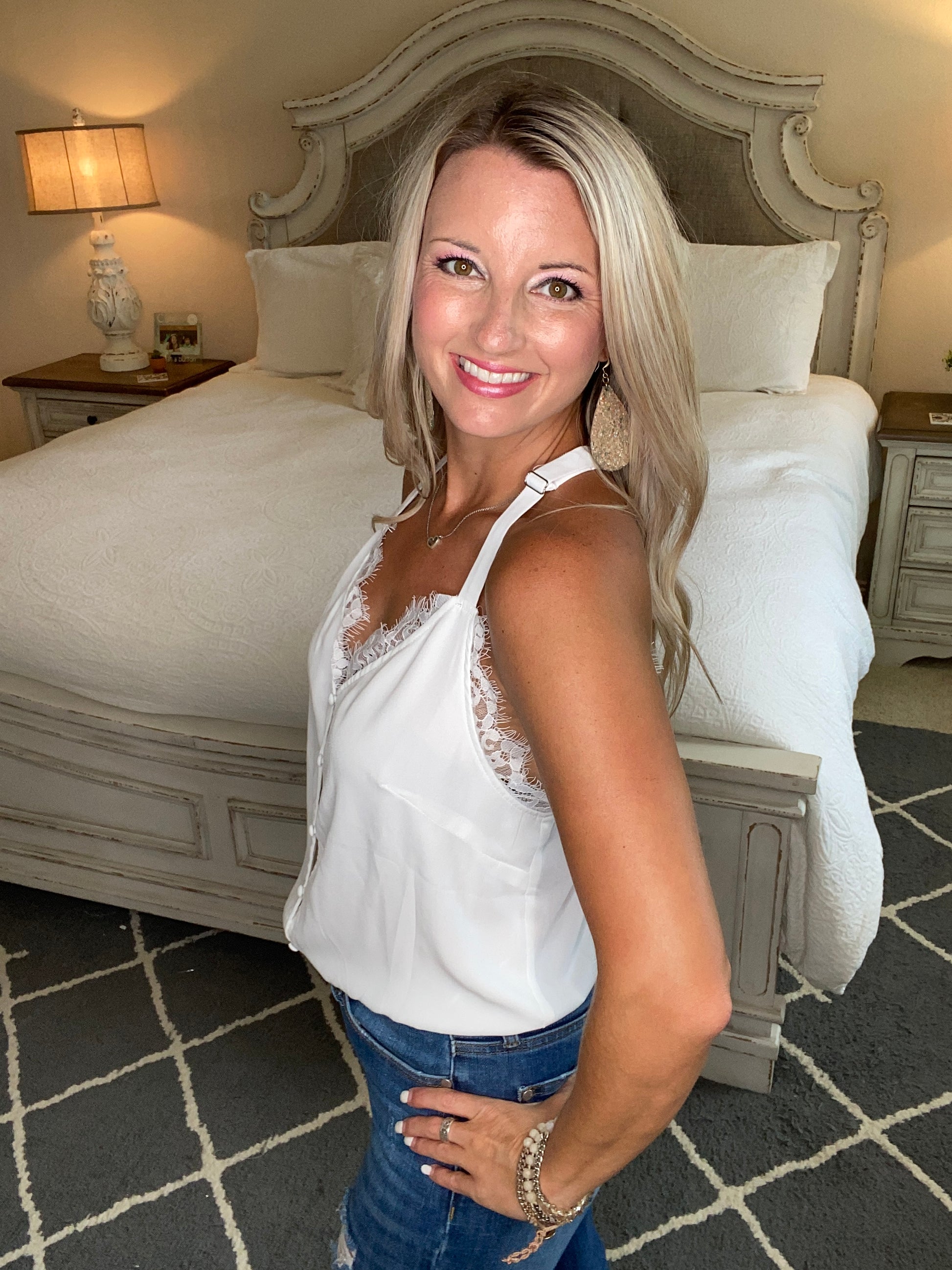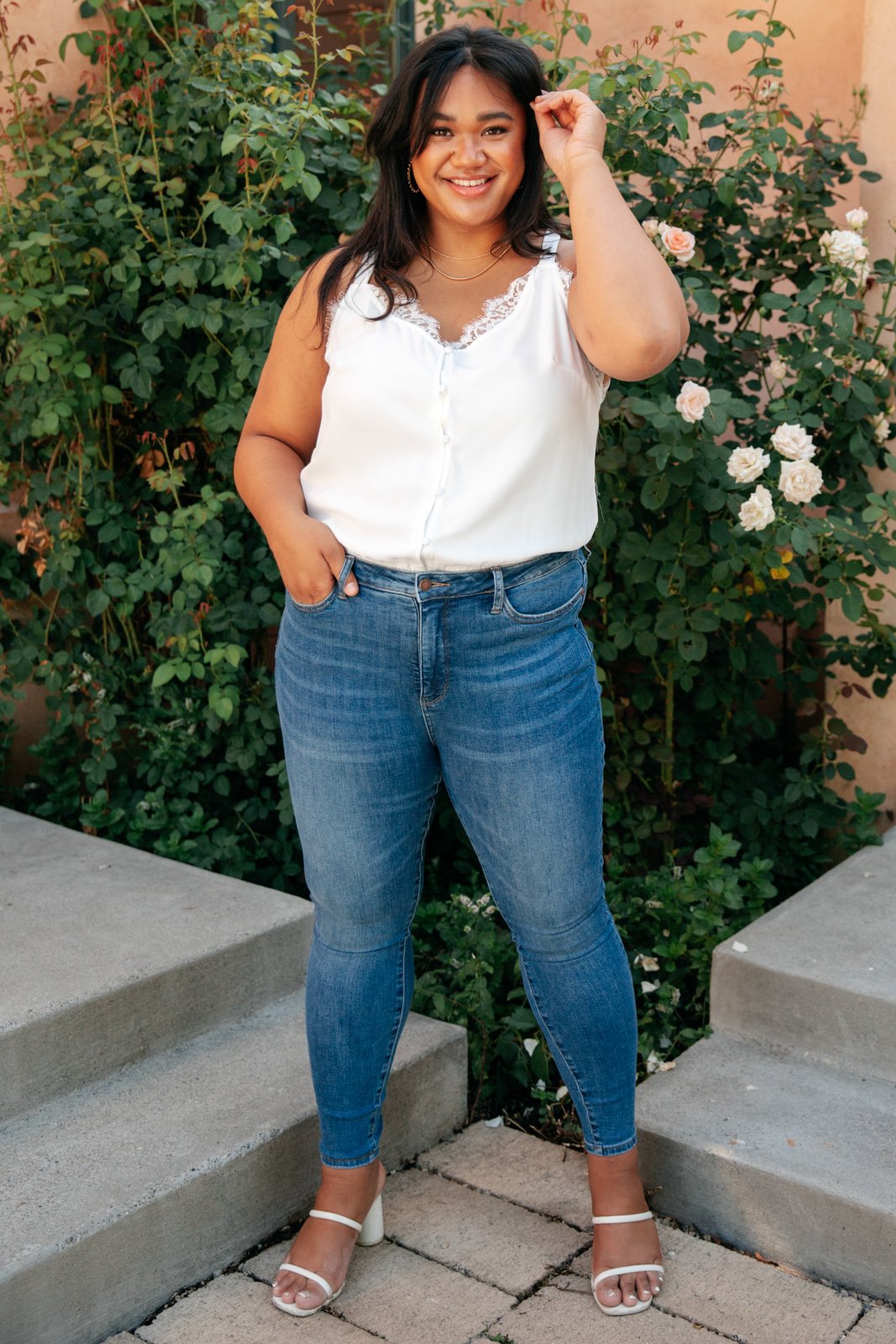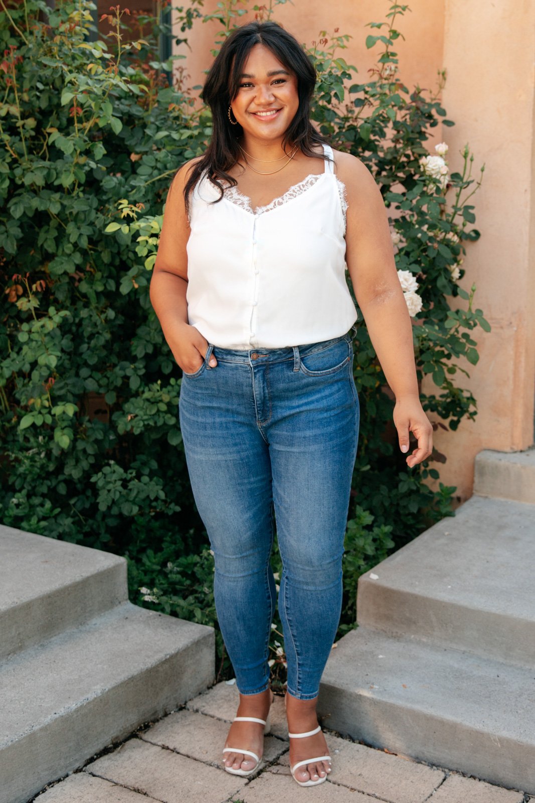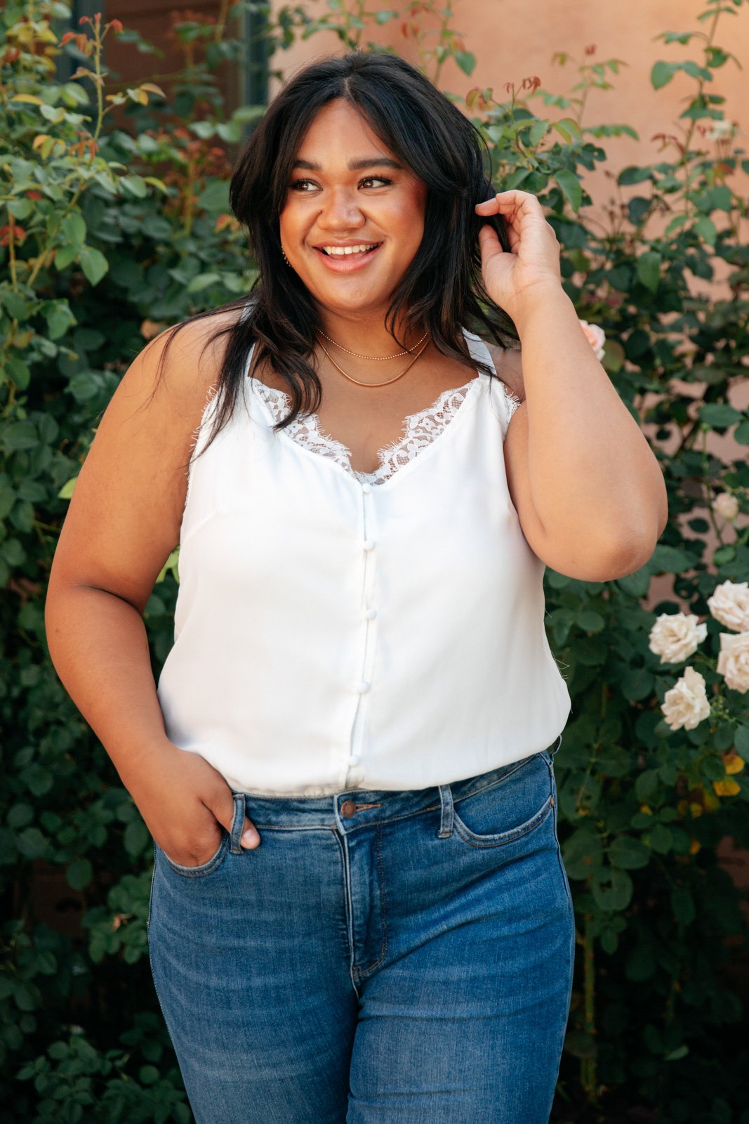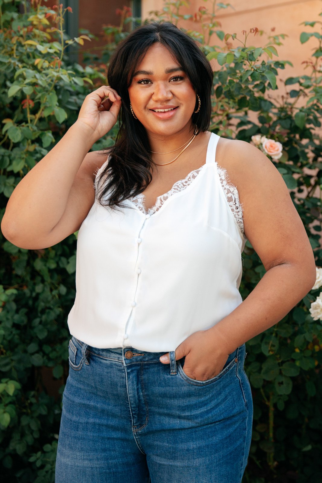 The Lace Bonbon Bodysuit is a beautiful bodysuit that looks like a tucked in tank! We LOVE this style of bodysuit because it gives the look of a tucked blouse-that actually stays put! This tank top style bodysuit is made of a soft flowy fabric and features functional buttons and a lace trimmed neckline. Pair it with jeans or a skirt.