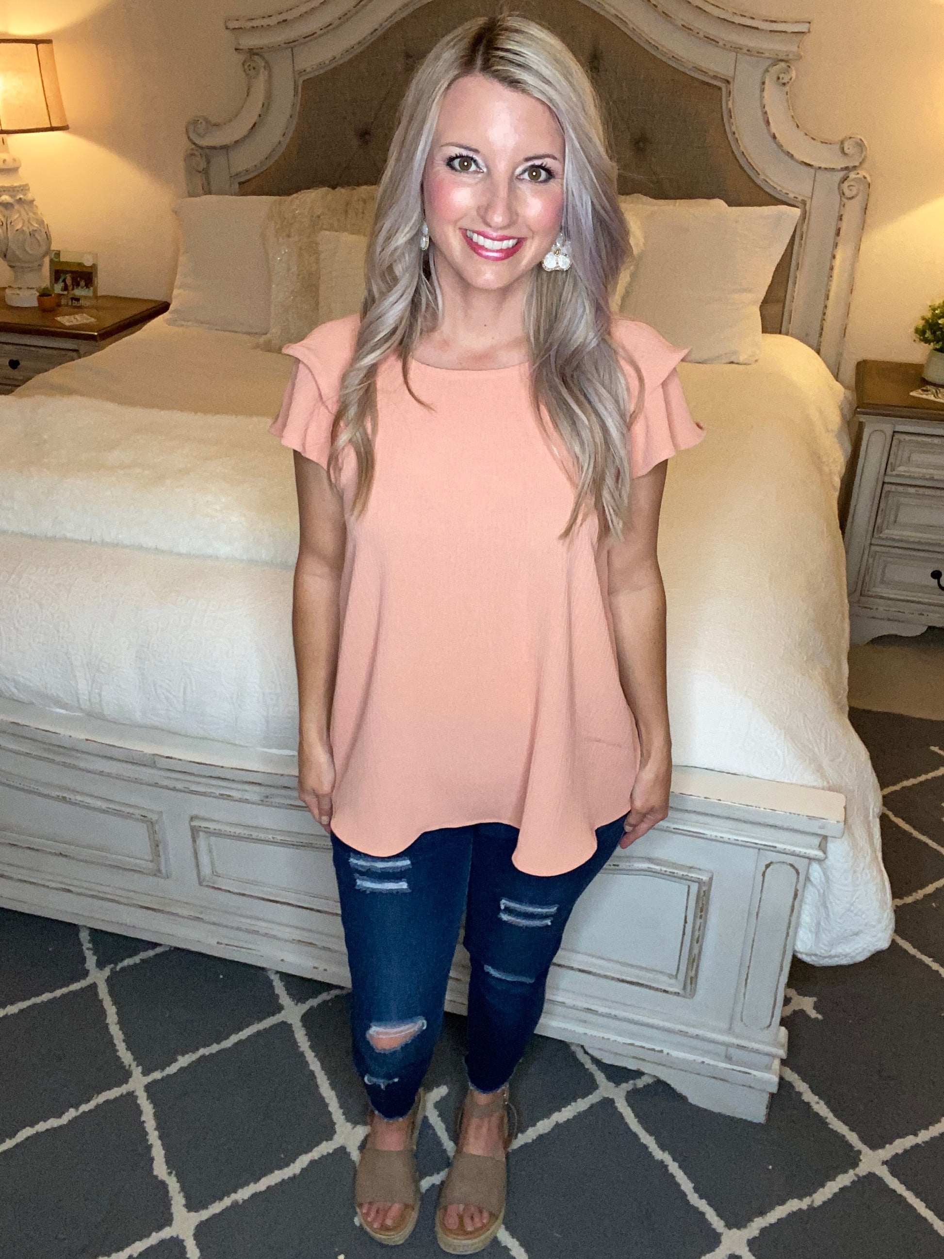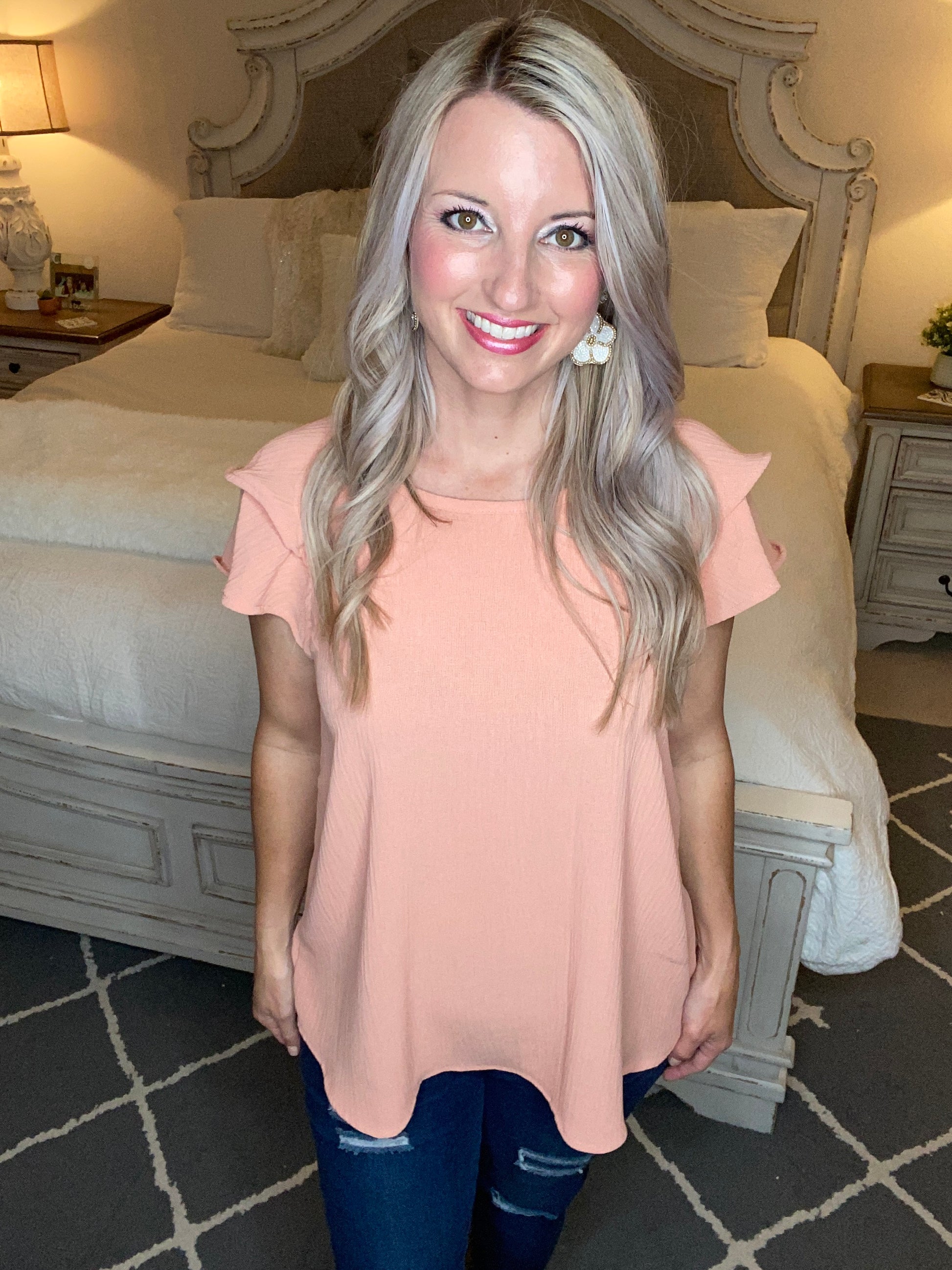 This top is absolutely darling with its subtle details and flutter sleeves. You can easily dress this top up or down and is lightweight and breathable to wear for the warmer months.