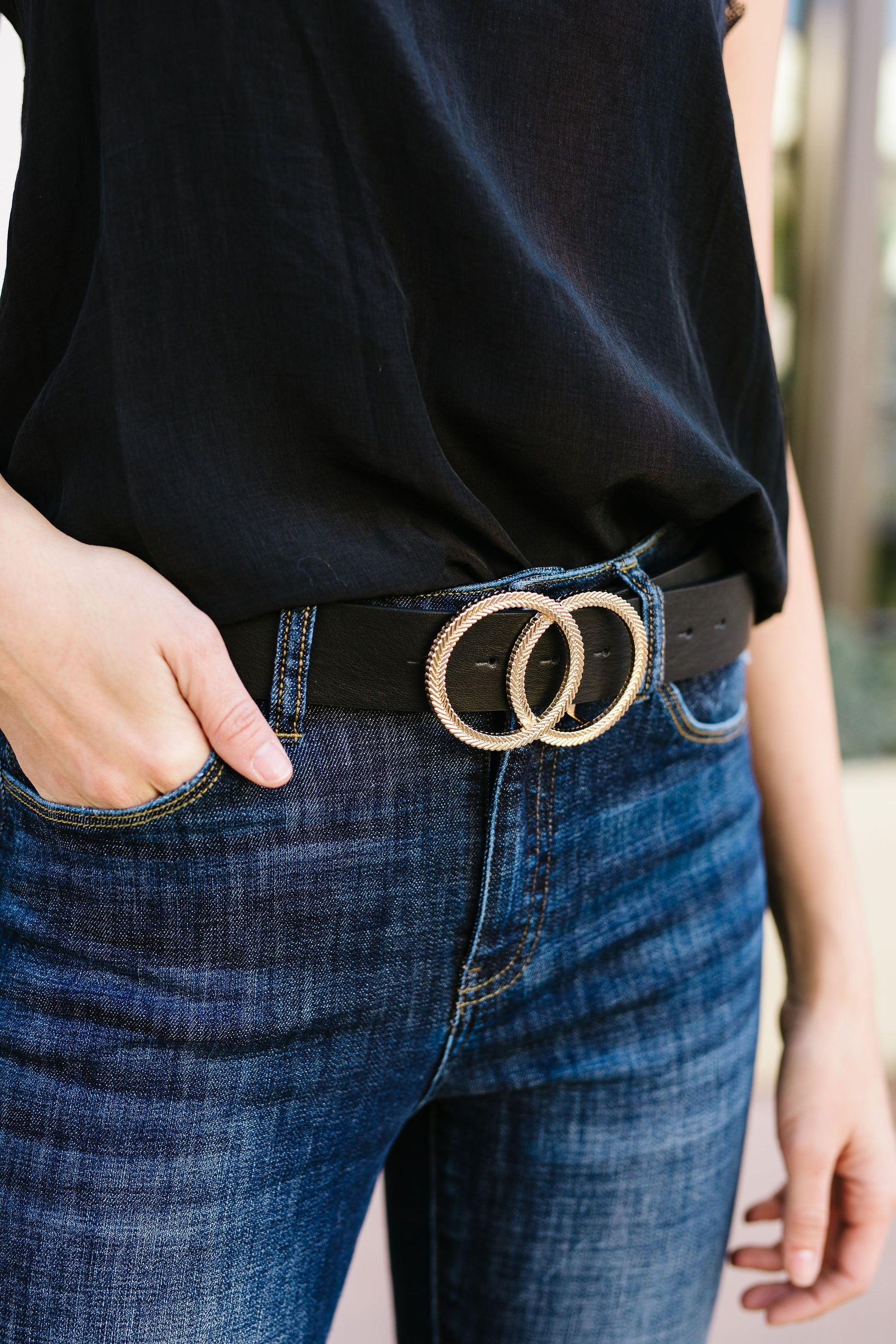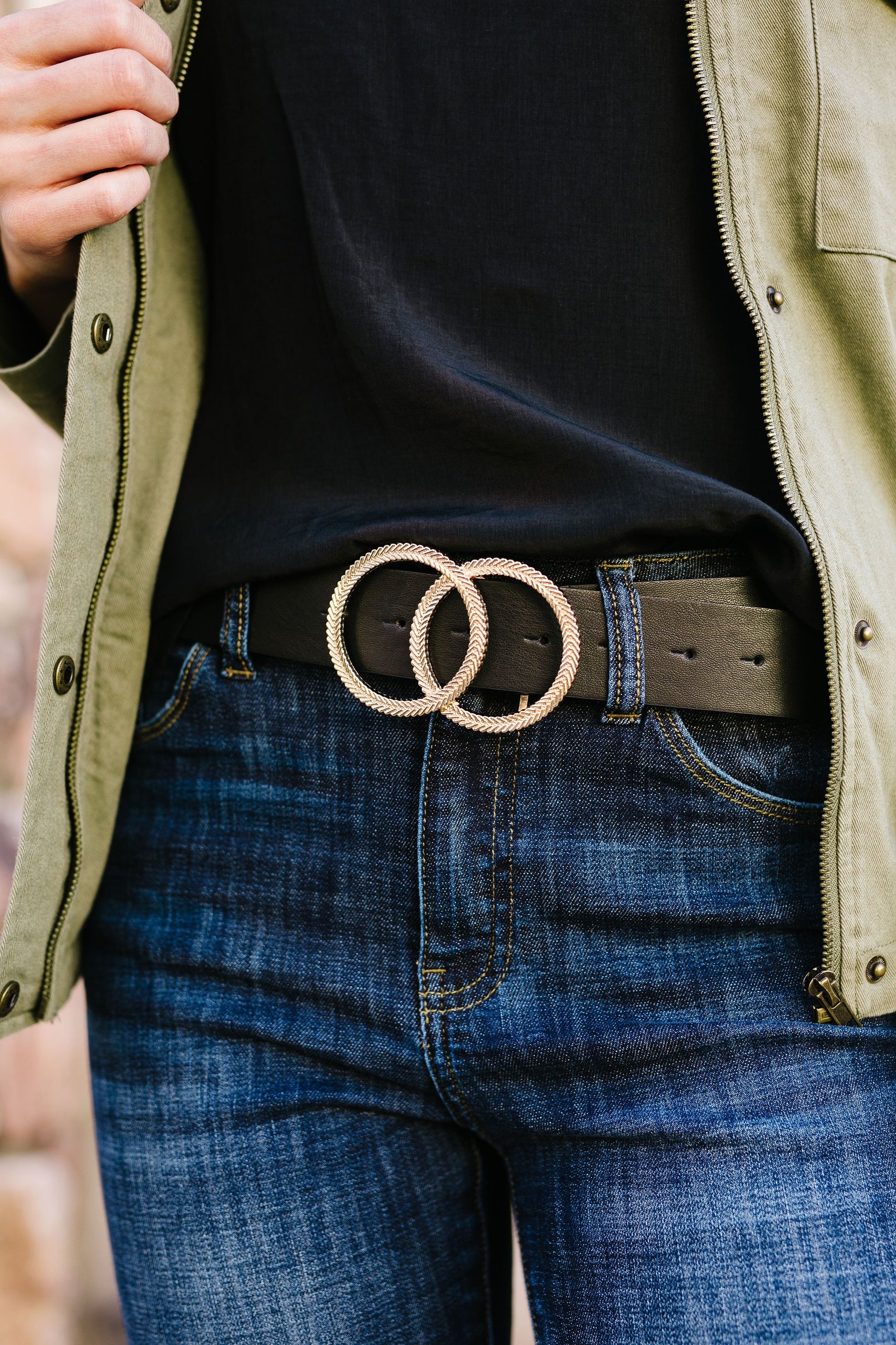 Two gold circles, embossed with a herringbone pattern, are linked to create a statement buckle in this vegan leather belt. It is approximately 43 inches long and 1.6 inches wide and has 7 notches. With the holidays fast approaching, I think I am really going to appreciate those extra notches!