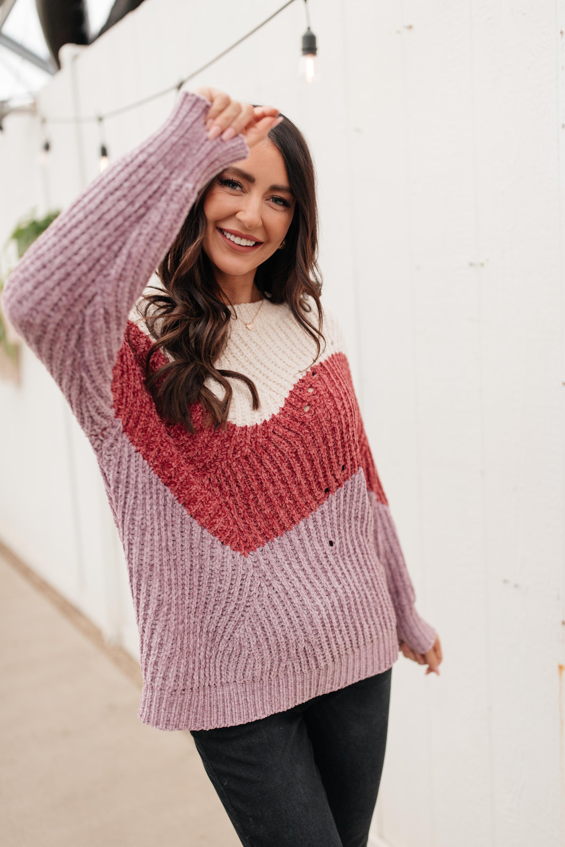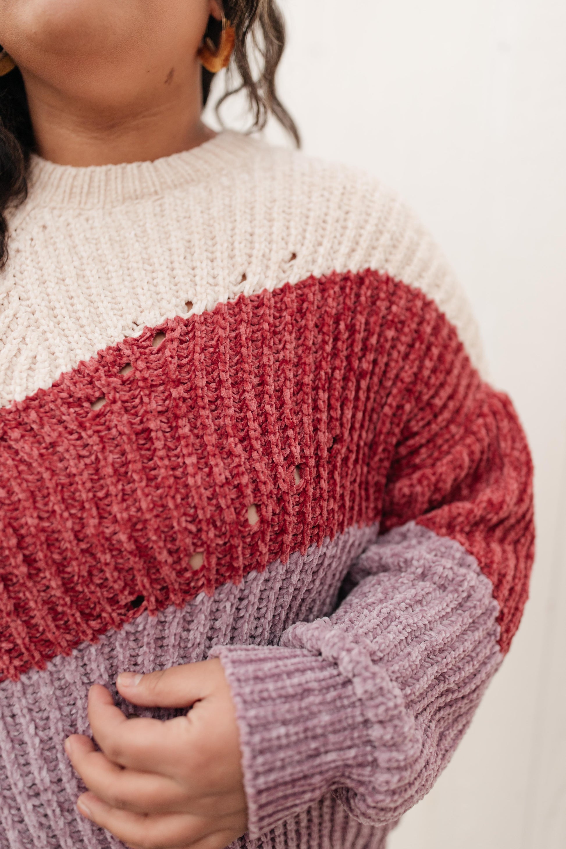 The Marie Sweater is made from incredibly soft ribbed chenille material! It's medium weight and stretchy with a relaxed, cozy fit. It looks so cute paired with jeans or a transitional pair of shorts. Plus, that plum, rose, and cream combo is so lovely!