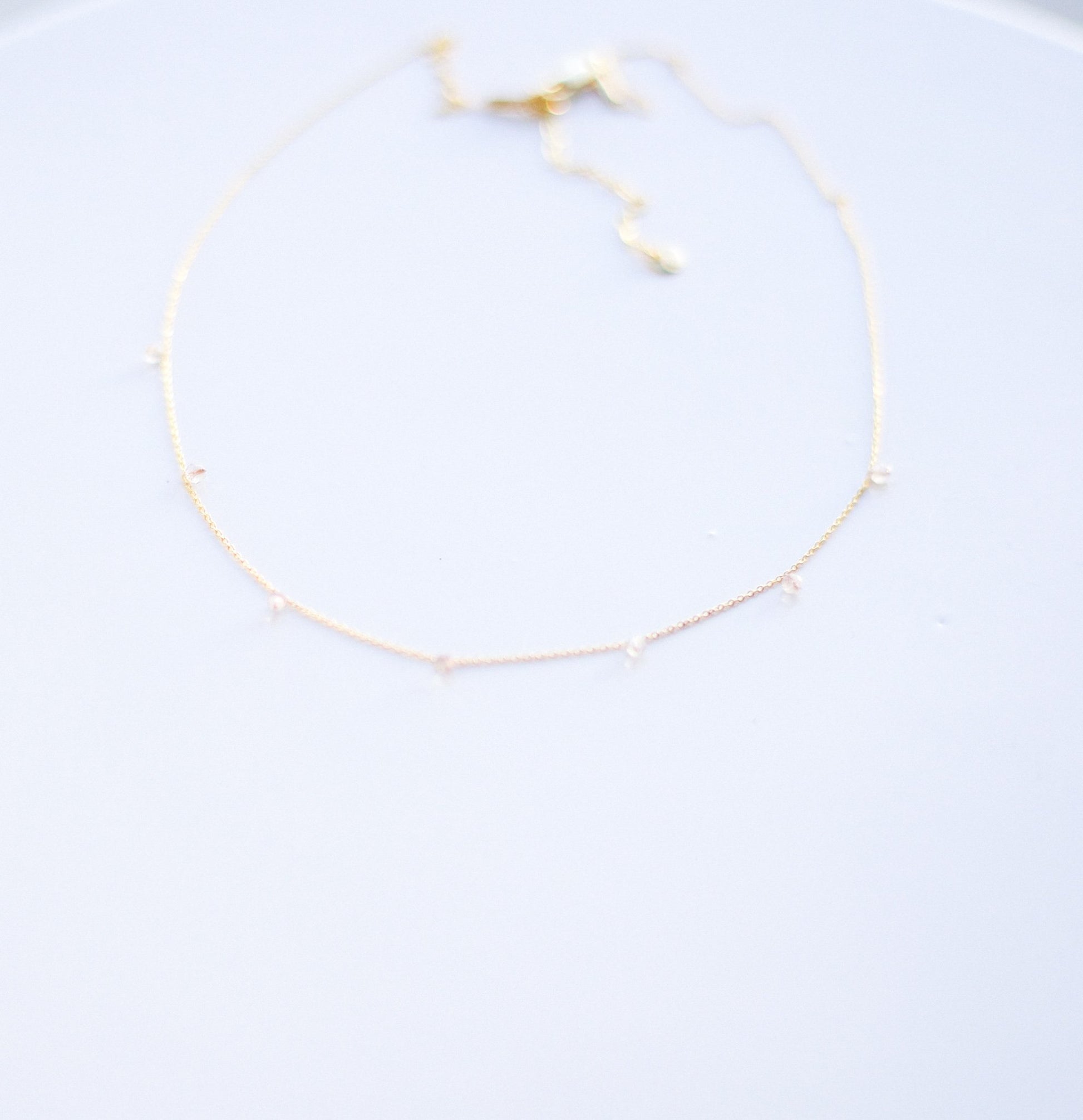 Tiny beads of reflective labradorite, or moonstone, embellish a delicate 18K gold-plated brass chain, making a stunning understated necklace that is perfect for any occasion. The chain is sixteen inches long and closes with a lobster clasp. Some people think labradorite can impart strength and increase intuition in the wearer. I think I'll take whatever help I can get, even if it's just the finishing touch to make me look fabulous!
