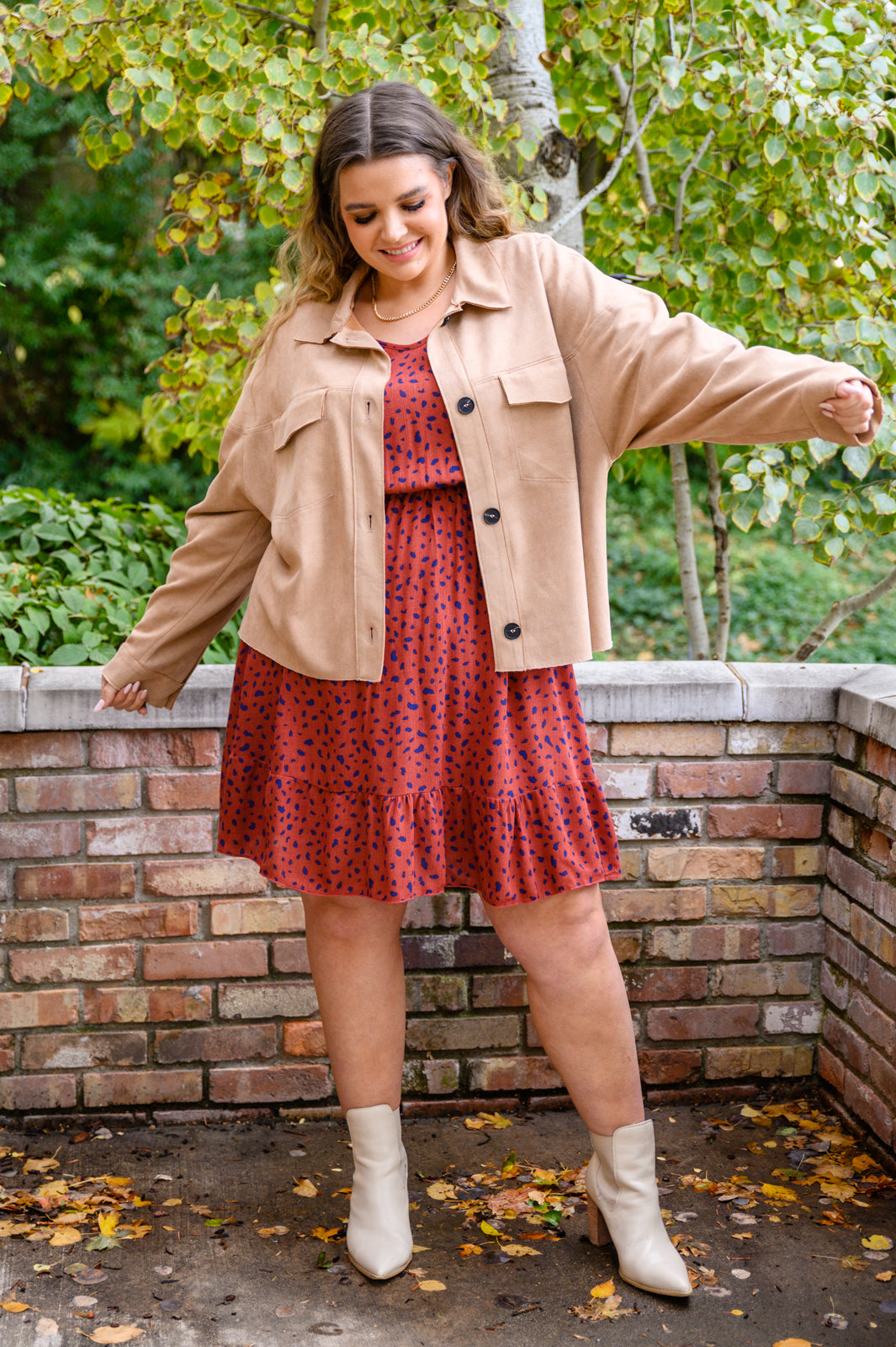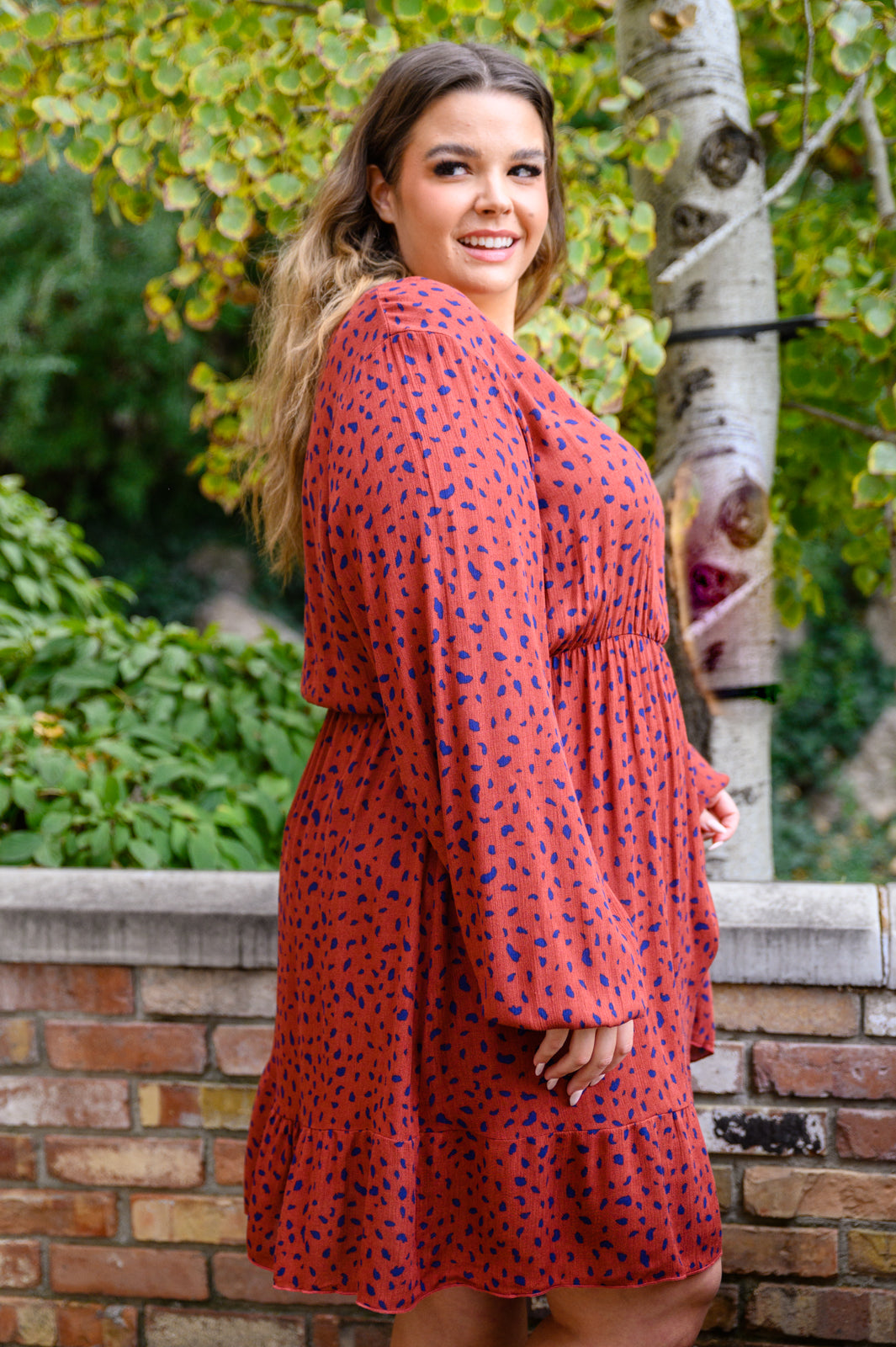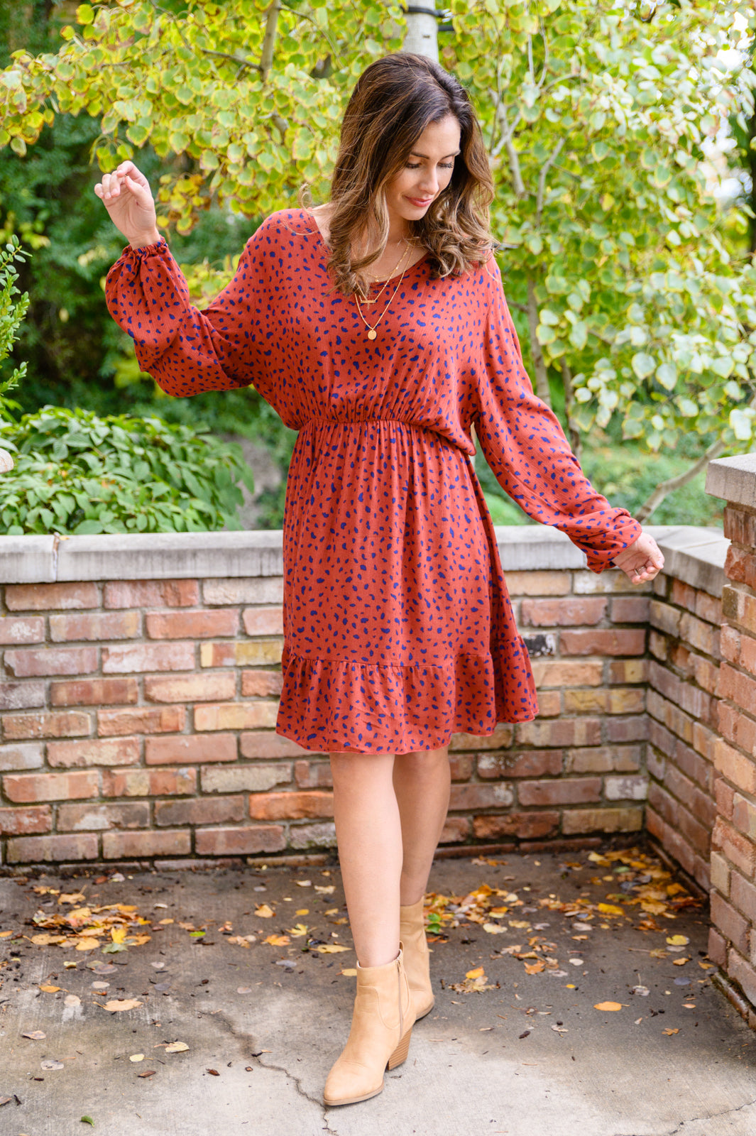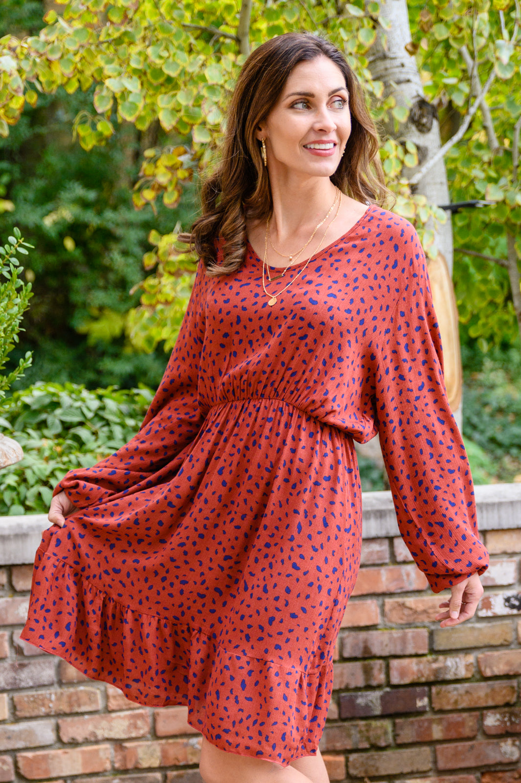 A cute look starts with the Most Genuine Spotted Dress In Rust! This darling dress features a lightweight, non stretch fabric that shapes a v-neckline and long sleeves with elastic cuffs and waist line. A mini length skirt has a flowy fit, finished with a ruffle hem and inner lining.
