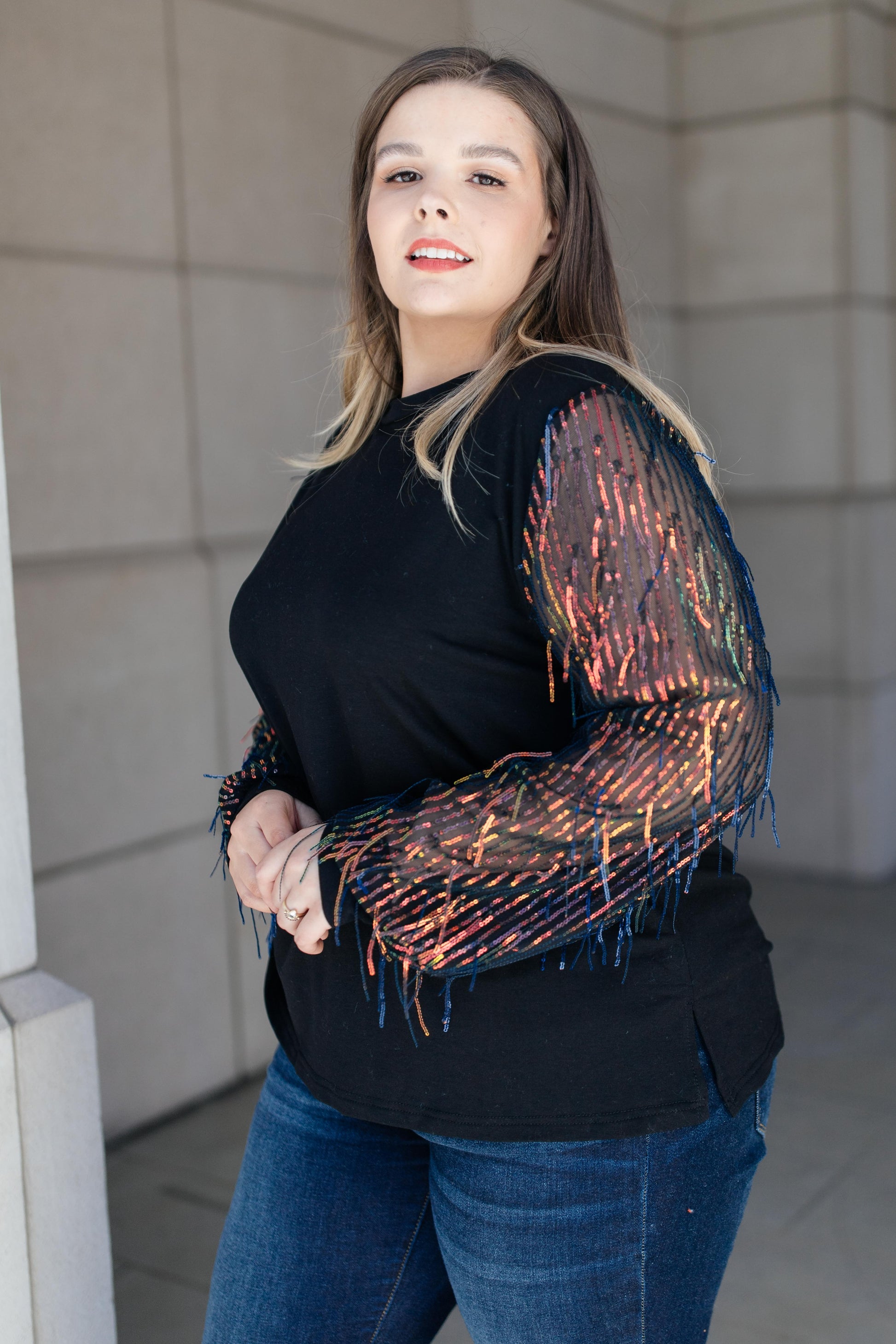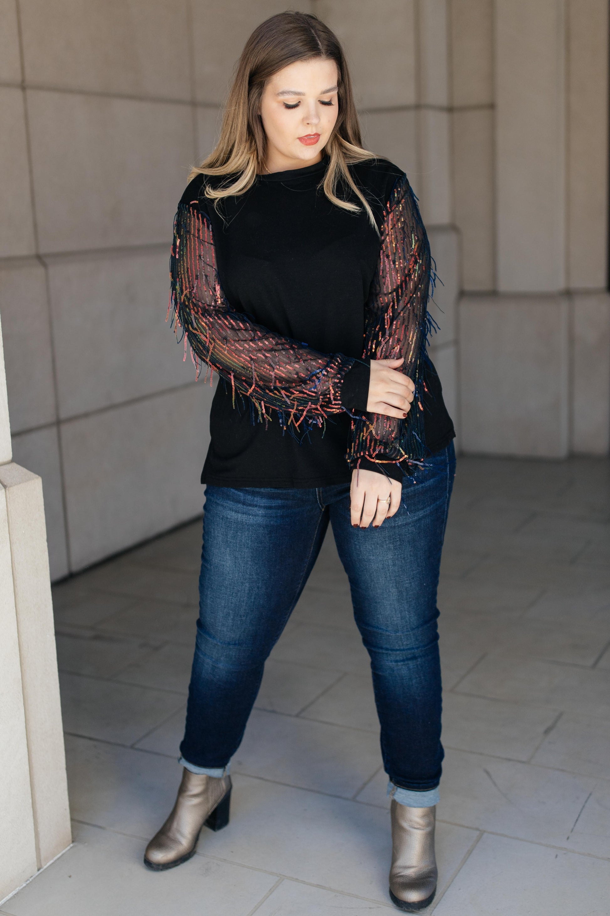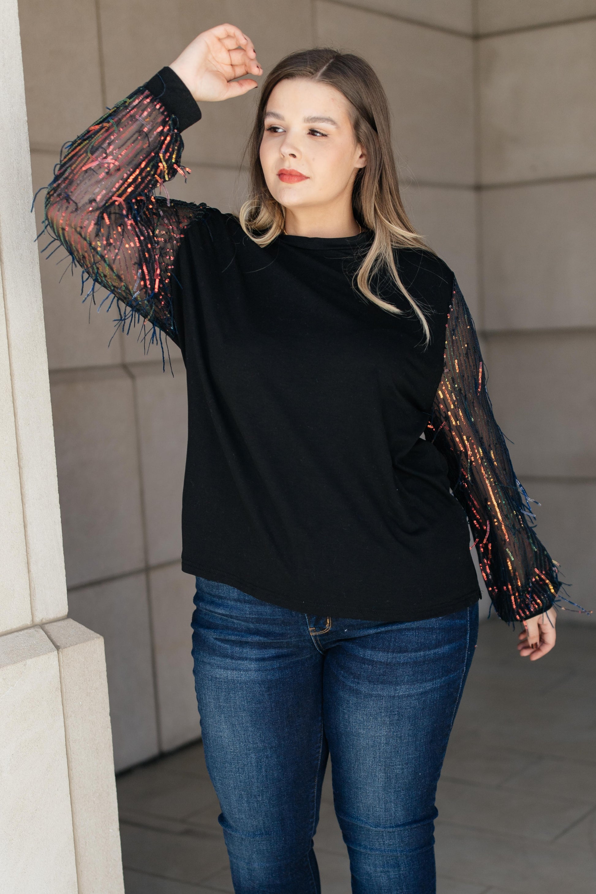 This top is the epitome of a holiday top! Picture yourself in this top at Thanksgiving dinner, at your family Christmas party, or a New Year's celebration with friends. I mean...come on! This top is entirely perfect for any number of occasions! It's a simple, classic black top with sheer sleeves that are sequin lined and have sequined tinsel to add texture and movement. Give this top a chance to make your holiday season perfect!