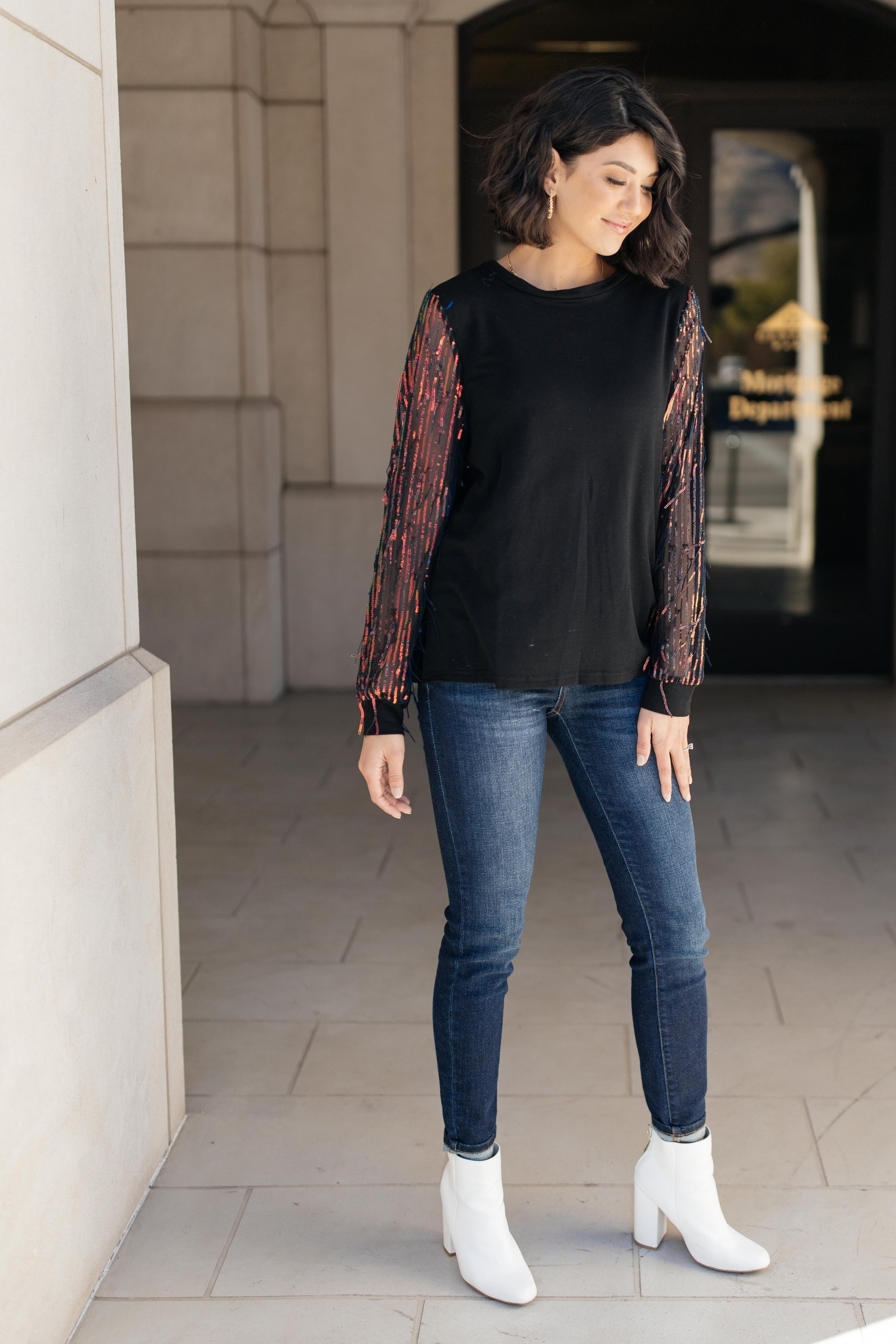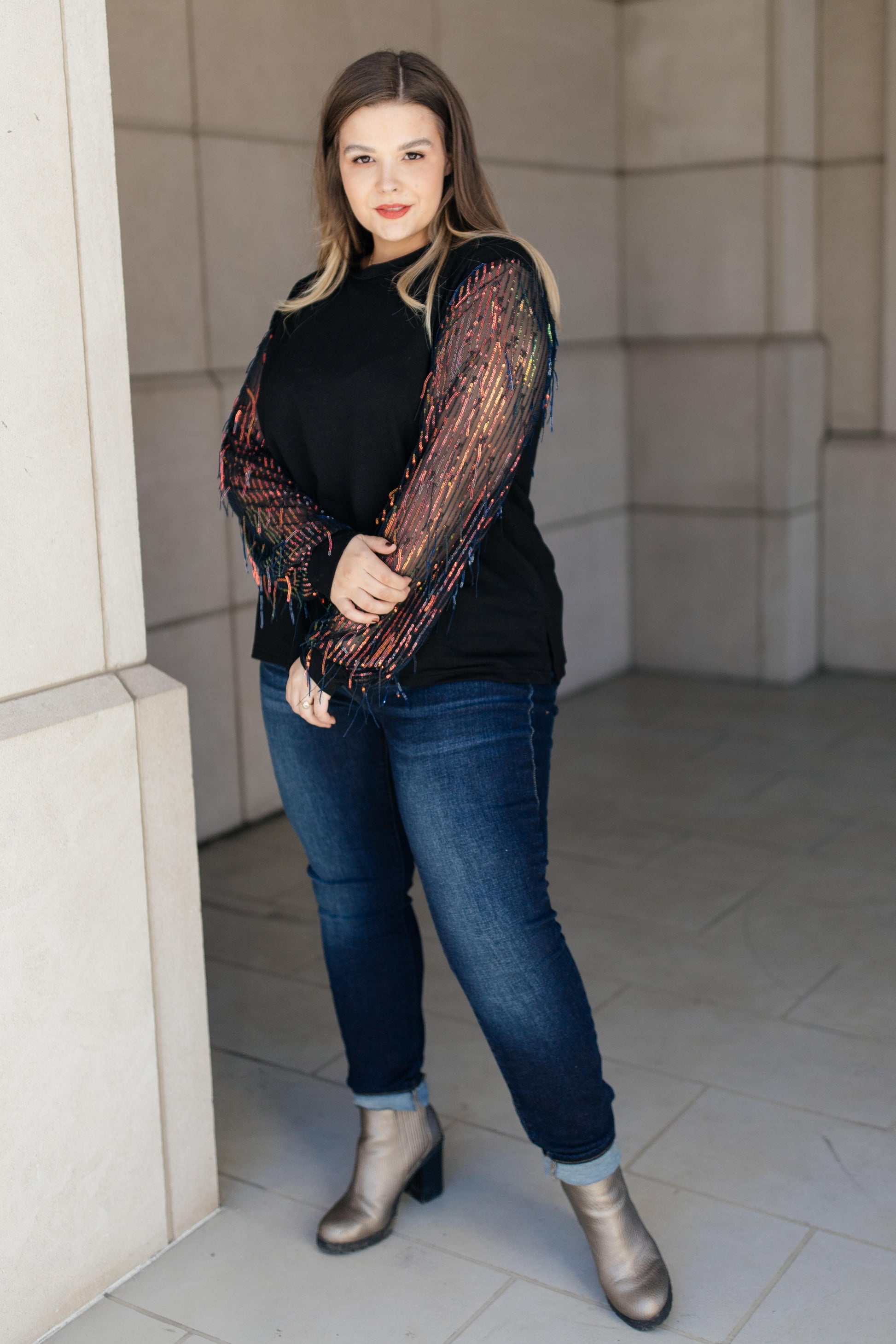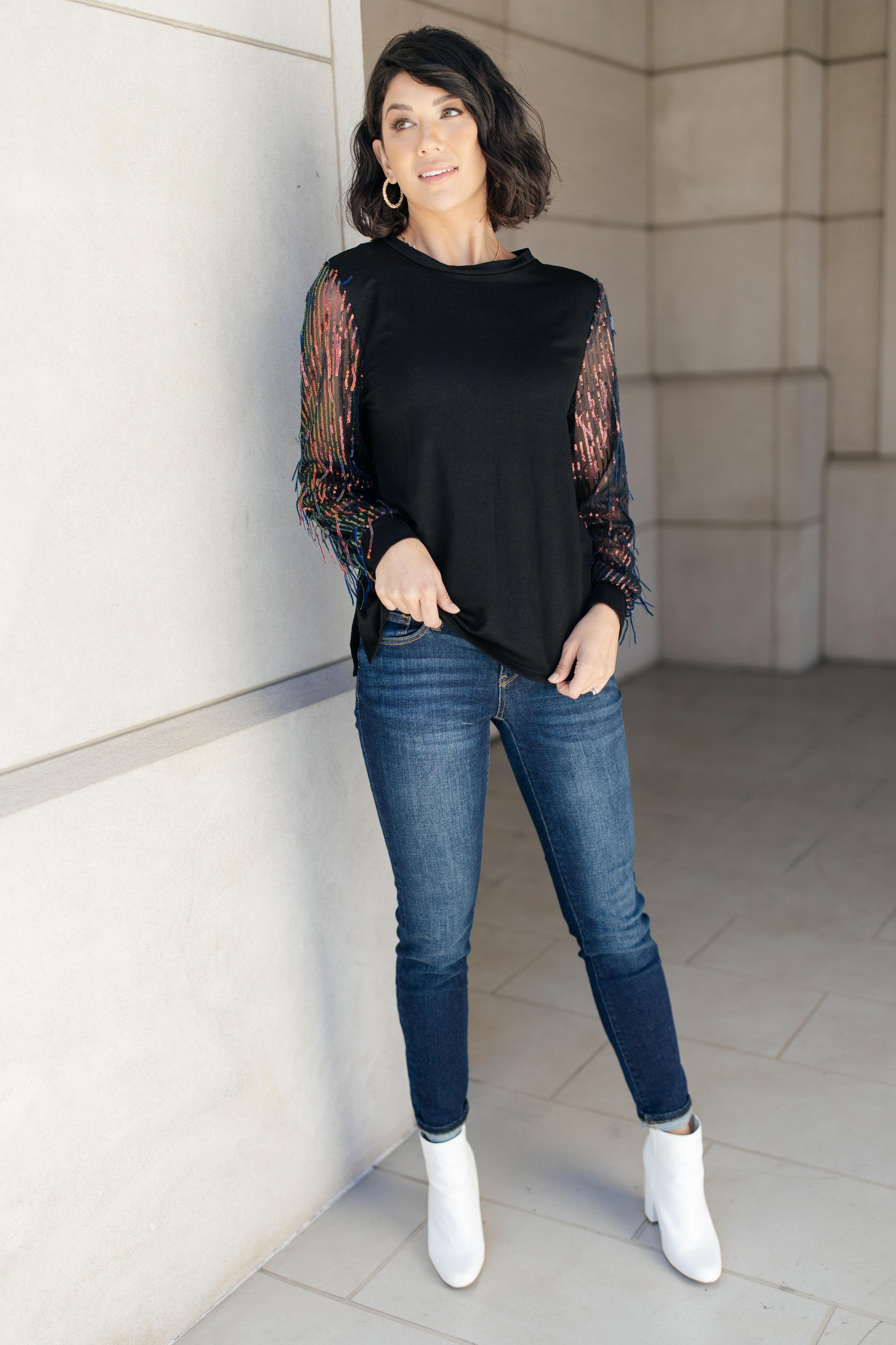 This top is the epitome of a holiday top! Picture yourself in this top at Thanksgiving dinner, at your family Christmas party, or a New Year's celebration with friends. I mean...come on! This top is entirely perfect for any number of occasions! It's a simple, classic black top with sheer sleeves that are sequin lined and have sequined tinsel to add texture and movement. Give this top a chance to make your holiday season perfect!