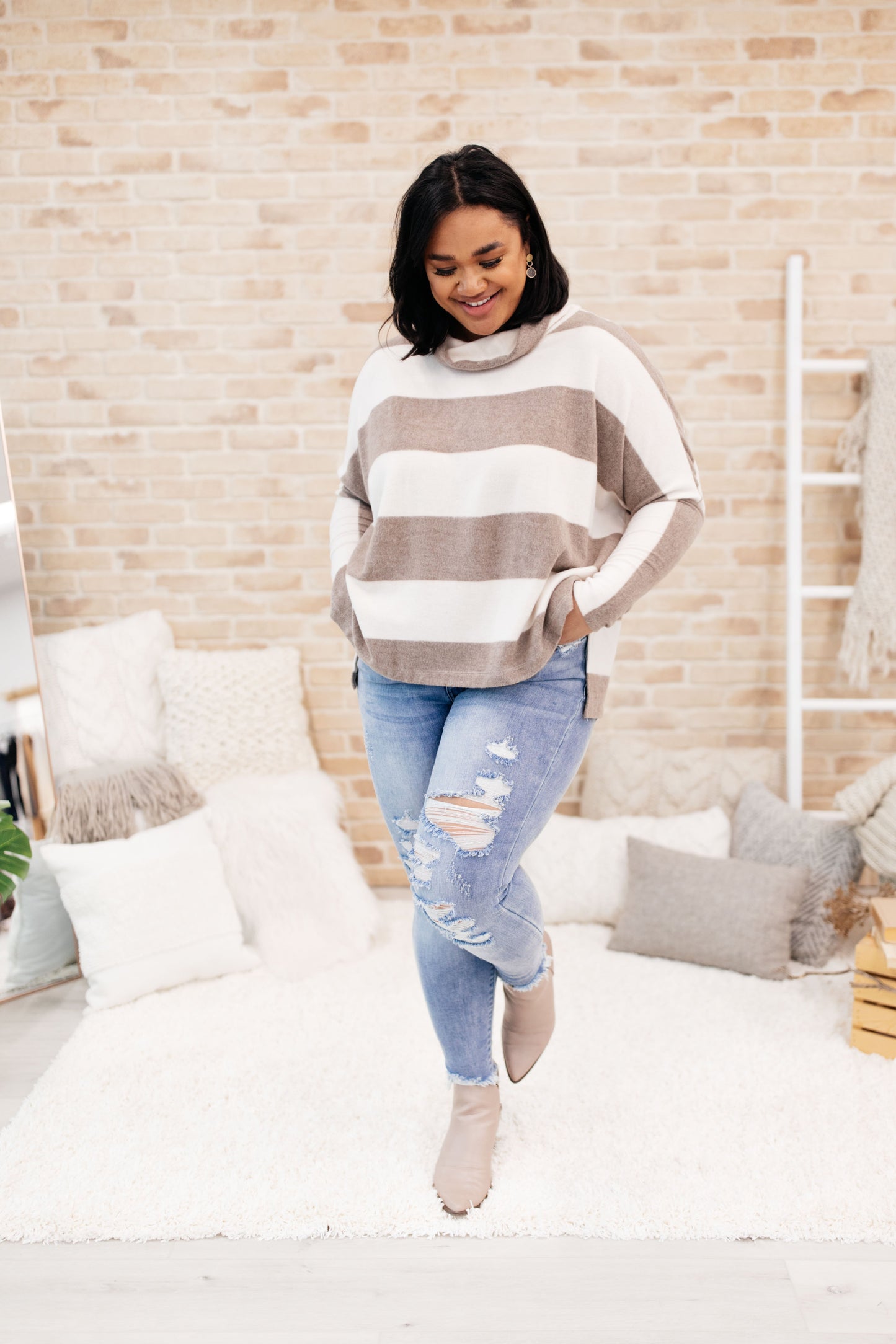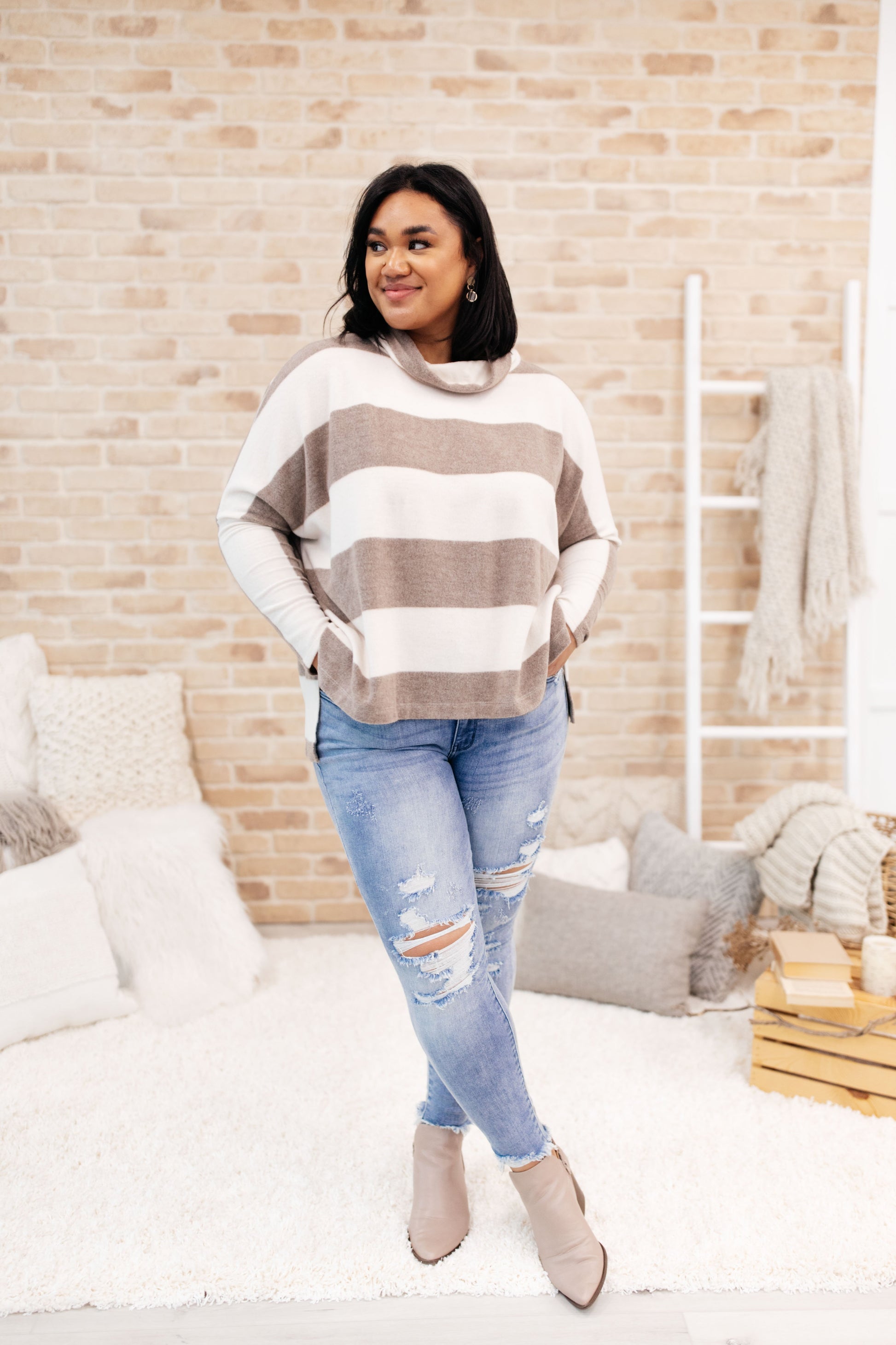 Keywords: Tan Sweater, Cowl Neck, Turtleneck, Sweater, Stripes