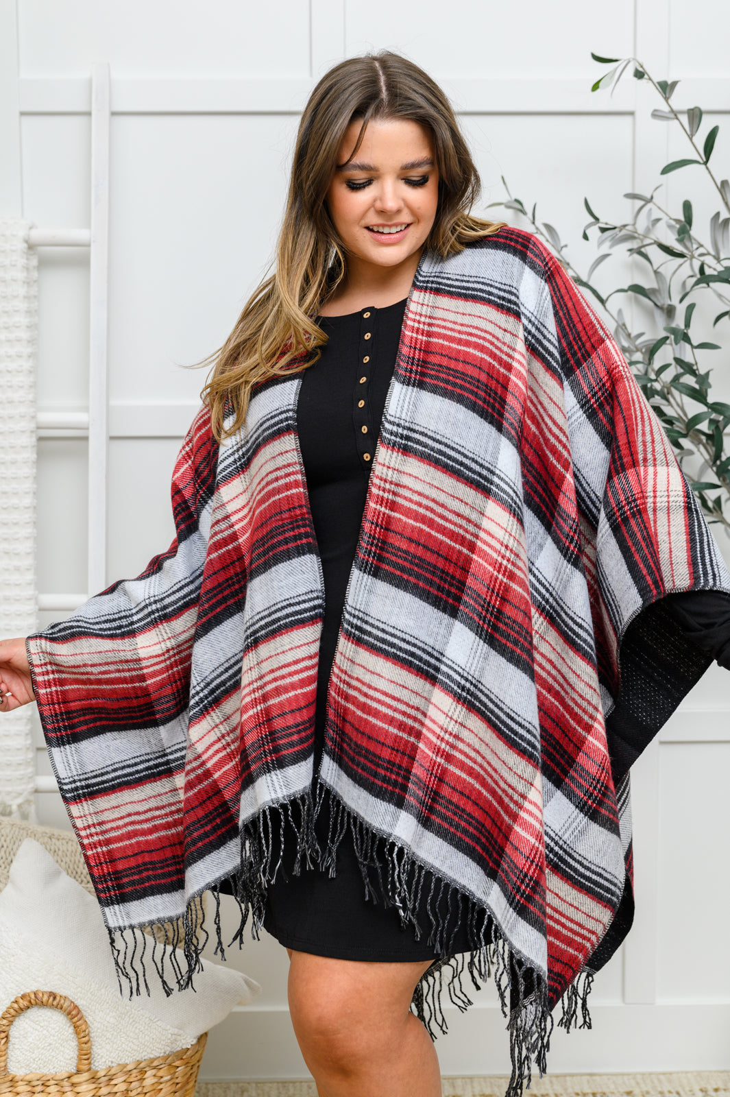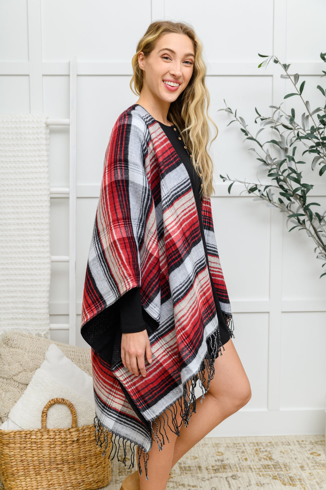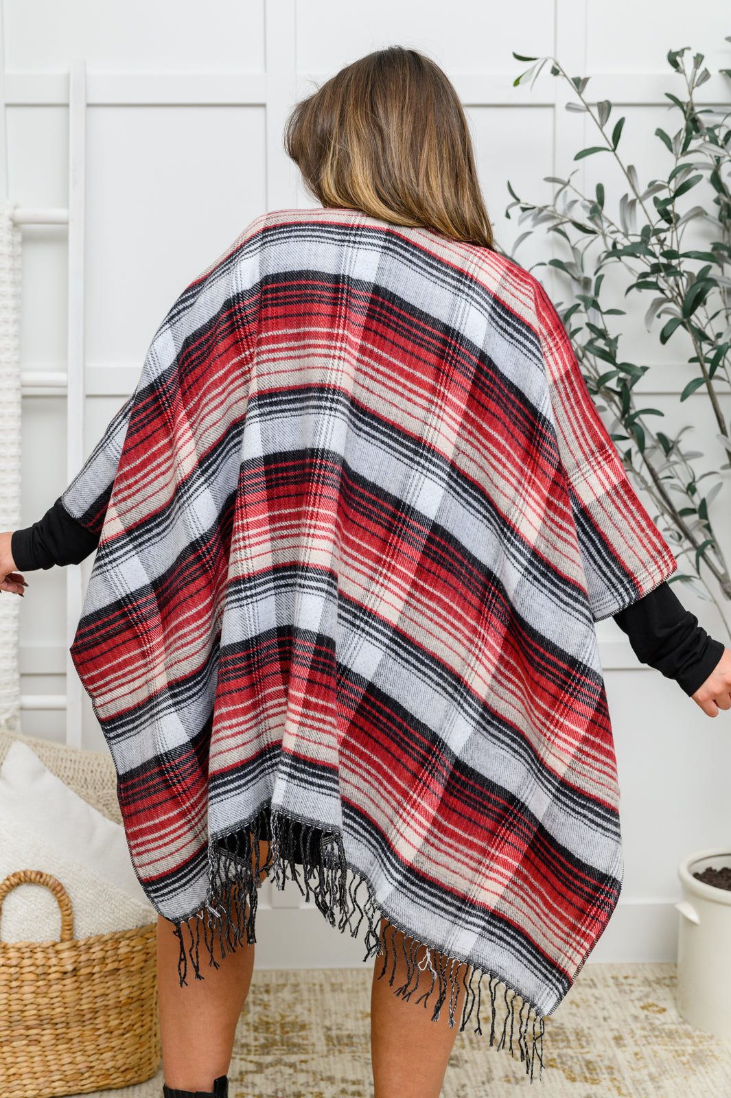 Keywords: Poncho, Plaid, Fringe, Black