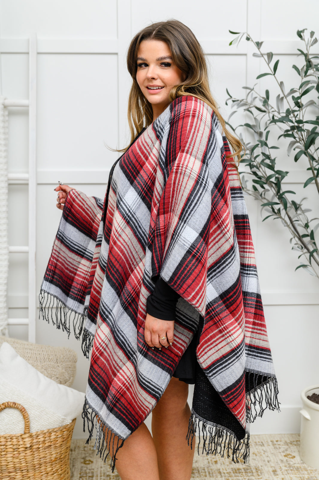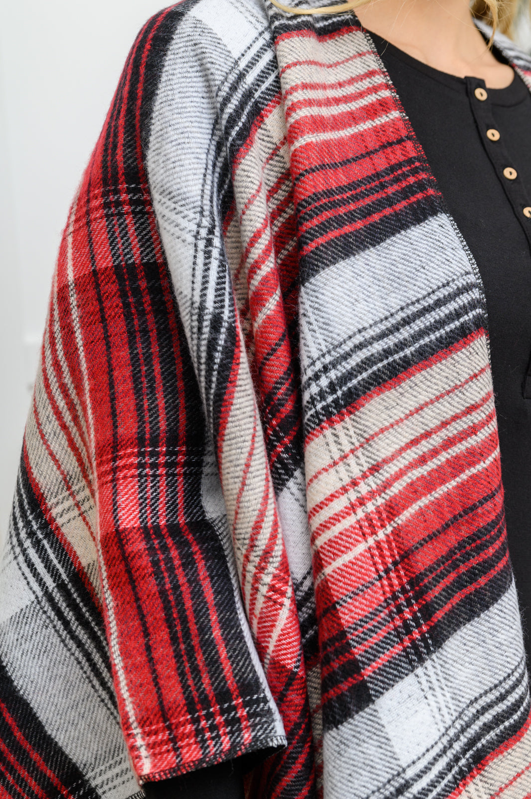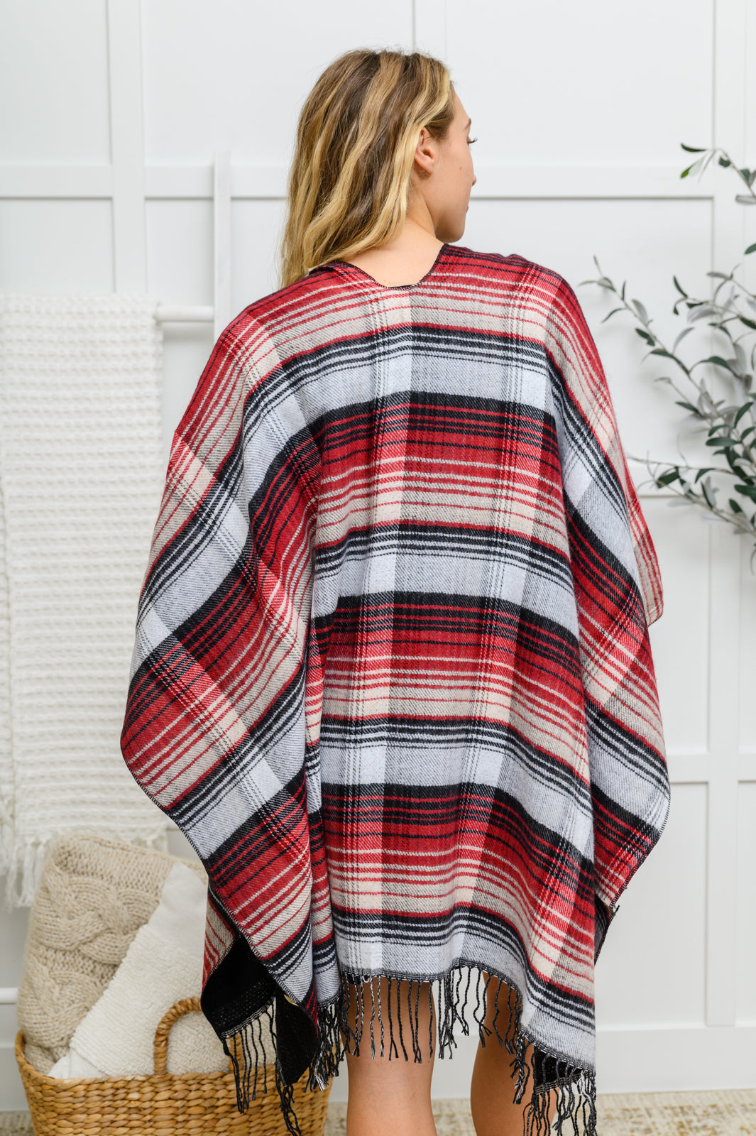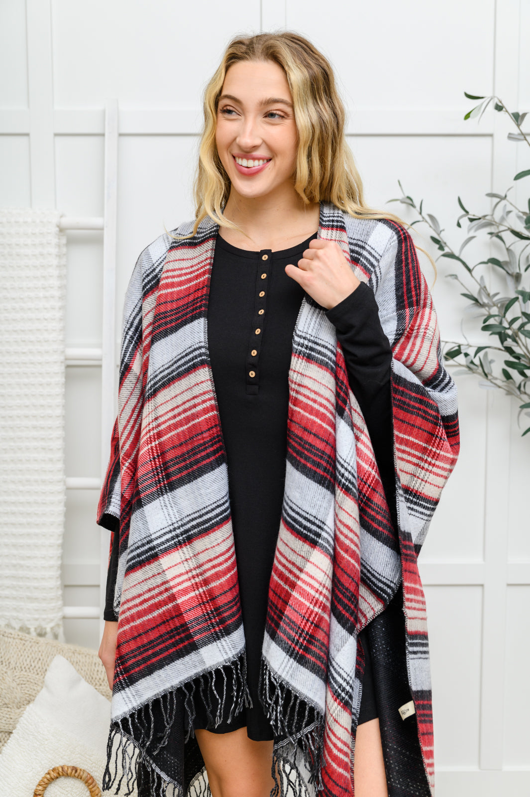 Keywords: Poncho, Plaid, Fringe, Black