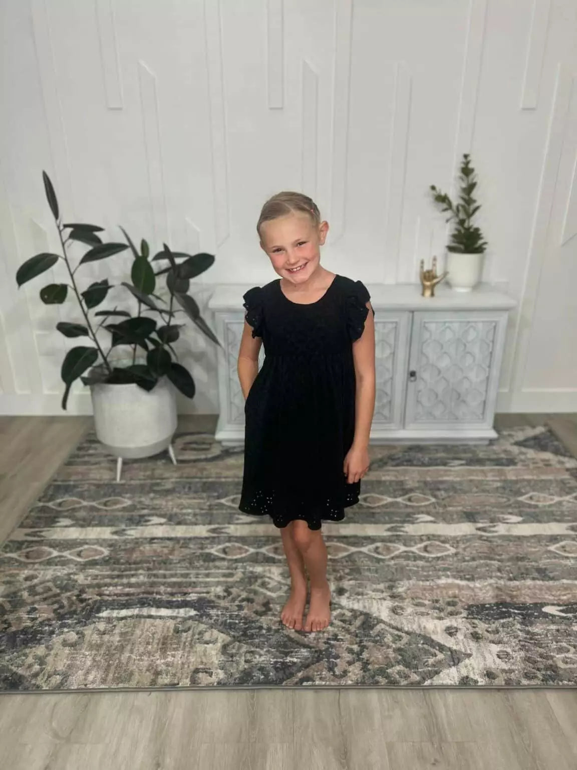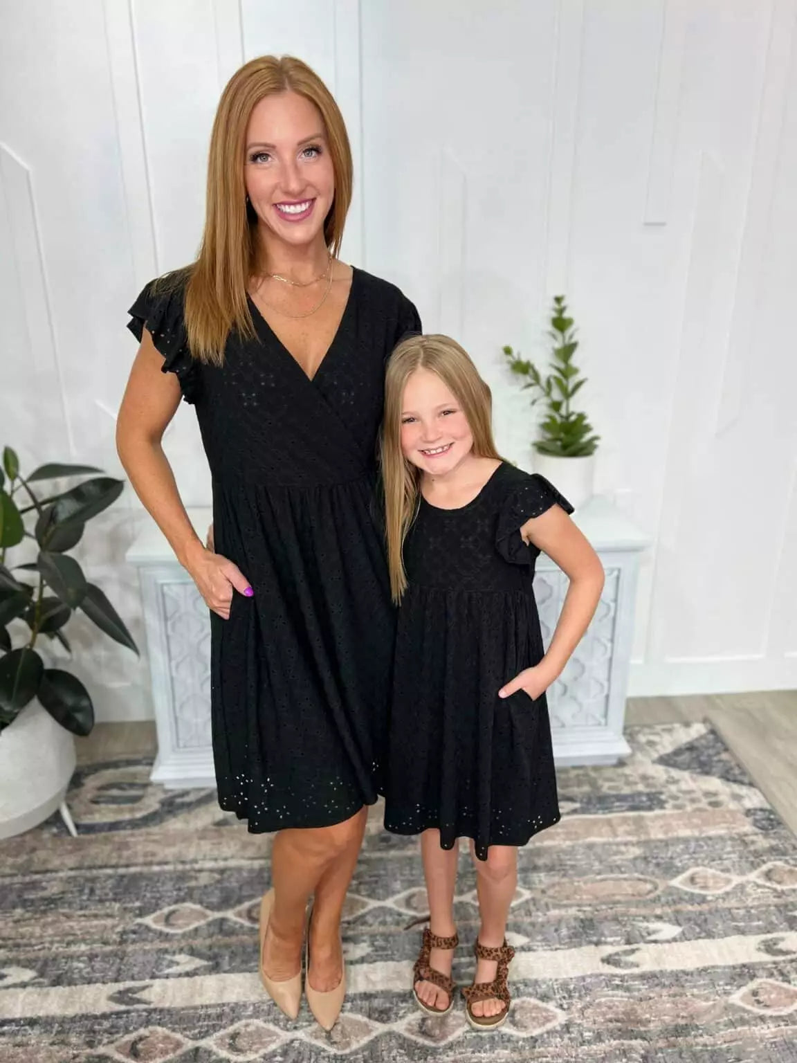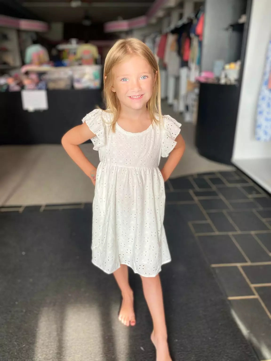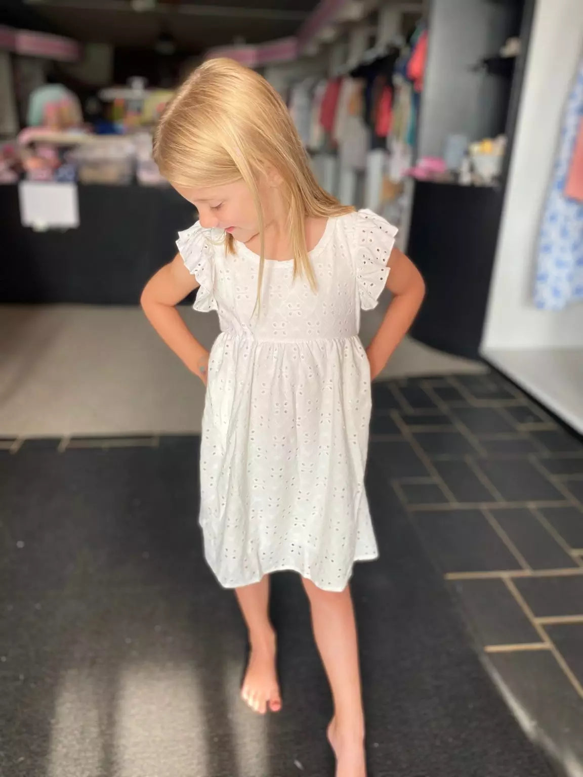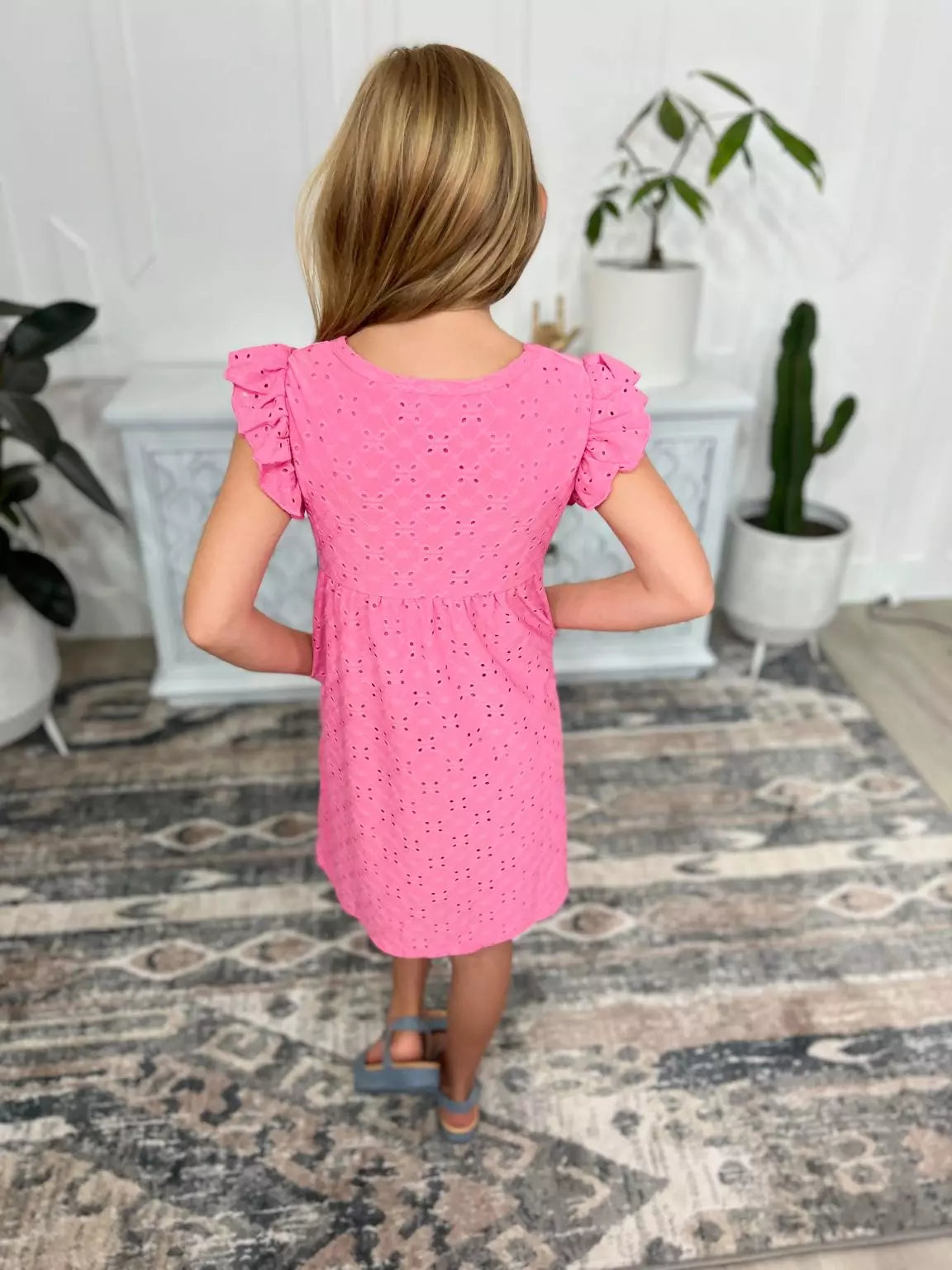 This children's eyelet dress is a perfect match with our Rebecca Ruffle dress! Featuring a cute flutter sleeve and soft, stretchy lining. Available in Lavender, Bright Pink, Black and White.