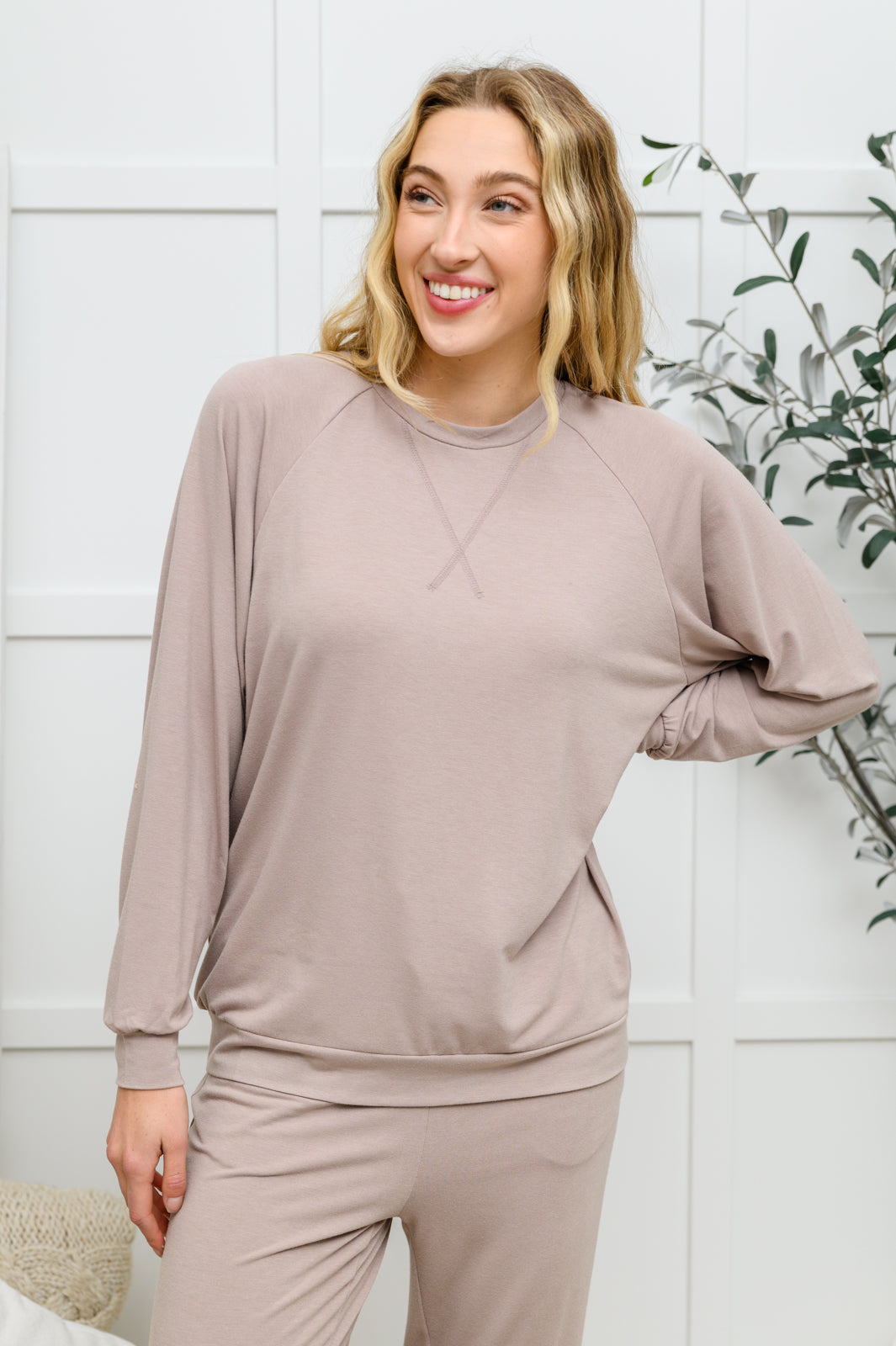 The Raglan Sleeve Pullover & Jogger Set features a lightweight stretchy fabric that shapes a round neckline with raglan long sleeves and a loose fit bodice. Comfy joggers feature an elasticated high waist complete with a functional drawstring and side pockets. Tapered, ankle length pant legs.