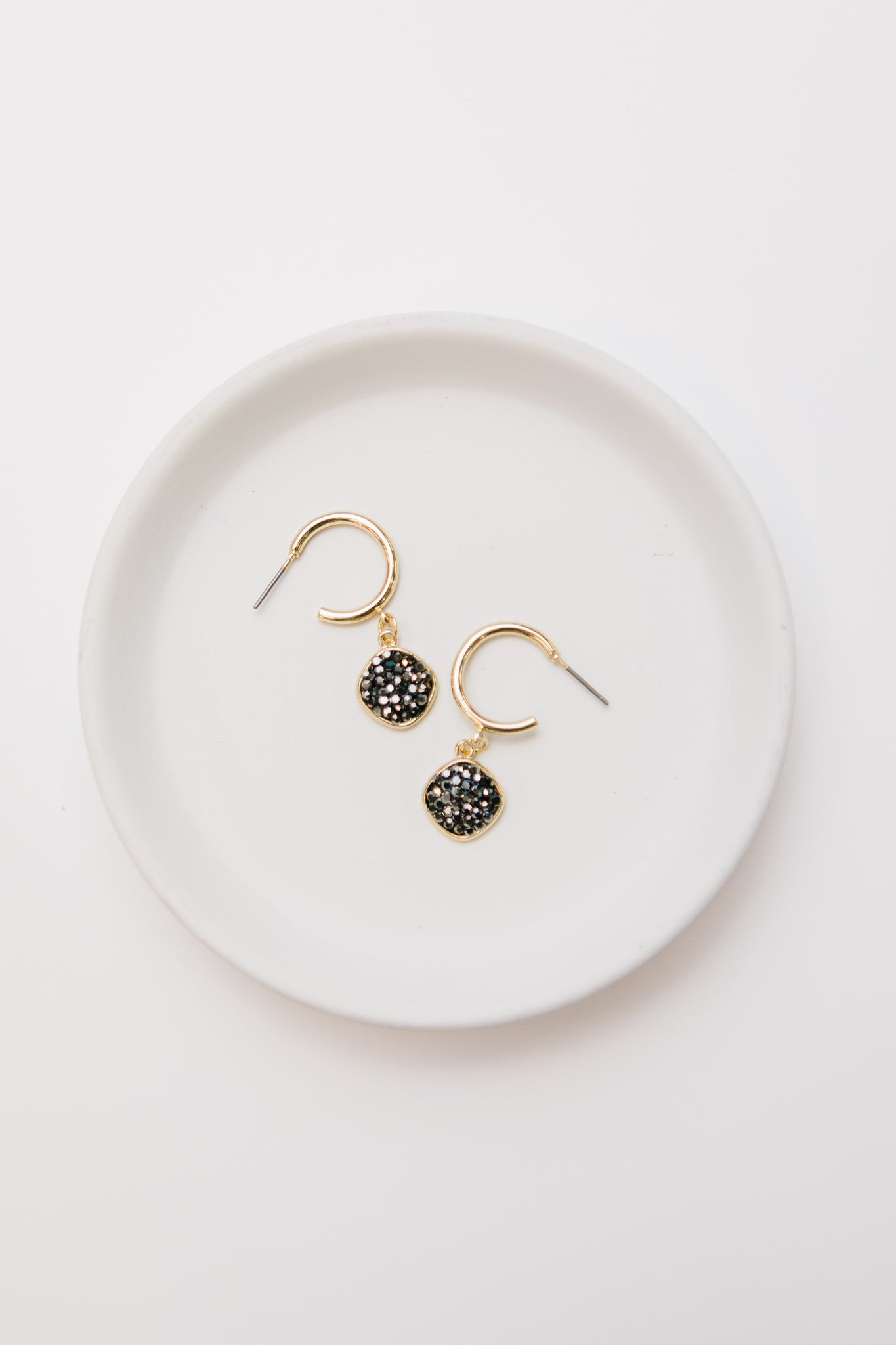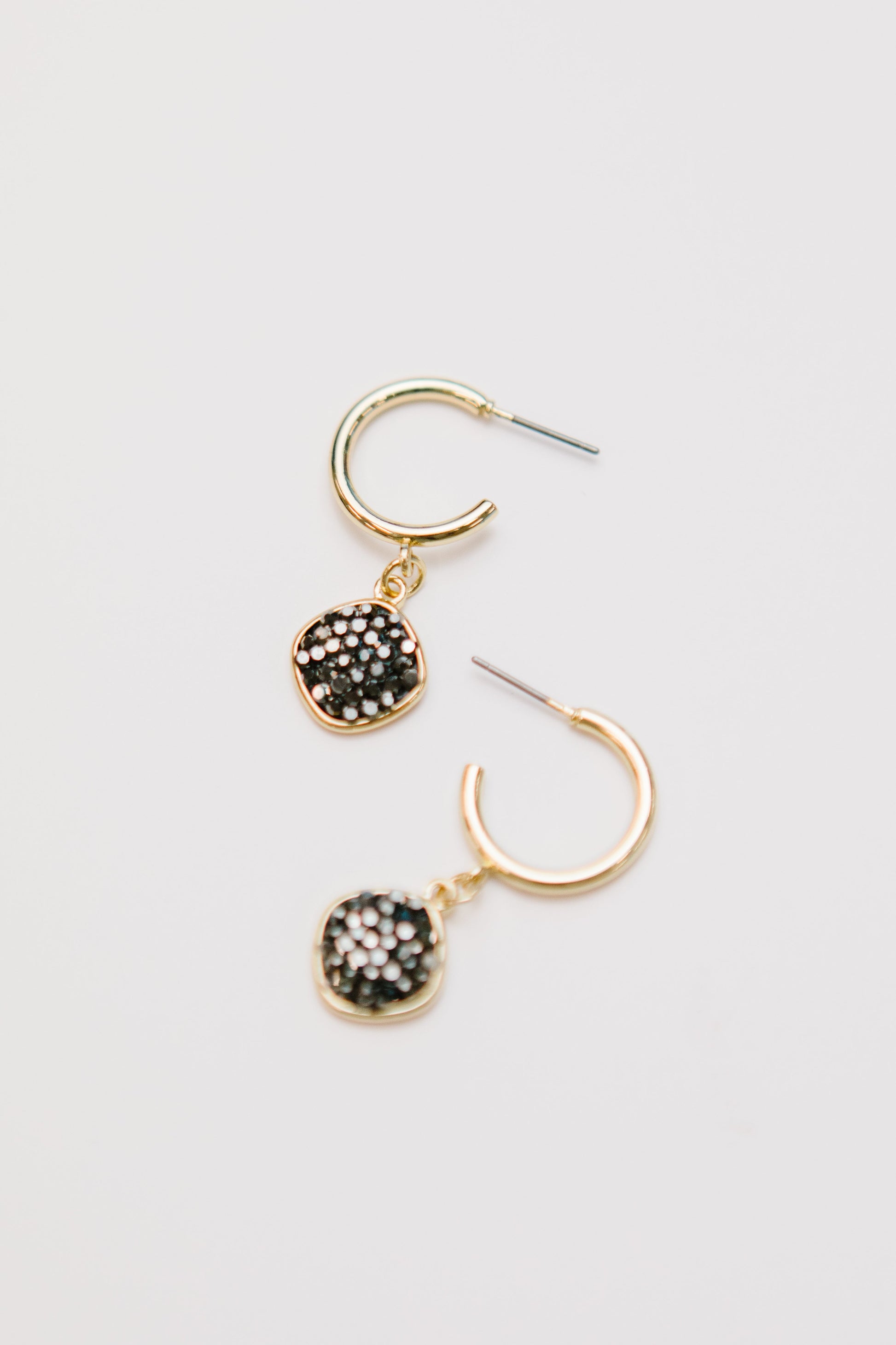 Our Rhinestone Pendant Huggies will quickly become your new go-to's. A chic gold hoop with a gray rhinestone charm shapes these stunning earrings. Pair these with a chic outfit and complete your head to toe look.