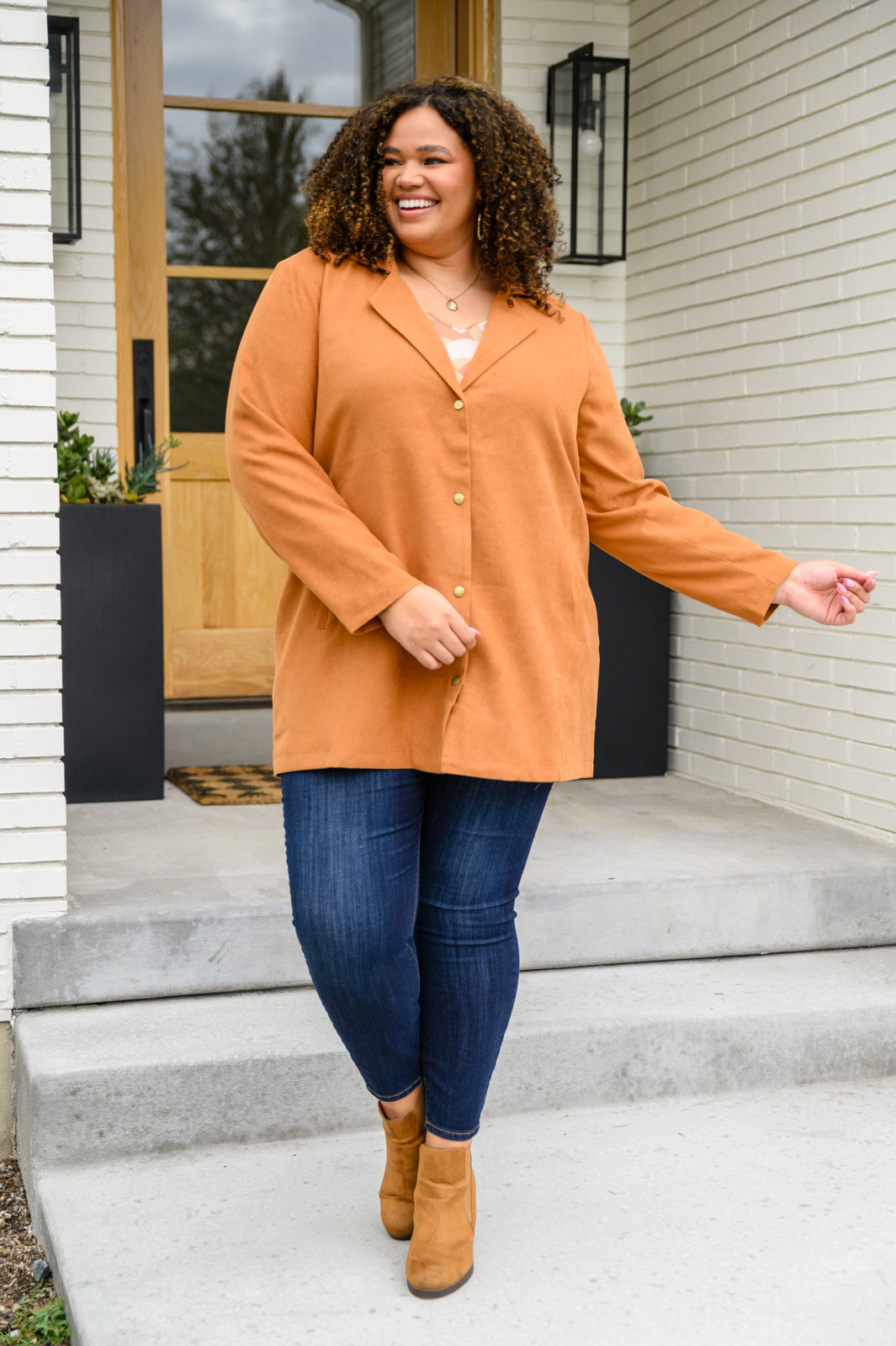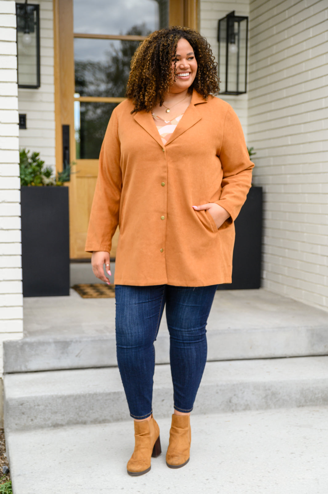 Perfect your Fall fit with the She's On Point Collared Coat In Rust! This amazing coat features a notched lapel collared front with a snap button closure, two side pockets, and a length that hits below the hips. We are so excited thinking about all the outfits we're going to wear with this amazing coat!
