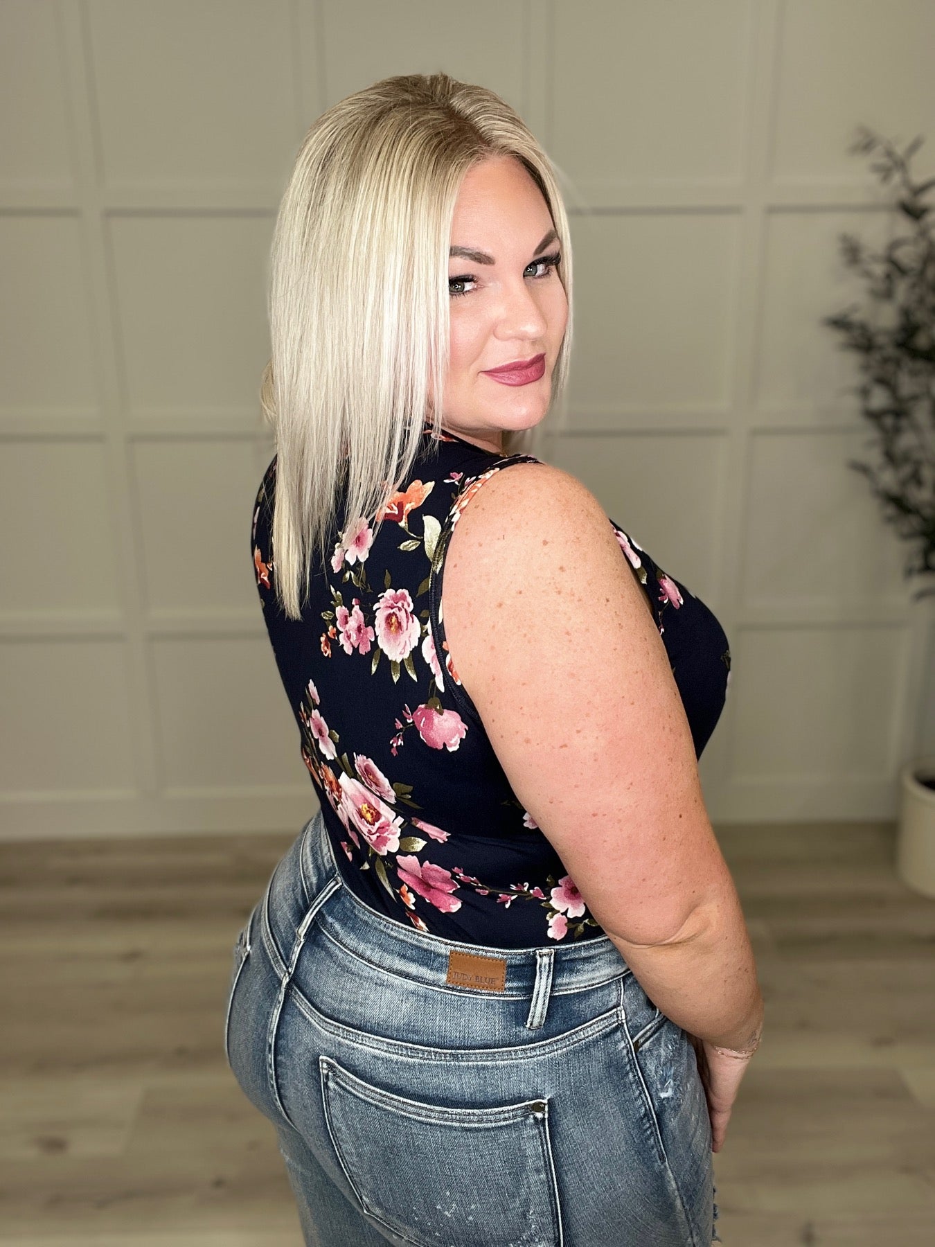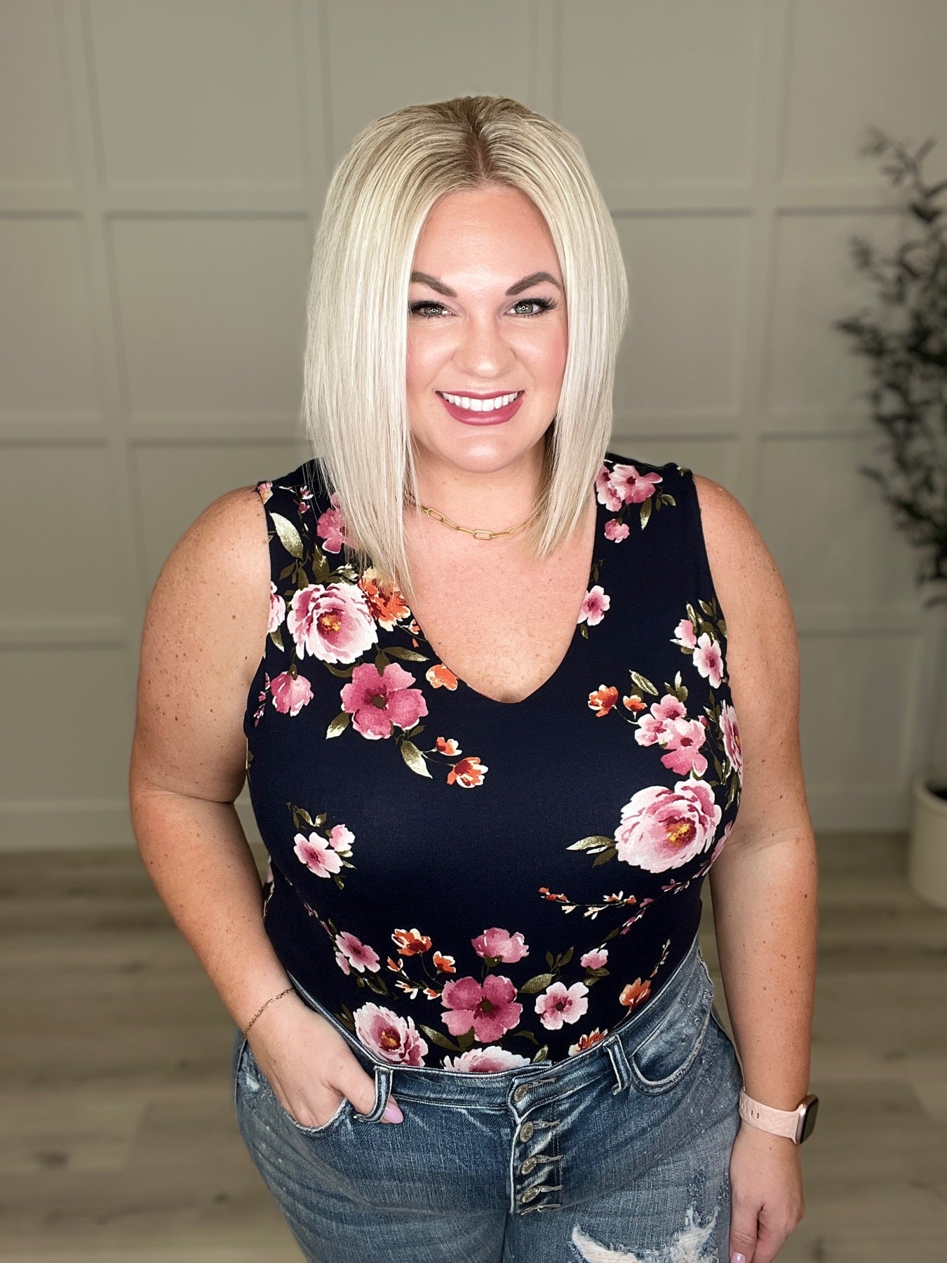 Sleeveless Floral V-Neck Bodysuit in Navy