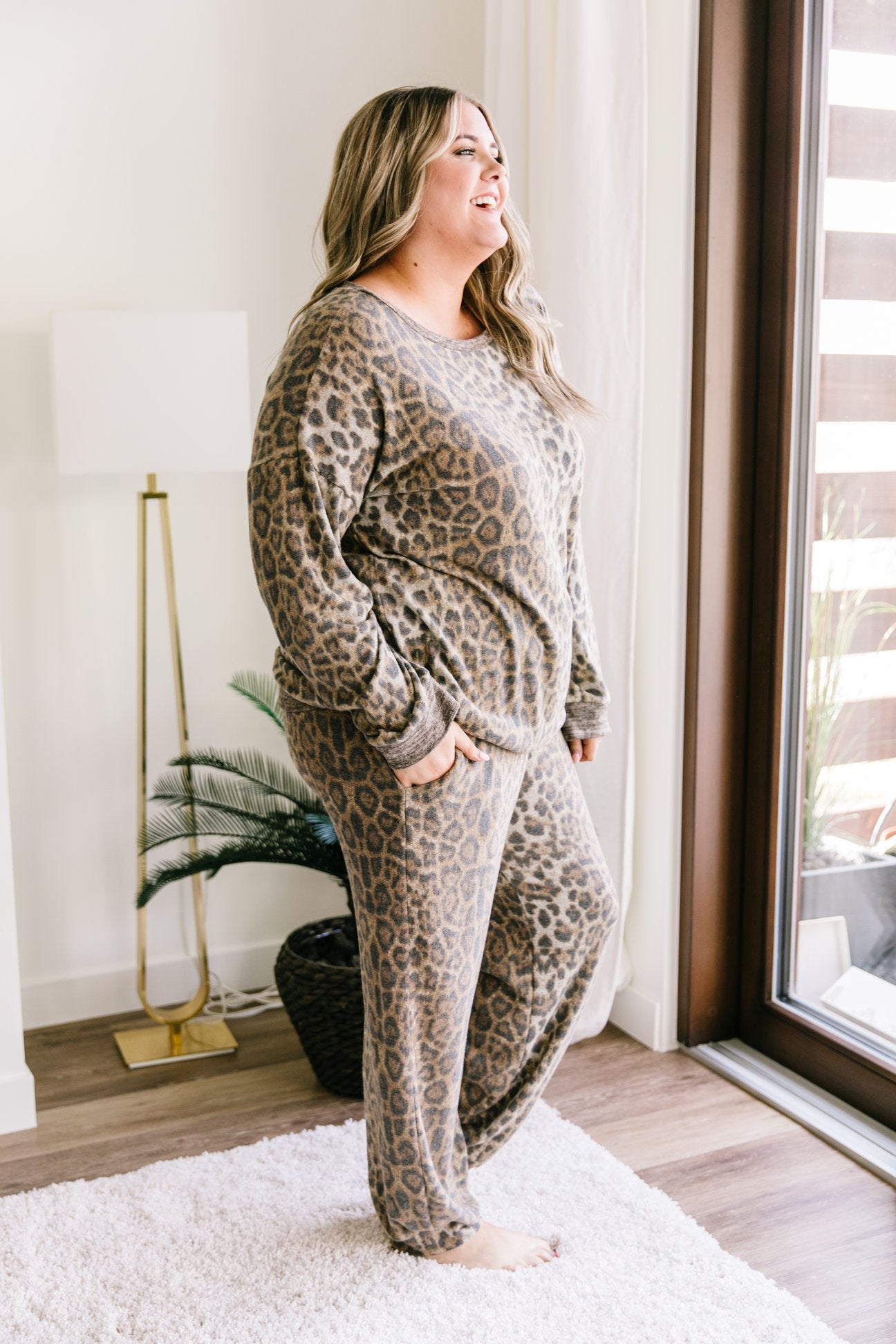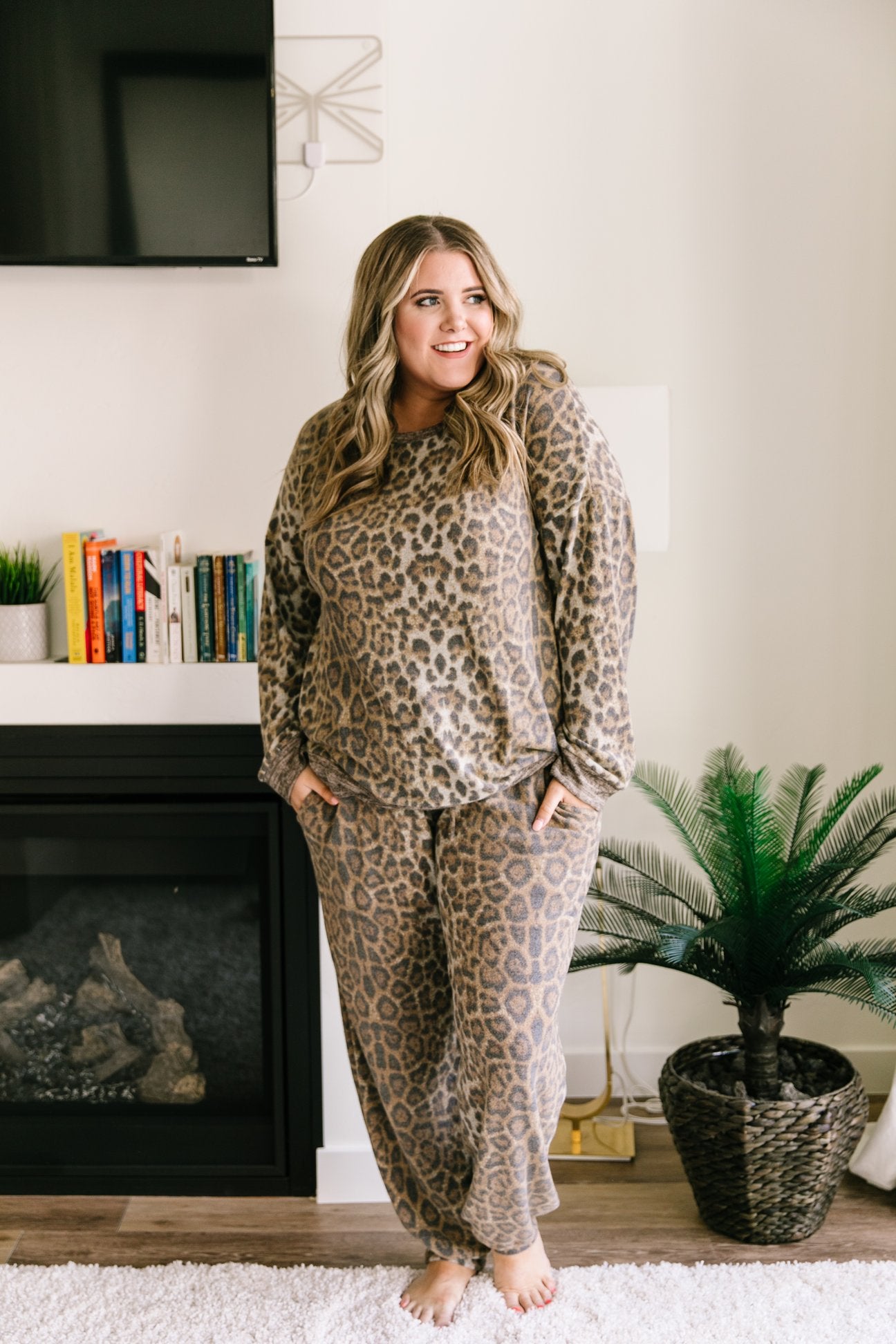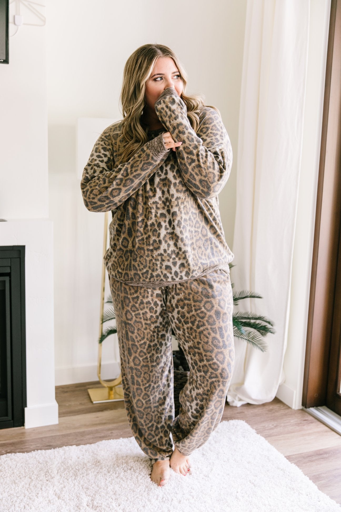 Leopard print is one of this seasons hottest trends, and I'm gaga over this luxuriously soft leopard print top in natural earth tones. How adorable would it be paired with your favorite jeans or our matching Soft Spot Joggers? It's made from brushed knit which essentially means that it is super soft and you'll never want to take it off. It's got contrasting marled knit at the cuffs, hem, and neckline.