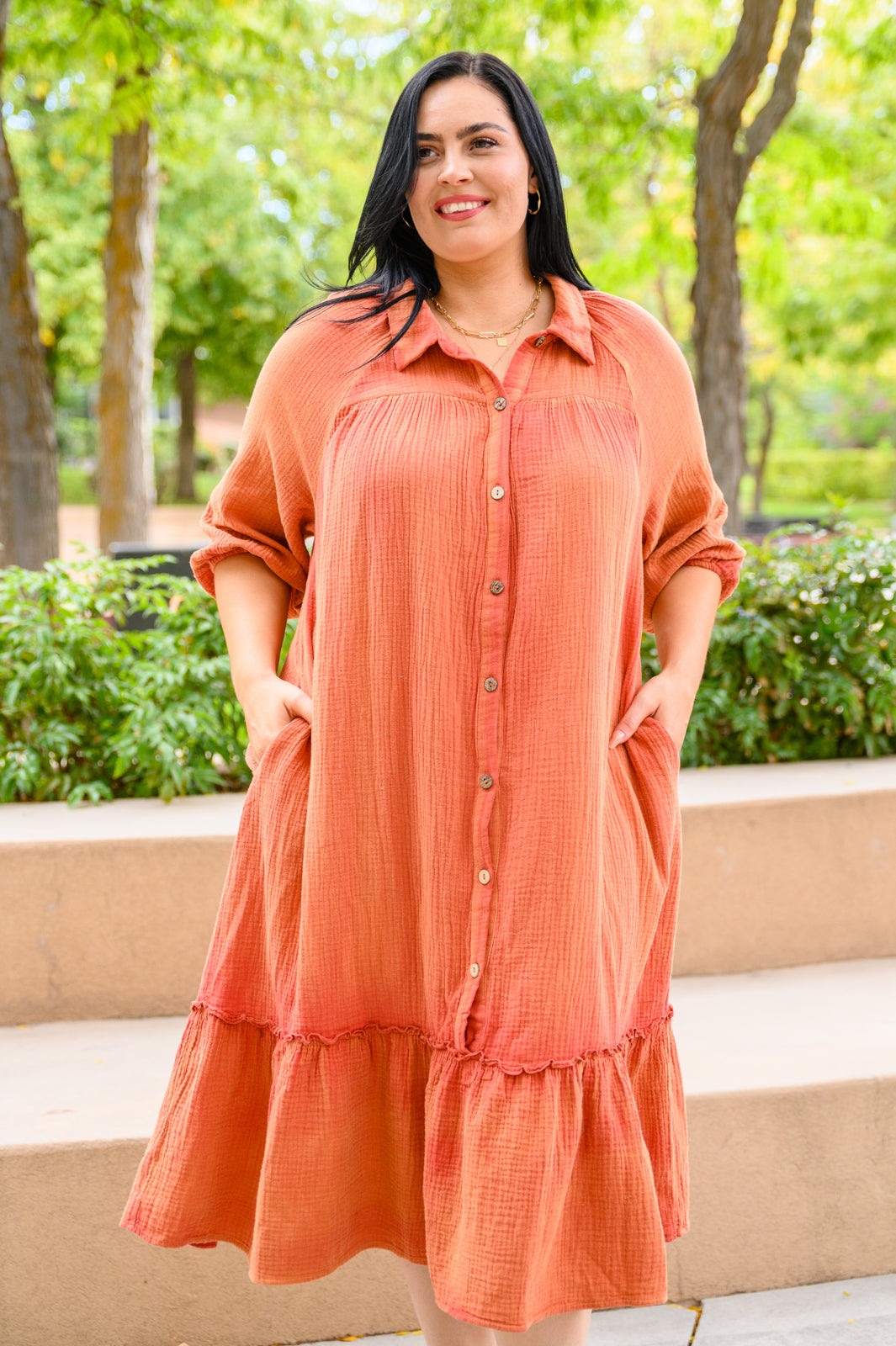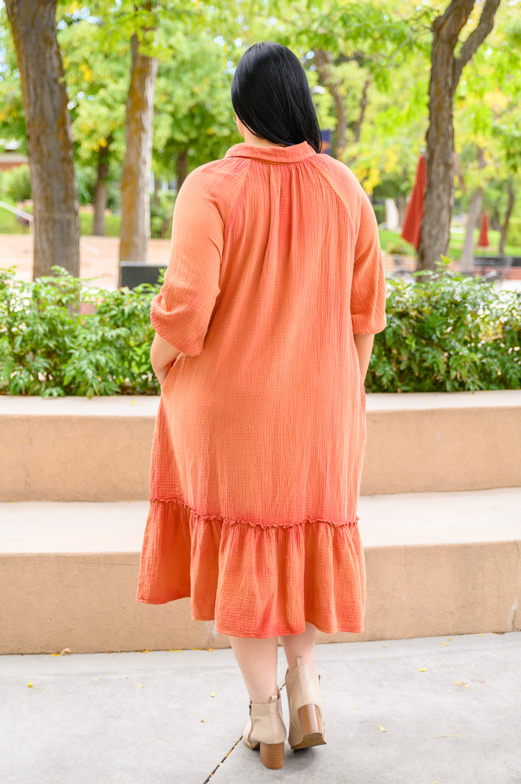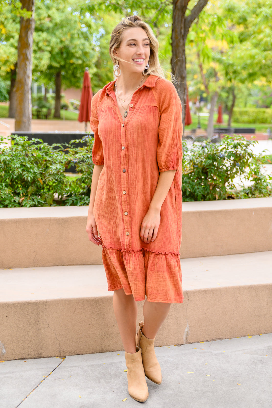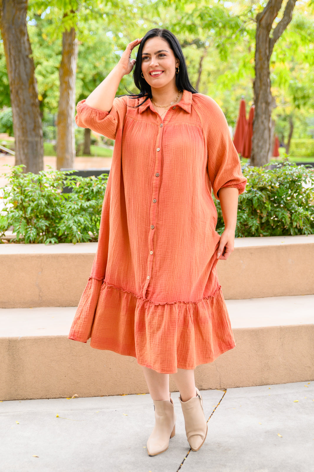 We can't get the Stuck With You Vintage Overdye Dress In Rust out of our minds! This essential midi dress features a collared neckline with button front that ends at a ruffle hemline and three quarter sleeves with elastic cuff. The over dyed, vintage inspired orange is the perfect choice for the season!