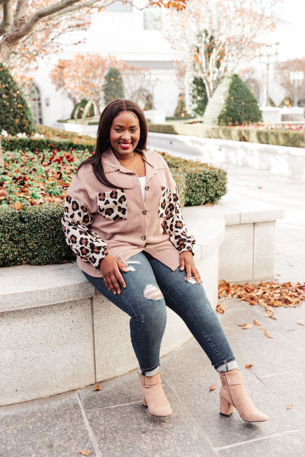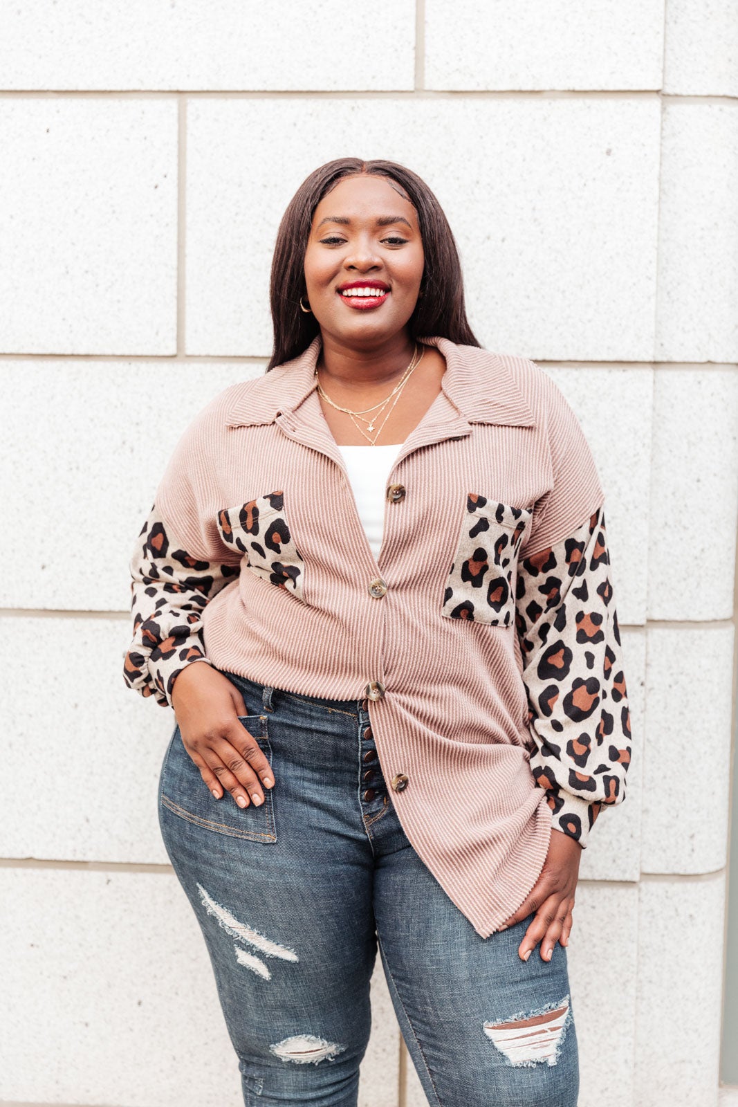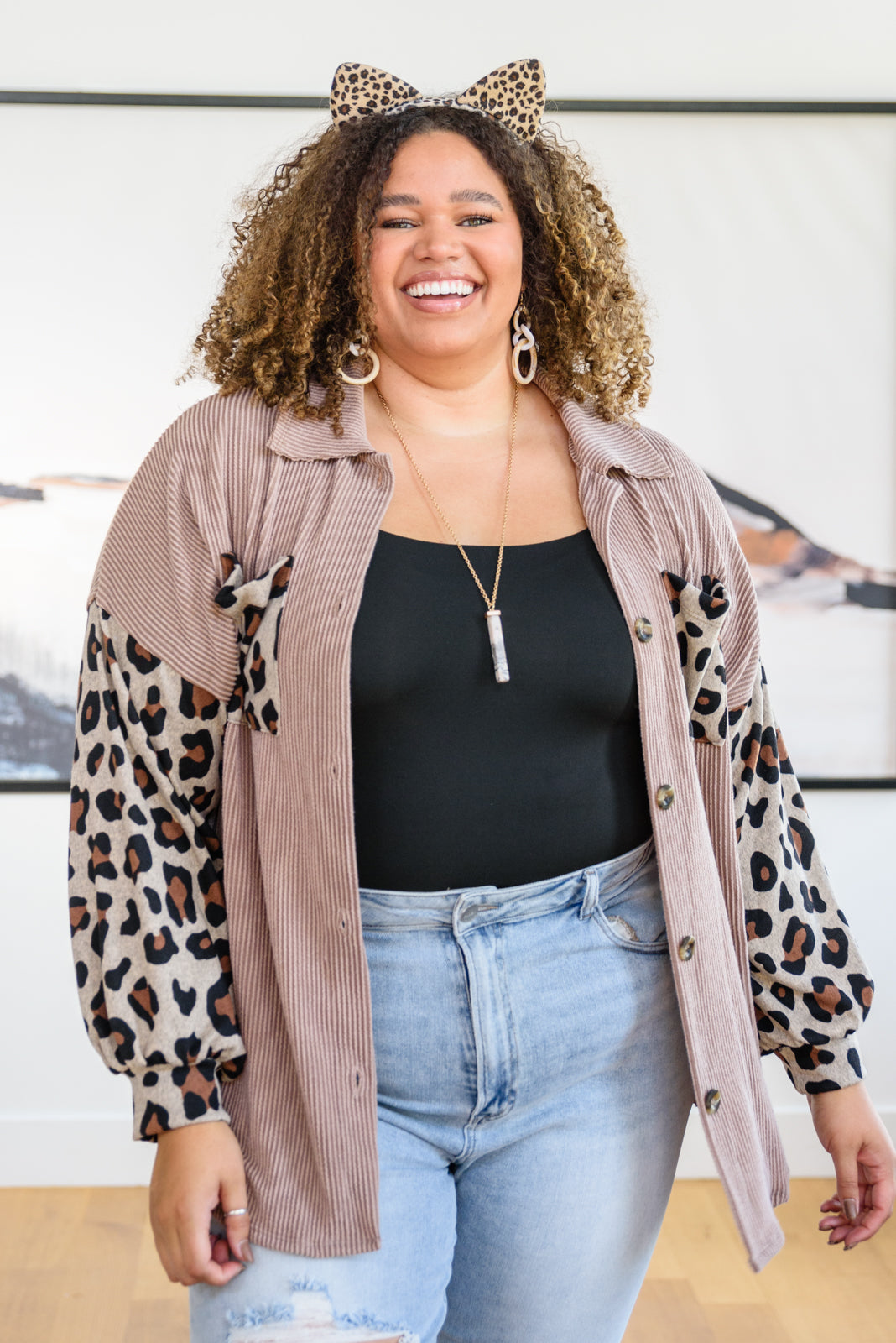 You'll look purrr-fectly chic in the Take On Me Shacket! This beautiful layering piece has a classy animal print sleeve with a ribbed knit body. It'll look beautiful over a bodysuit and jeans!