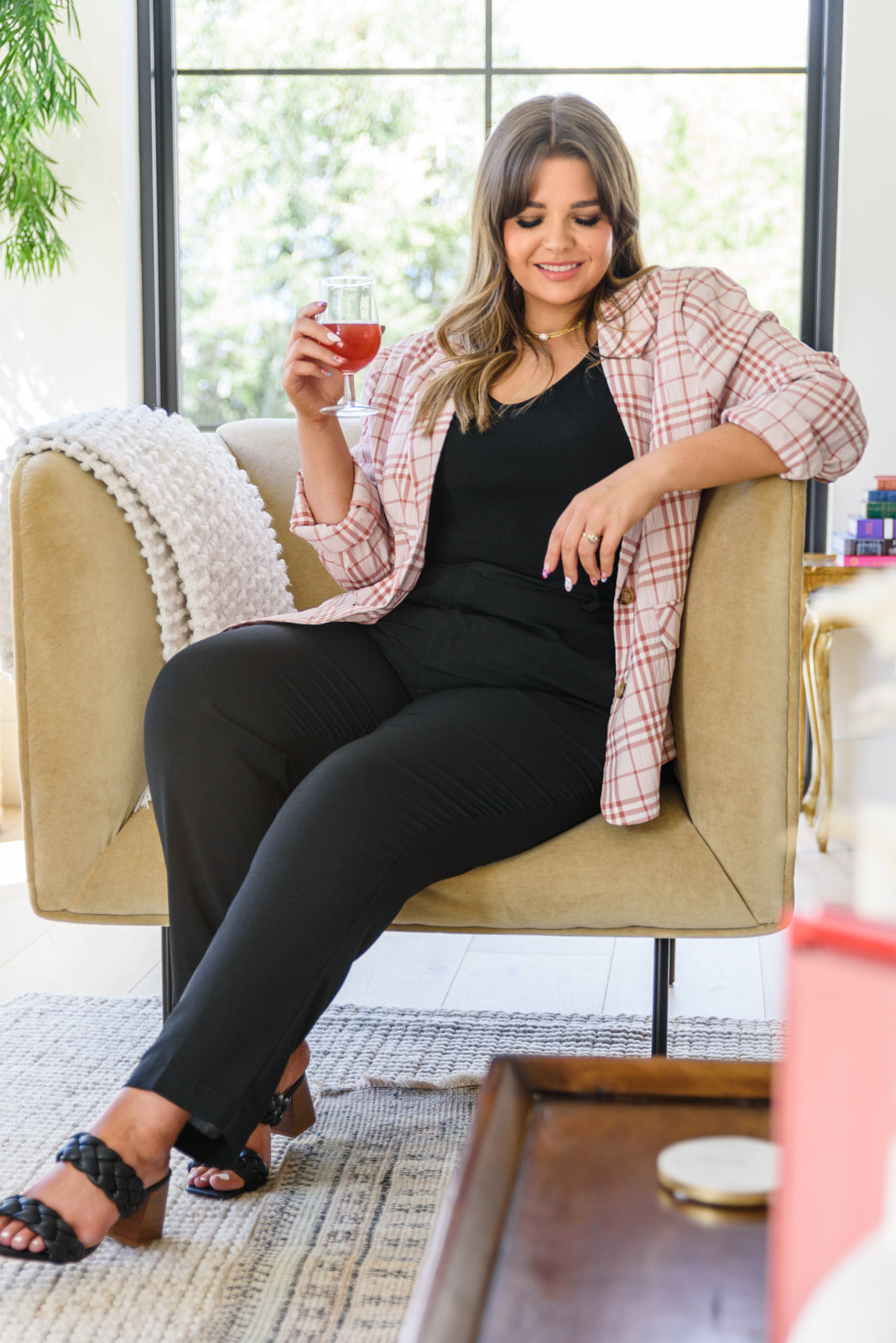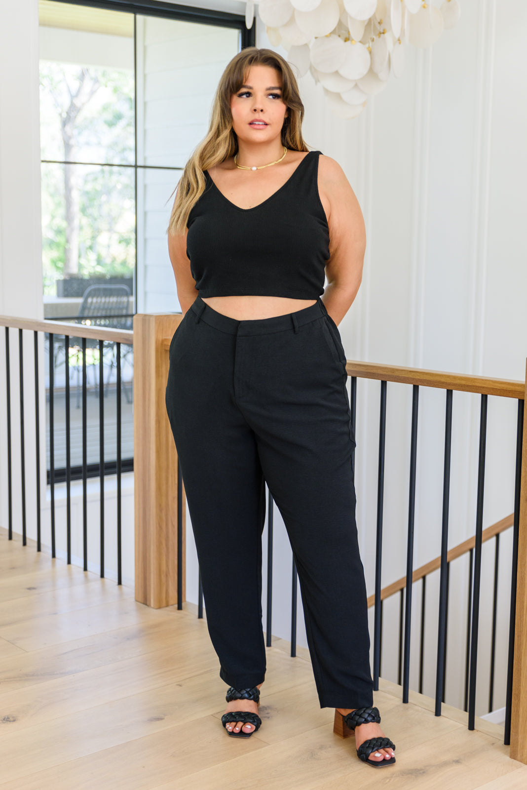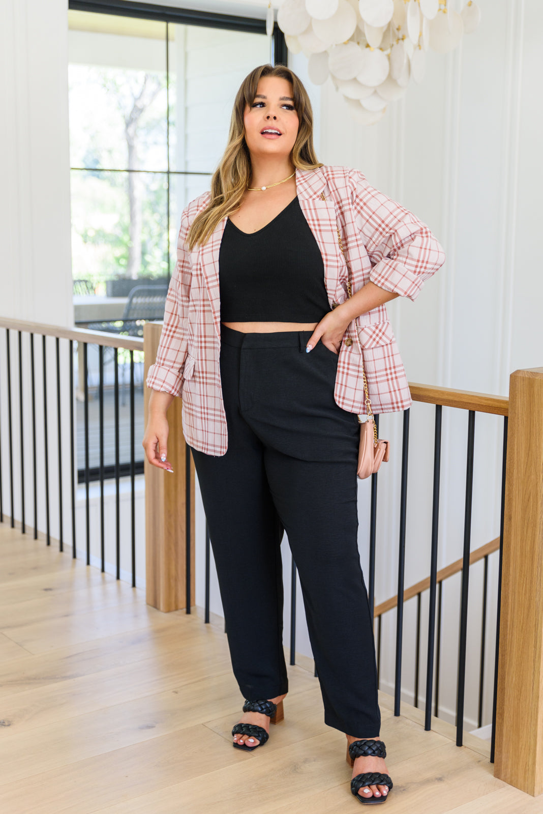 Dress for absolute success in the Team Meeting Slacks! The moment you slide these perfect slacks on you'll instantly fall in love! Featuring a high waistline with elastic at the back, cropped length, slightly tapered leg with side pockets, back pockets, and front zip with metal hook closure.