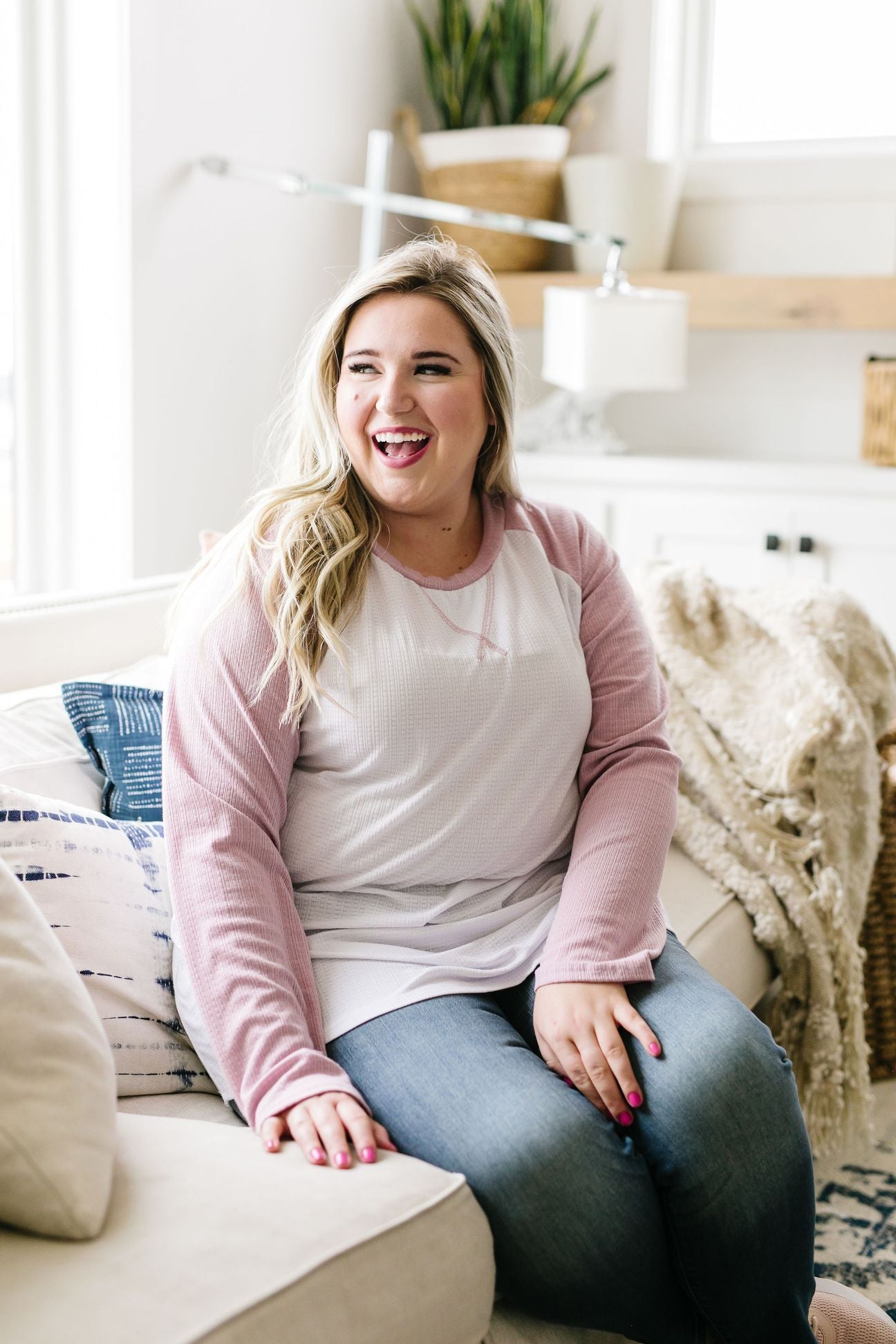 Lemon yellow, sky blue, and lilac are such happy bright colors! They make me want to chase butterflies, fly a kite, or dye Easter eggs. This long-sleeved raglan tee is made from textured pointelle knit. It has a bright white body and sleeves in one of the lovely aforementioned colors. A matching pastel V is topstitched just below the round neckline, and the curved hem is quite flattering. Now all you have to decide is which color makes you the happiest.