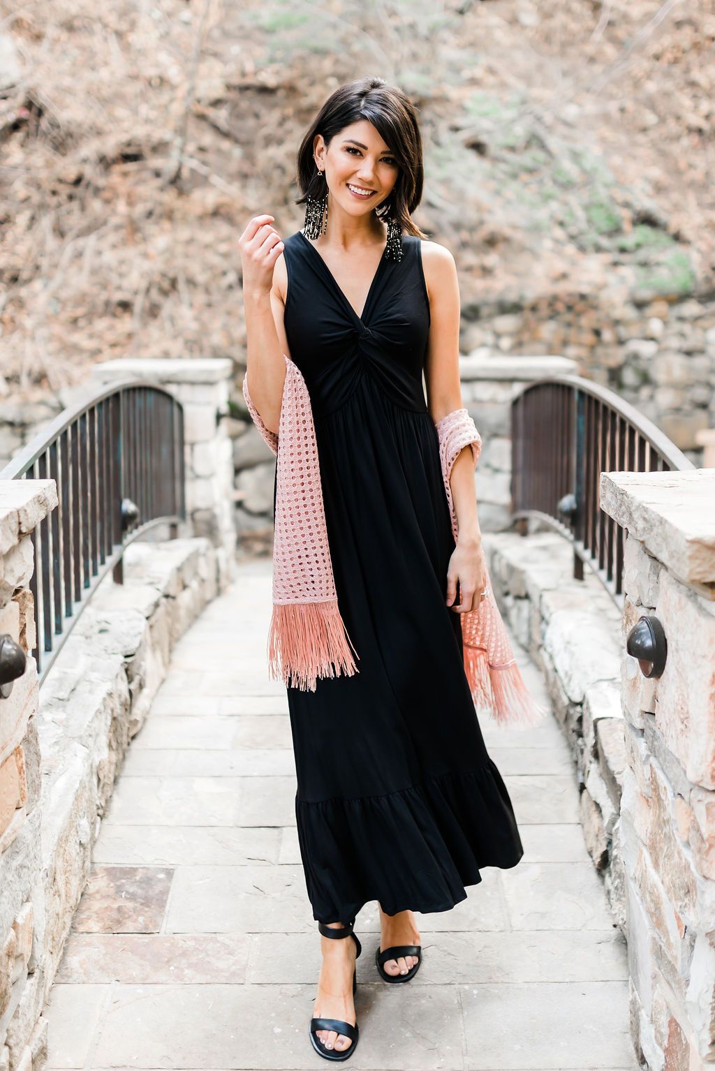 The versatility of this elegant black maxi dress can't be emphasized enough! Let me walk you through a year in this dress. From a kiss at midnight, paired with a sequined scarf, to a stroll on the beach, thrown over your swimsuit, to a holiday office party, worn with a velvet blazer....this black beauty can do it all and can be worn every month of the year! It's got a flattering v-neckline, a twisty knot in the bodice, and a wide ruffle at the hem.