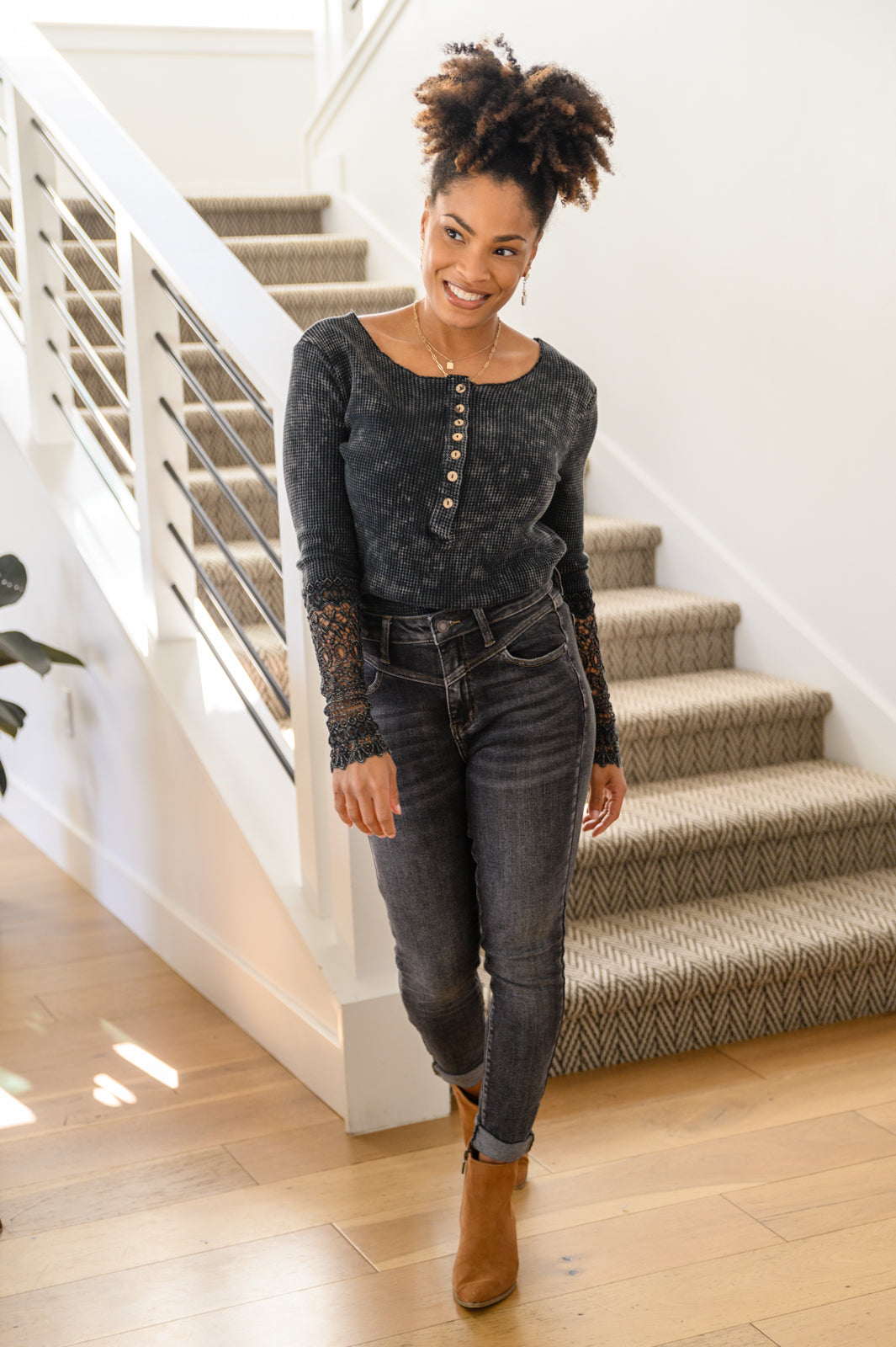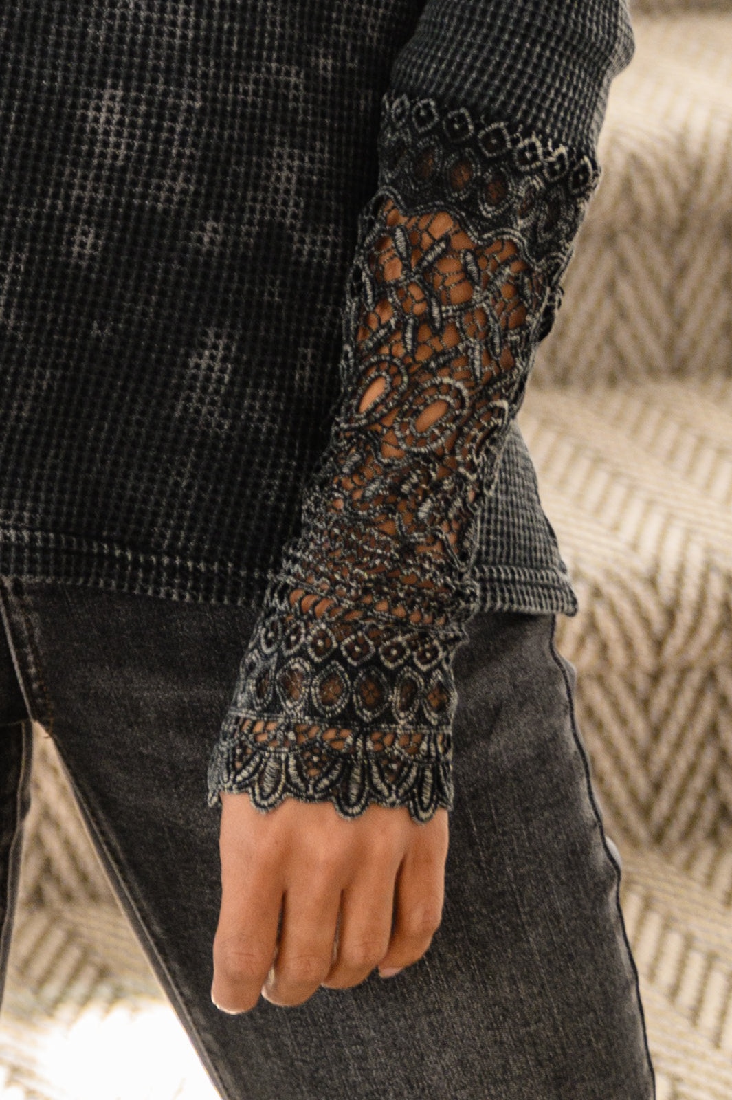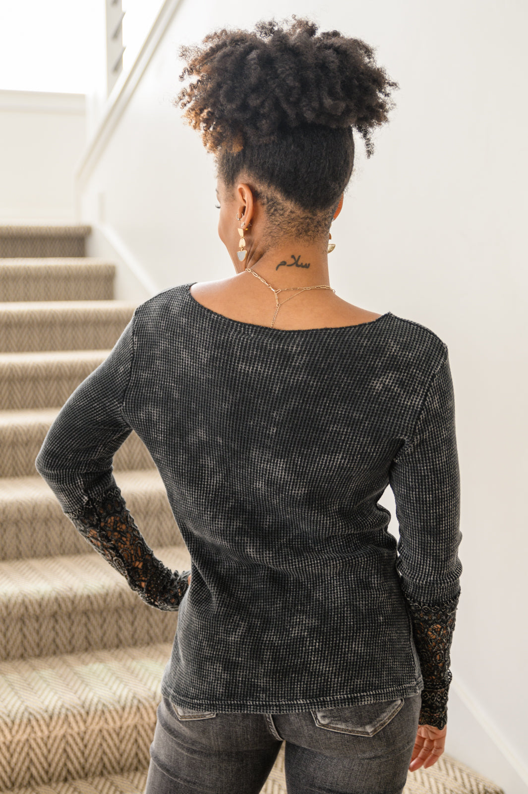 Your closet just got a much needed upgrade with the With My Bestie Washed Thermal Henley! Lightweight washed thermal knit shapes a wide neckline with functional henley design. Long sleeves with contrasting lace cuffs and a slight a-line silhouette create a fashionable look you'll love.